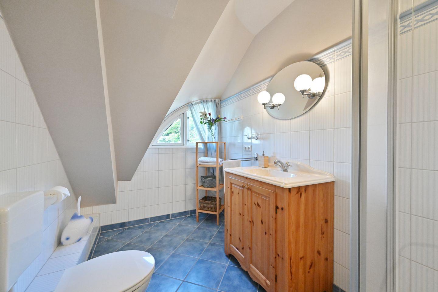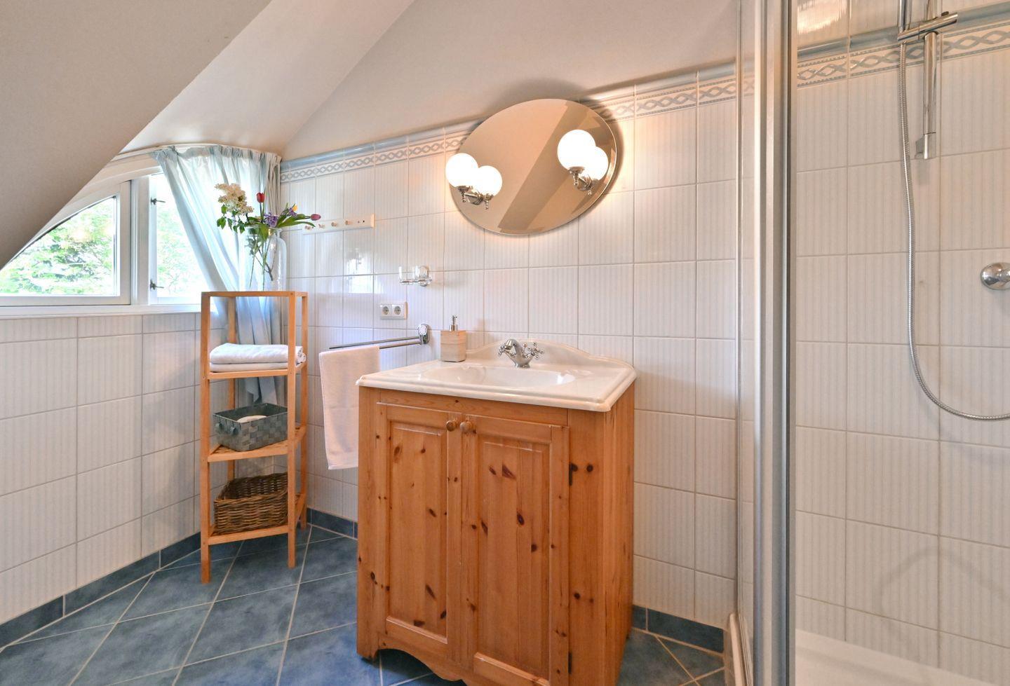 Das Bad im Obergeschoß verfügt über eine Dusche und Haartrockner und hat ein Fenster. Im Schlafzimmer gibt es ein Doppelbett.