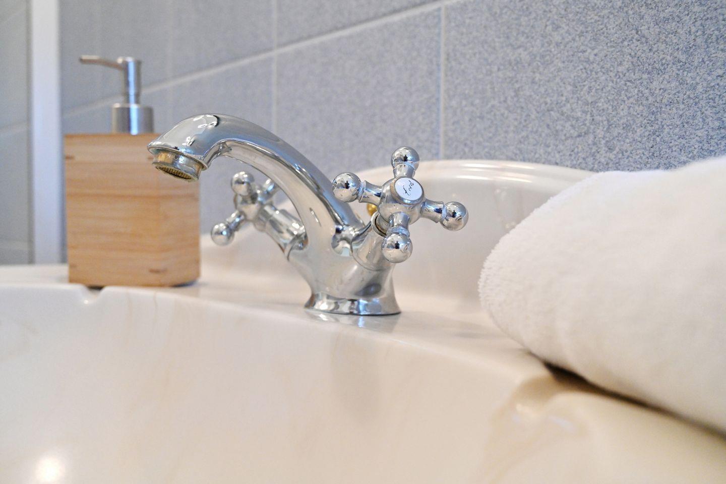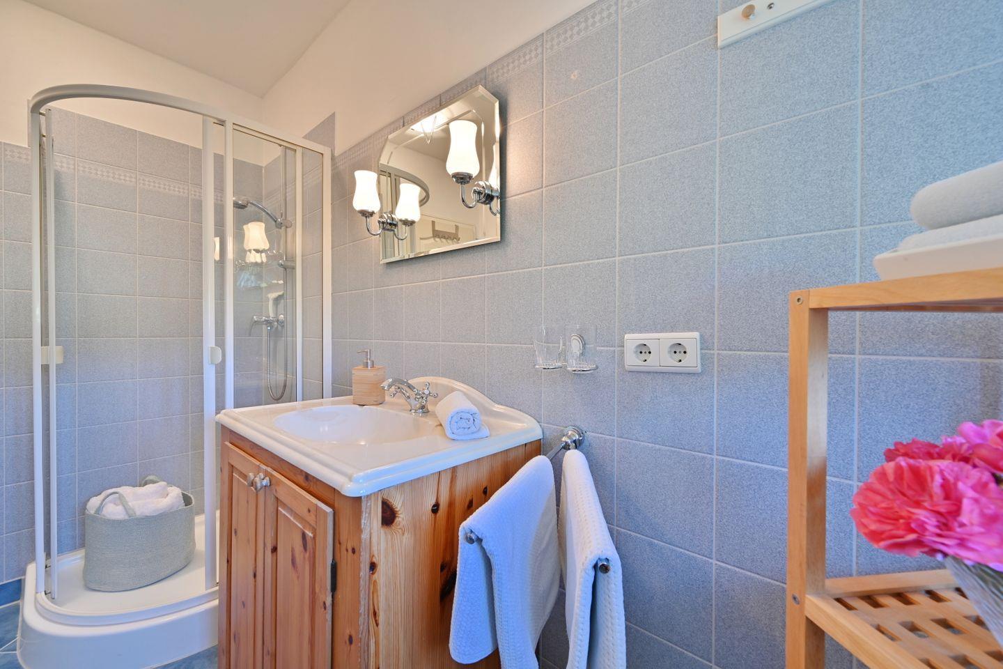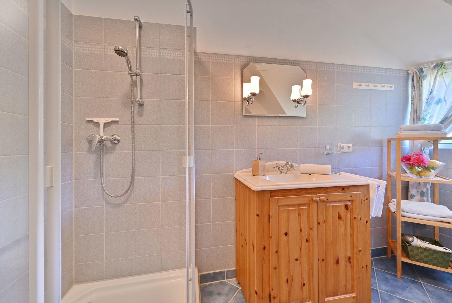Das Bad im Obergeschoß verfügt über eine Dusche und Haartrockner und hat ein Fenster. Im Schlafzimmer gibt es ein Doppelbett.