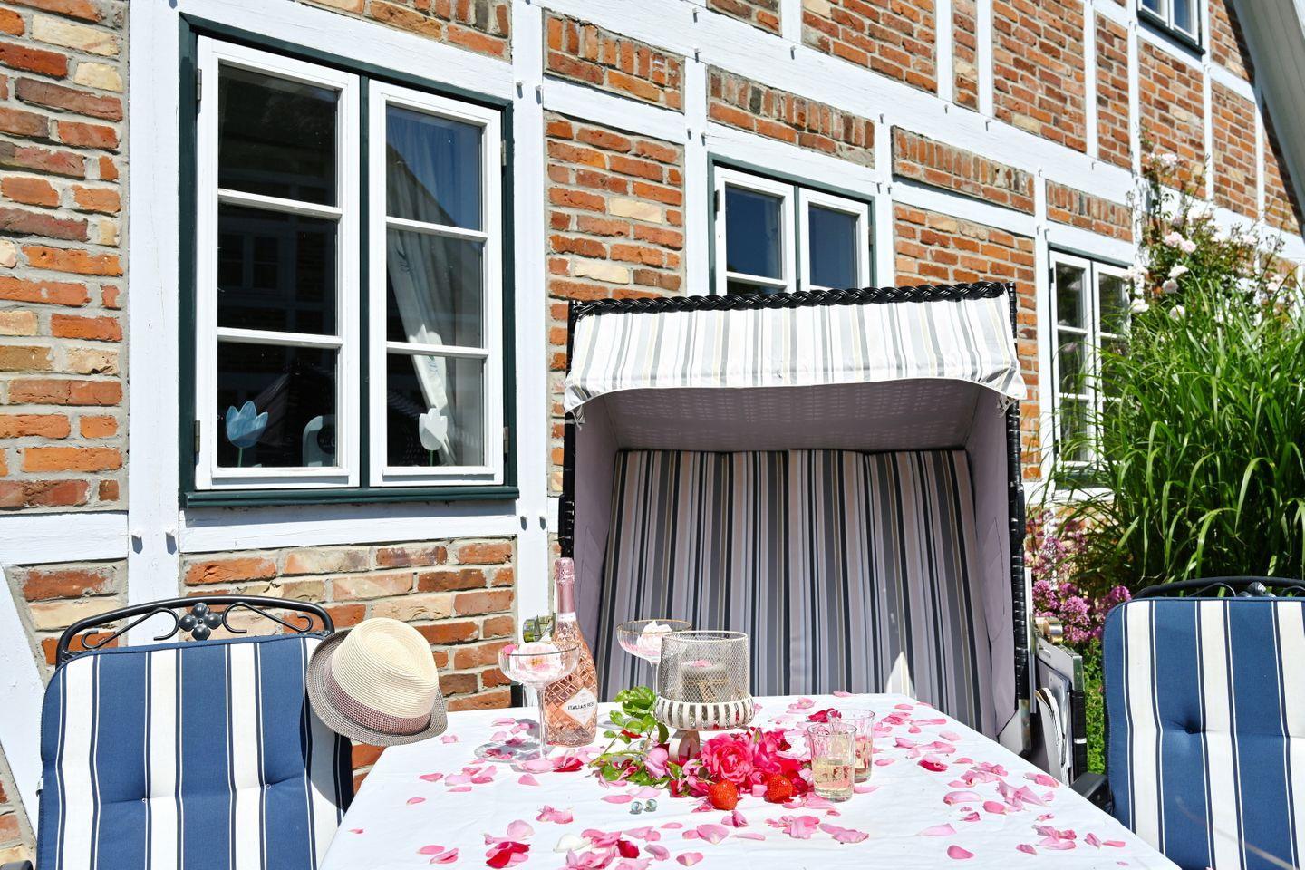 Zu jeder der Wohnungen gehört eine separate Terrasse in der wunderschönen großen Gartenanlage incl. Strandkorb und Gartenmöbeln. WLAN ist vorhanden.