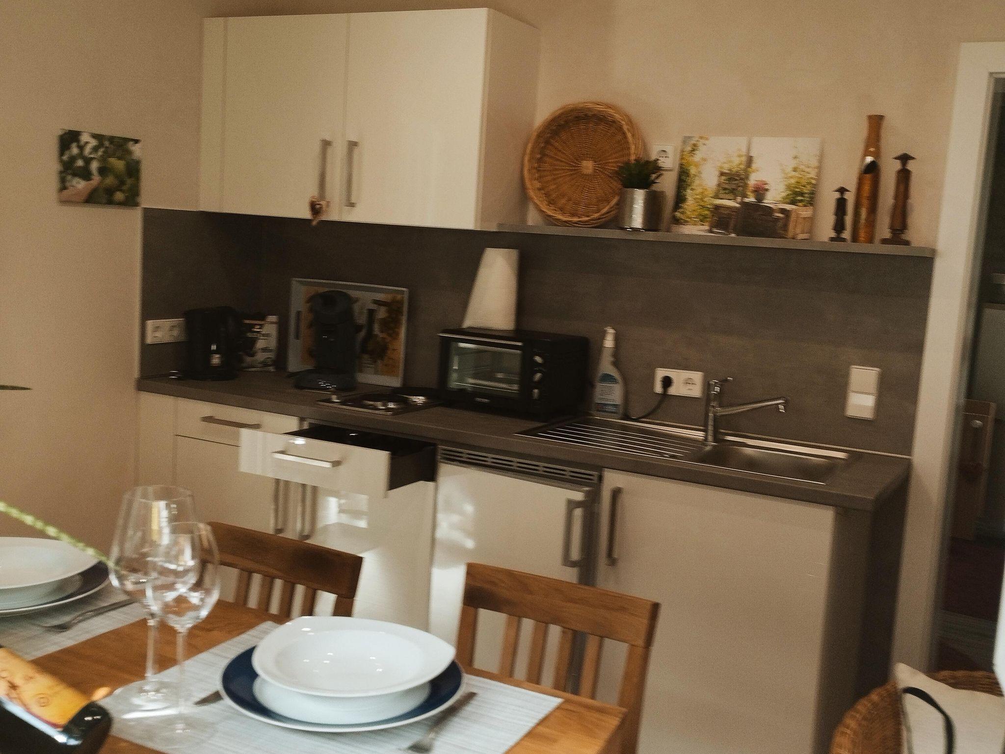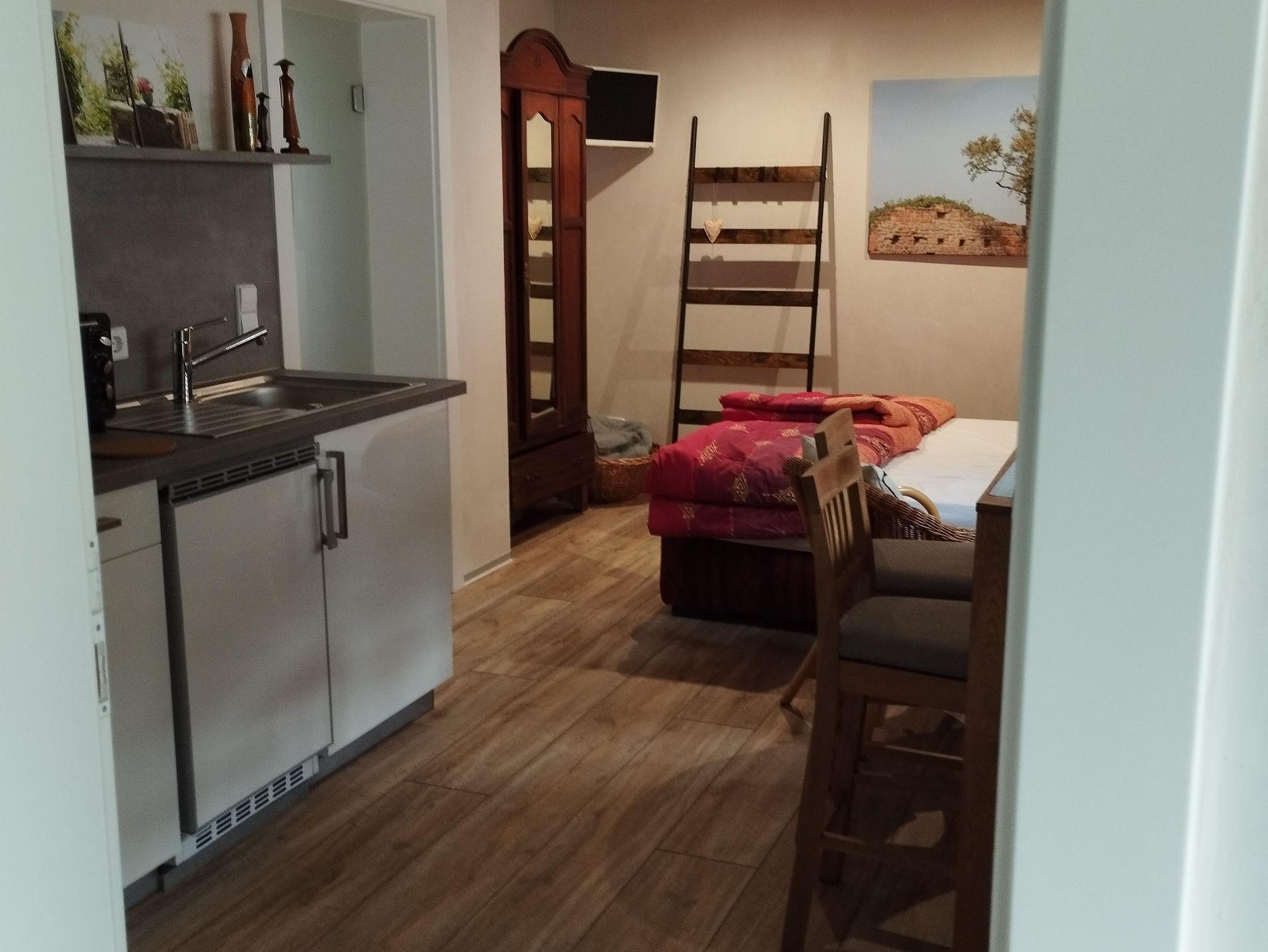 Unsere Ferienwohnung besteht aus einem Wohn-/Schlafraum mit Küchenbereich und einem großen Badezimmer mit bodengleicher, extragroßer Dusche. Die Wohnung erreichen sie über drei Stufen vor der Haustüre, im Innern mit separatem Eingang. Vorm Haus und im Garten gibt es gemütliche Sitzgelegenheiten.
