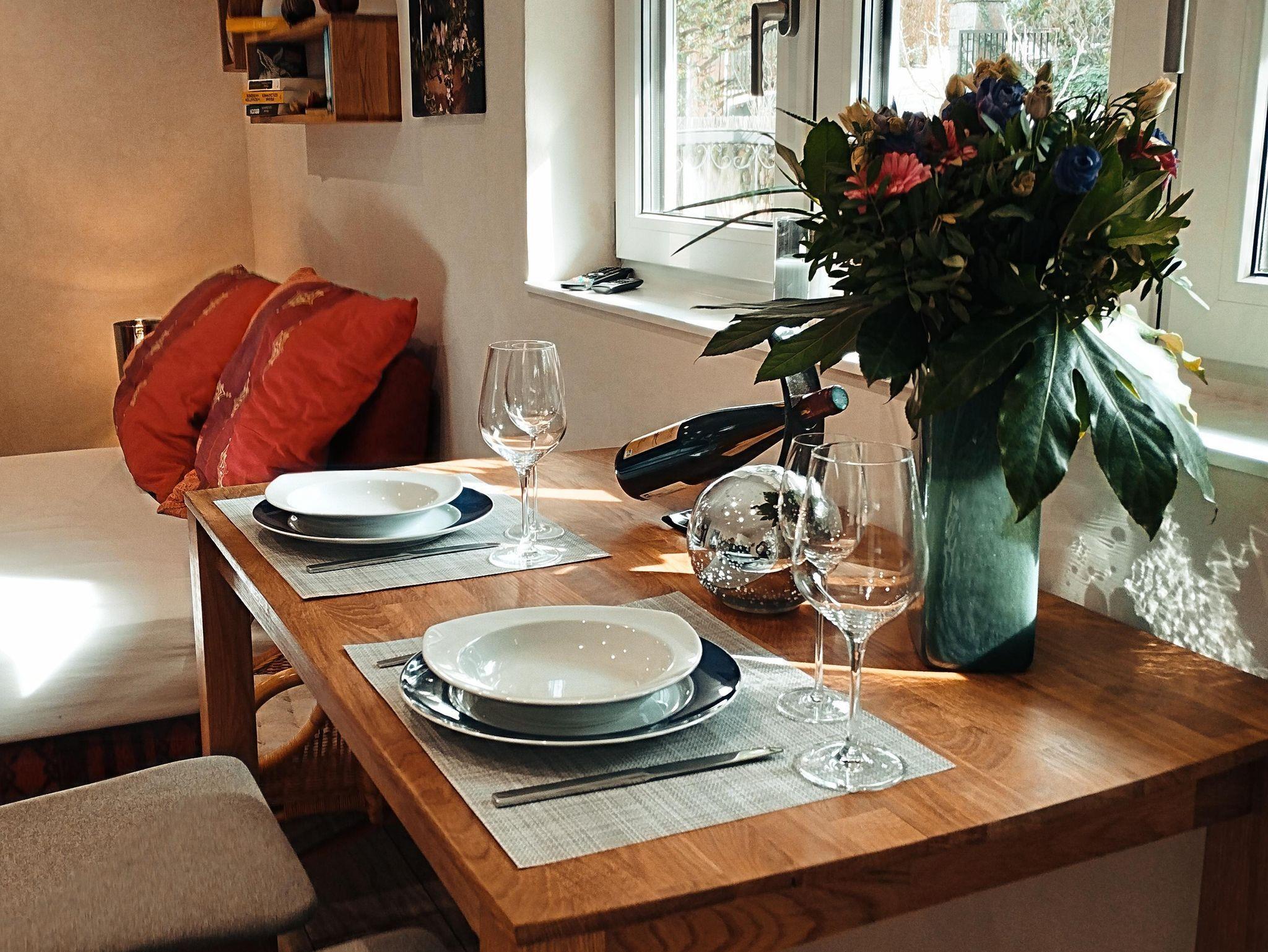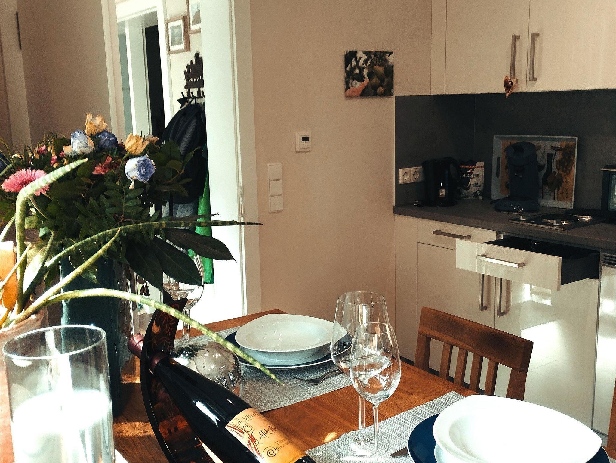 Unsere Ferienwohnung lädt zum Wohlfühlen und Entspannen nach einem anstrengenden oder spannenden Tag ein. Sie wurde nach ökoloigischen Gesichtspunkten mit Wänden aus Kalkputz und schadstofffreien Designfußboden errichtet. Die Fußbodenheizung wird von einer Wärmepumpe gespeist. Die Fenster sind 3-fach verglast und mit elektrischen Rollläden versehen. Das großzügige modern gestaltete Badezimmer mit Wellnessdusche macht die Entspannung nach dem Urlaubstag perfekt. Im Wohnbereich steht Ihnen eine komplett eingerichtete Küchenzeile mit Kaffeemaschine, Wasserkocher, kleinem Backofen, integriertem Kochfeld, Kühlschrank und allen sonstigen Küchenutensilien zur Verfügung. Das bequeme 160cm breite Bett macht die Erholung und den Start in den neuen Tag leicht möglich. Handtücher, Bettwäsche und Föhn sind selbstverständlich vorhanden. Die Möglichkeit der Überlassung eines Kinderreisebettes besteht jederzeit. Fernseher und W-LAN sind vorhanden, Sie finden aber auch Bücher und Gesellschaftsspiele.