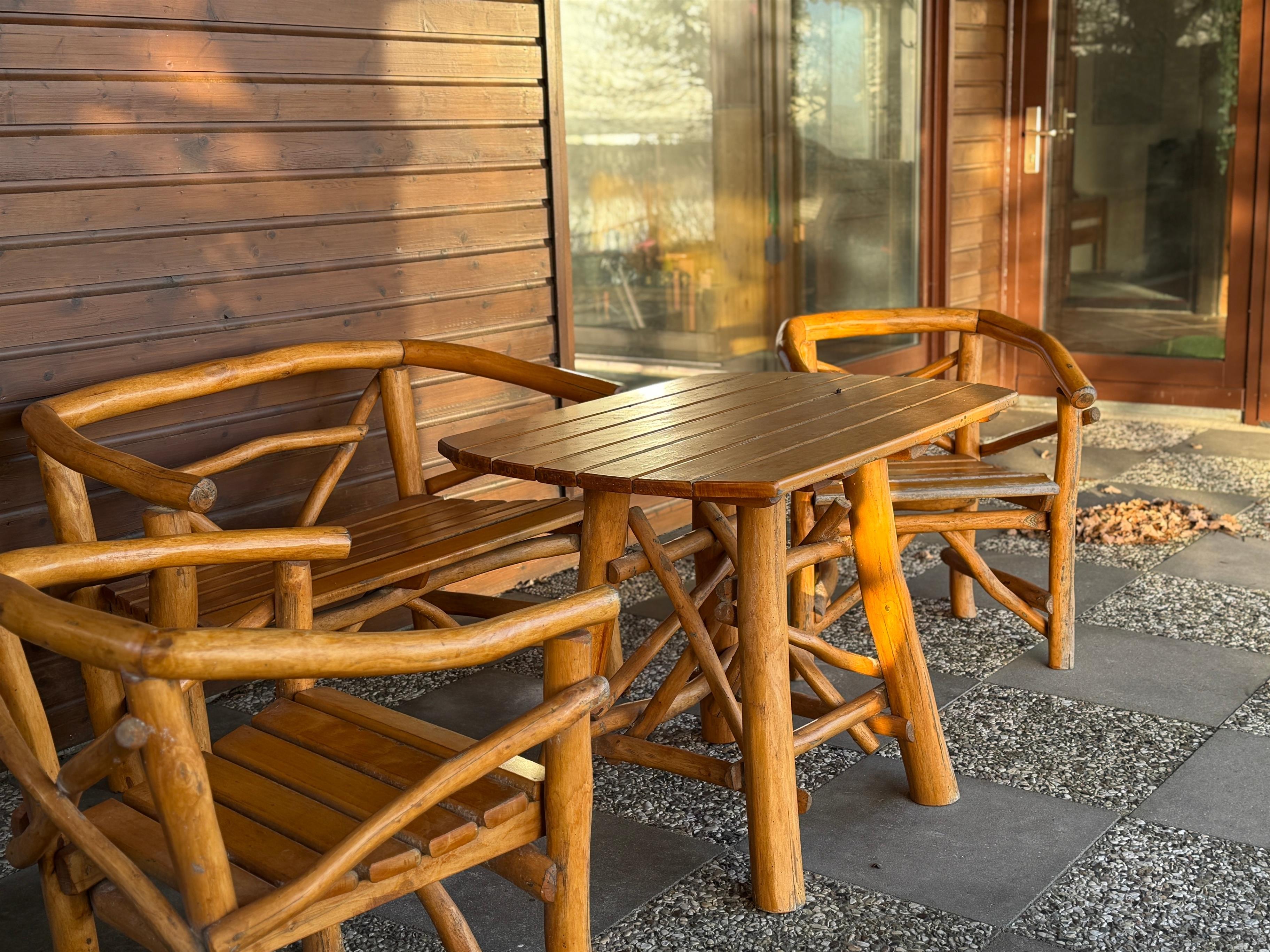 Wohnzimmerbereich: Sofa und 2 Sessel mit Panoramafenster, Fernseher, Ofen. Essbereich Tisch und 4 Stühle. Wintergarten, eine große überdachte Terrasse, sowie zwei Naturterrassen.