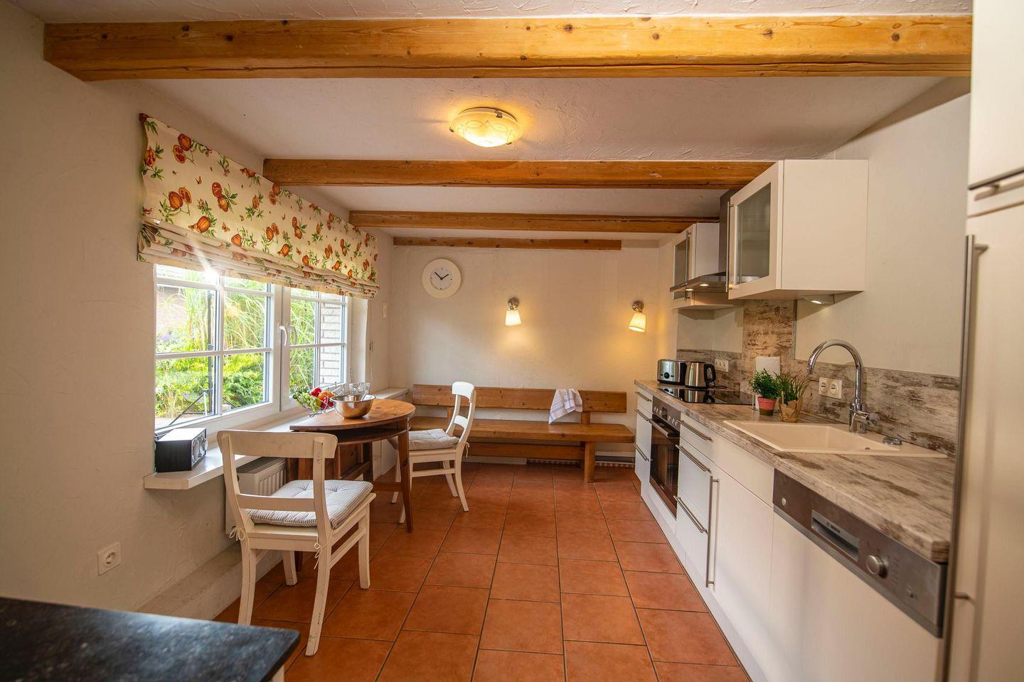 Die offene, helle Küche ist hochwertig ausgestattet und ideal für gemeinsames Kochen.