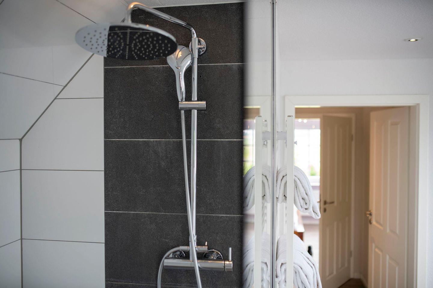Das großzügige Badezimmer im Dachgeschoss ist mit einer gläsernen Regenwalddusche ausgestattet und bietet einen phänomenalen Blick auf die Ostsee – ein kleines Wellness-Erlebnis mit Meerblick.