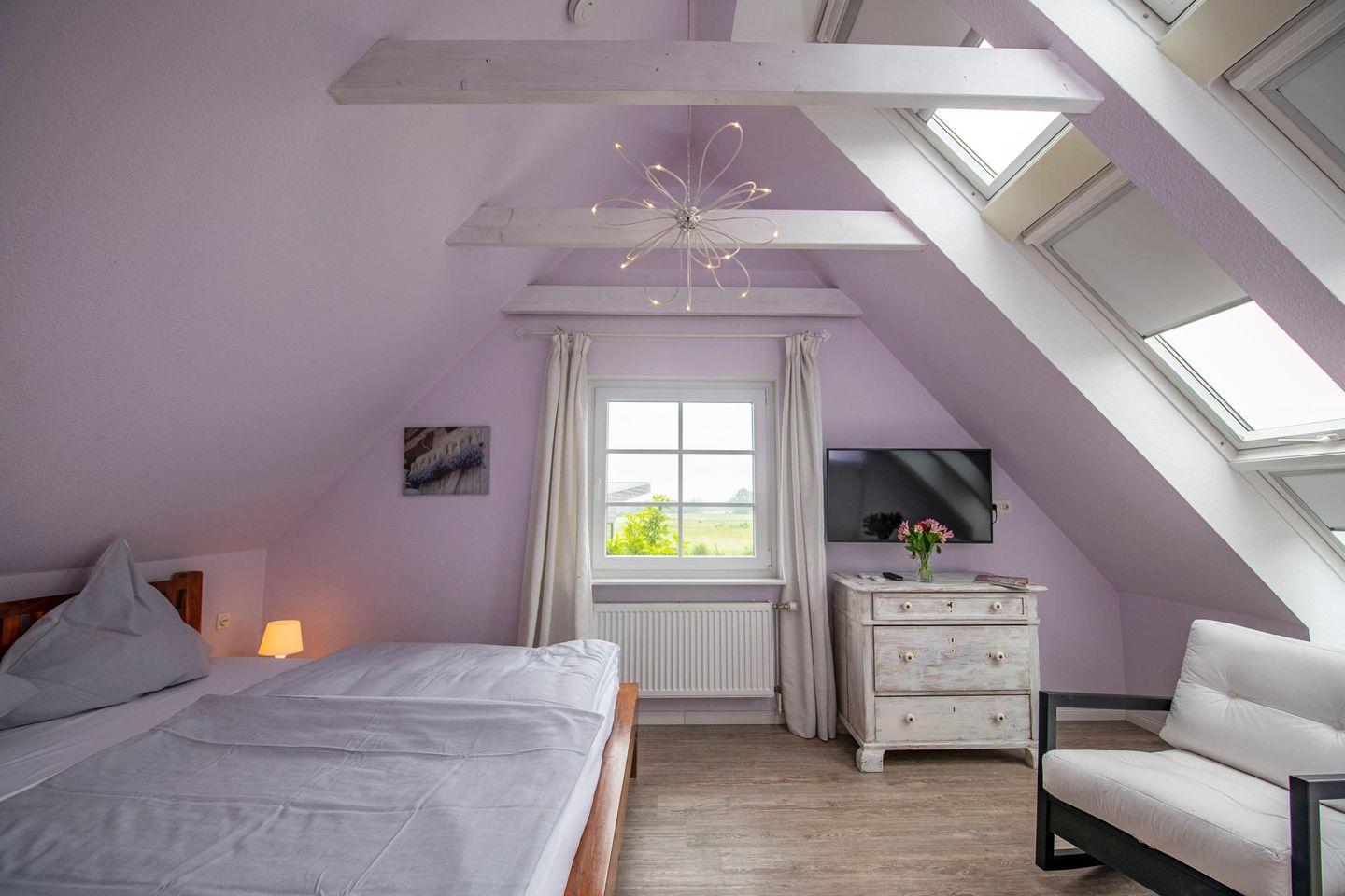Im Erdgeschoss befindet sich ein großes, helles Schlafzimmer mit Doppelbett.