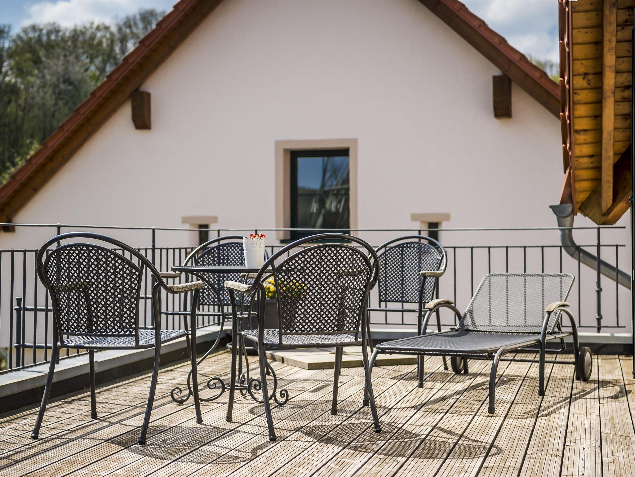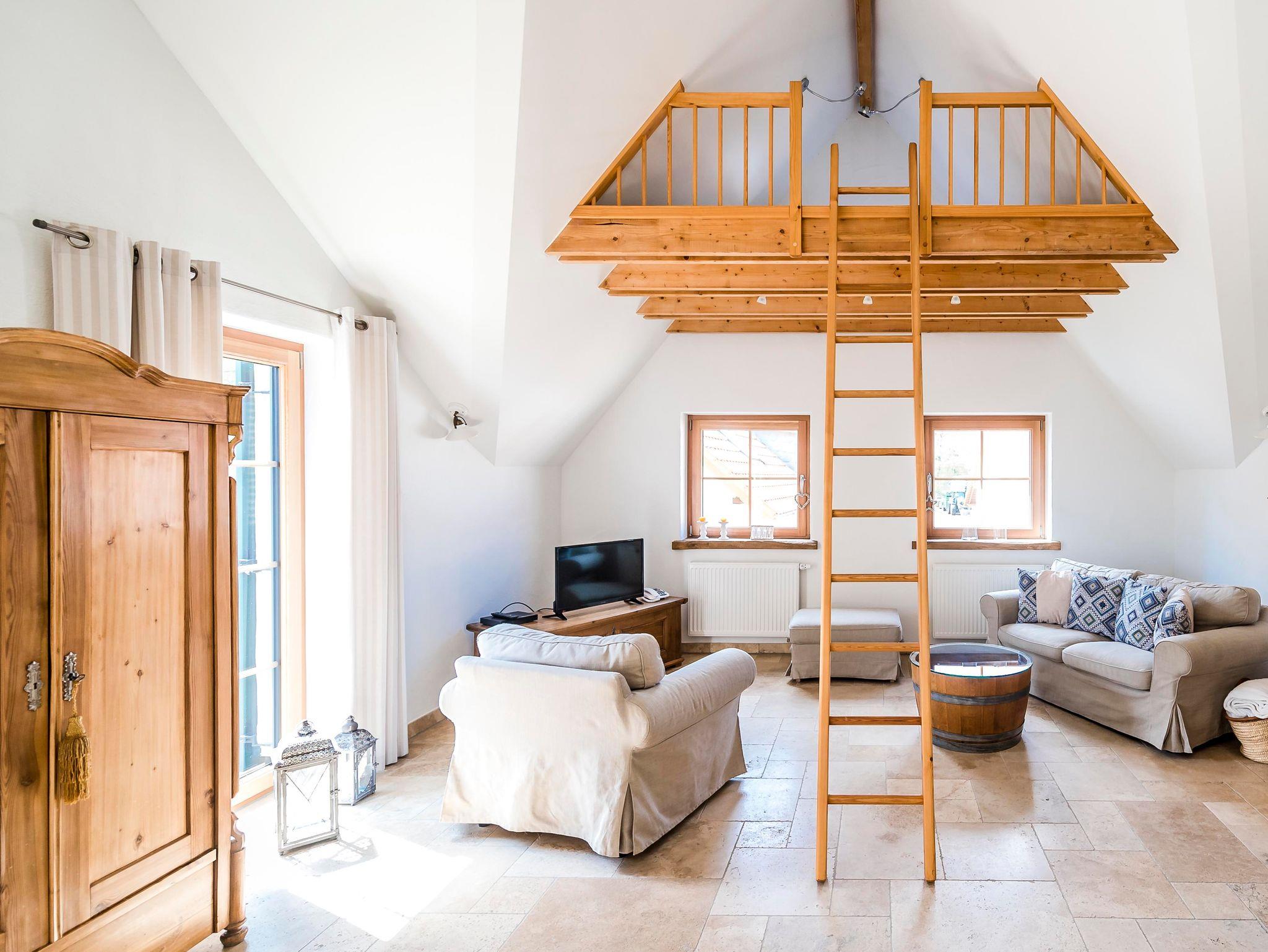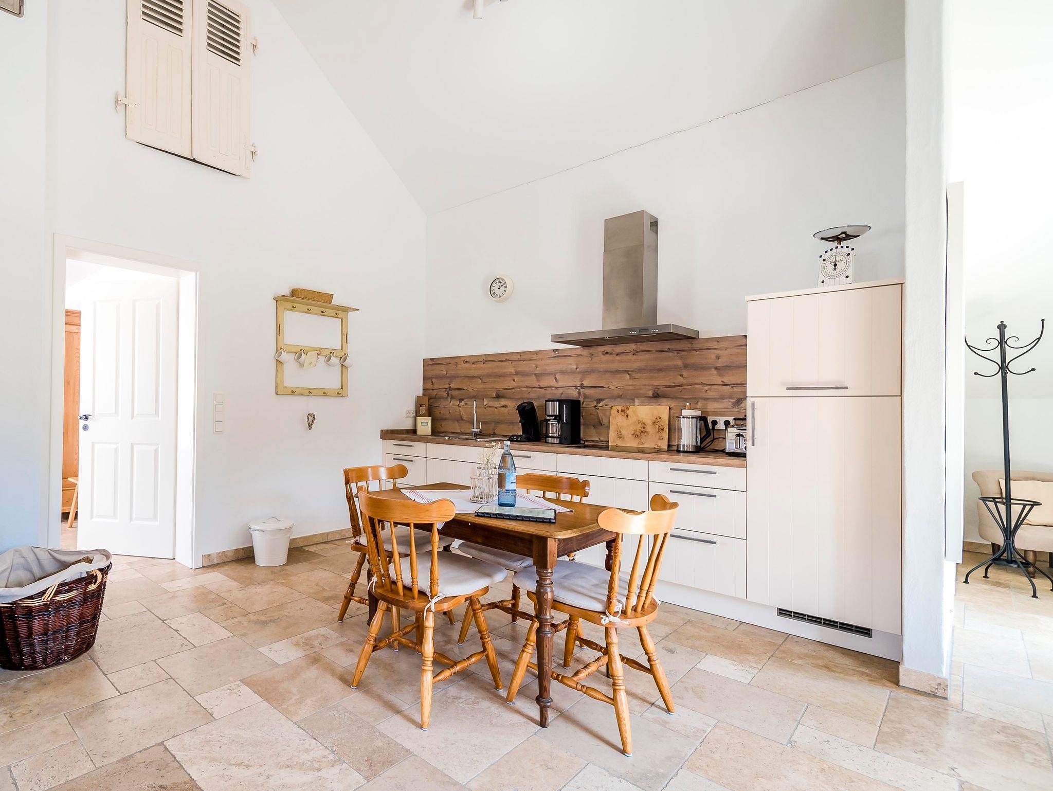 Über die großzügige, möblierte Sonnenterrasse betreten Sie die ländlich-moderne Ferienwohnung im ersten Stock. Der Wohn-Essraum mit offener Küche im modernen Landhausstil wird Ihnen durch sein stilvolles Ambiente, die bis in den Dachstuhl offenen Decken und die Wohlfühlempore ein einzigartiges Wohngefühl vermitteln. Blicken Sie aus allen Fenstern ins Grüne und auf unseren wunderschön sanierten Innenhof!