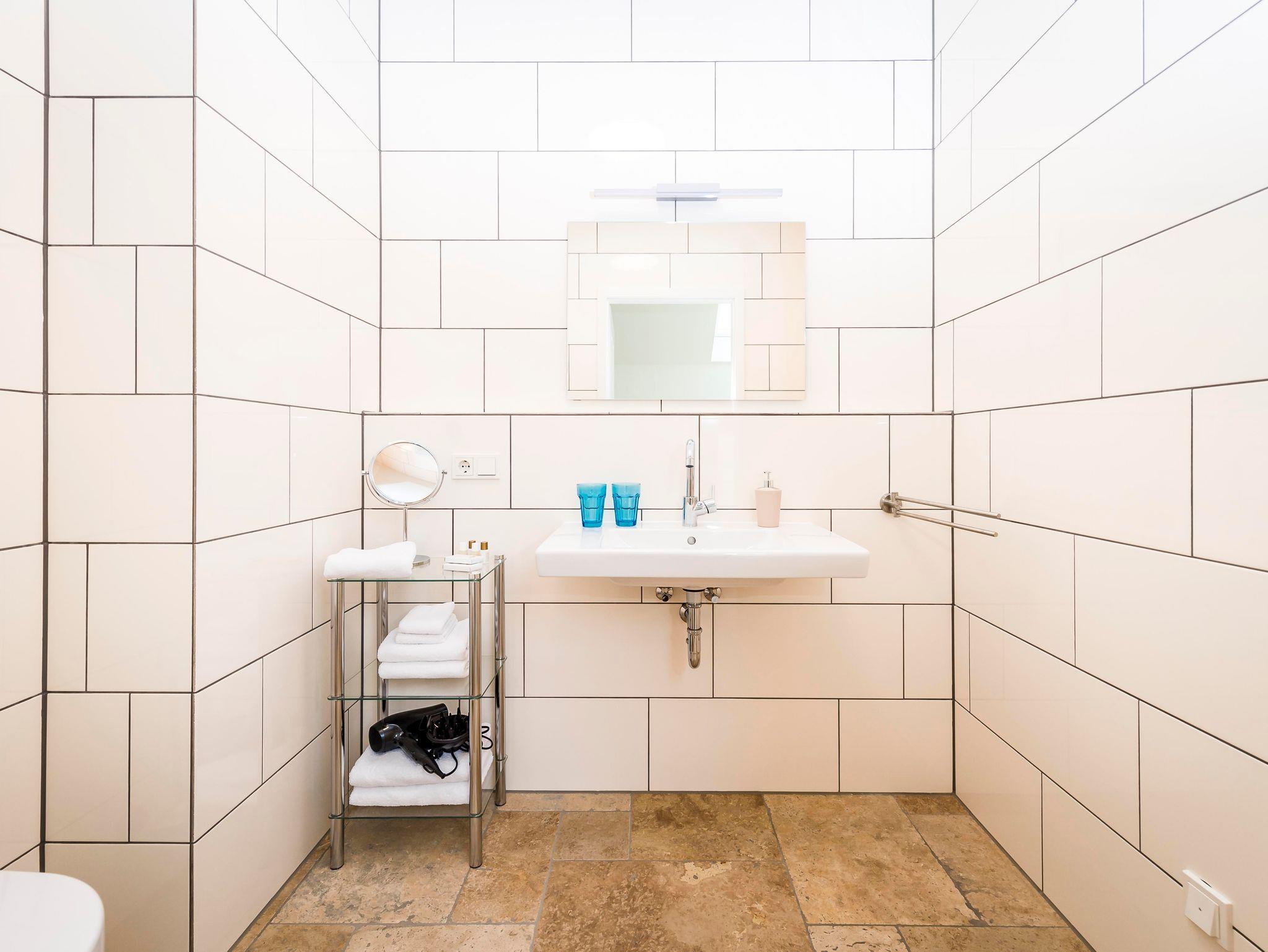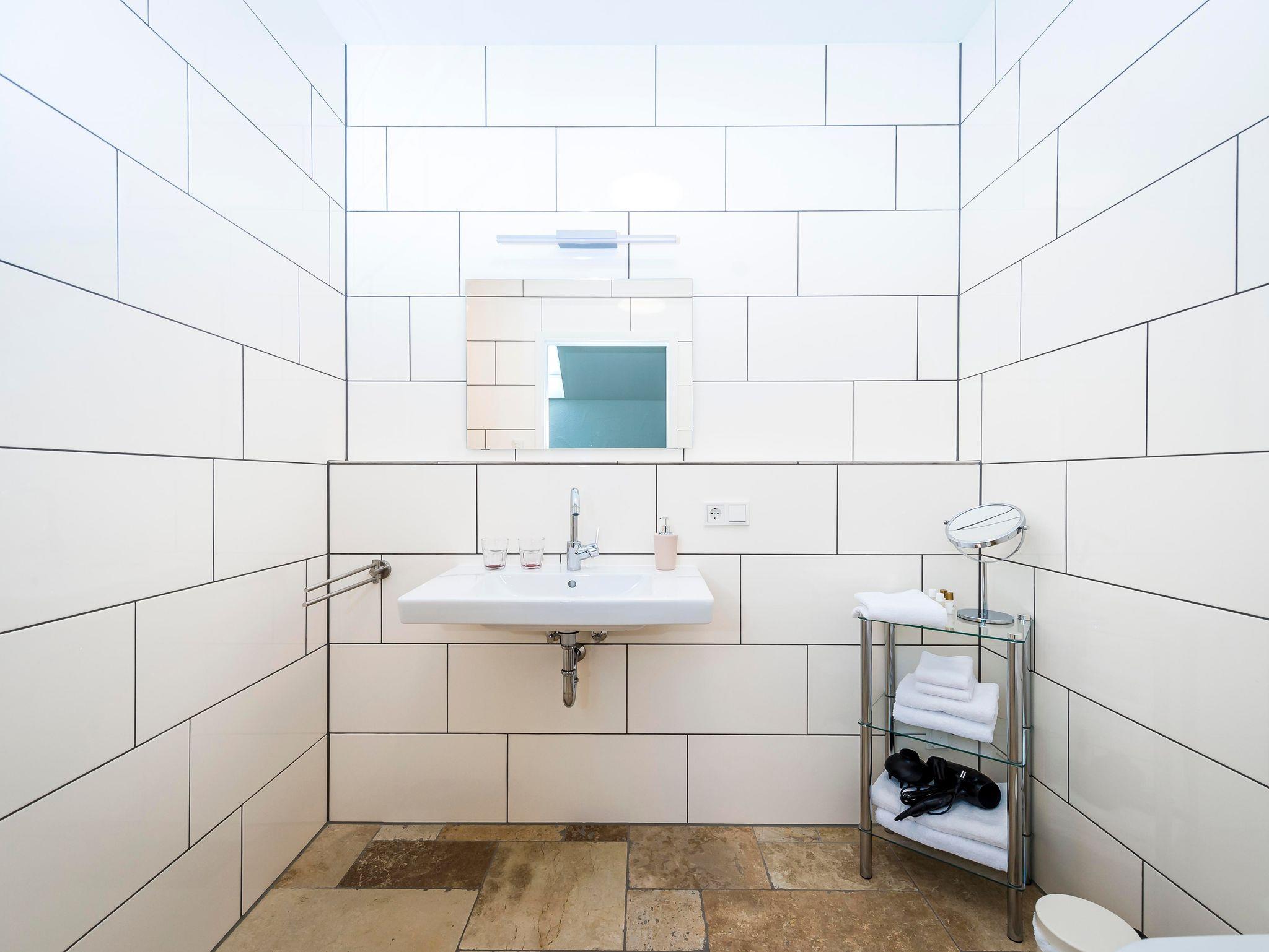 Die Großzügigkeit des Raumes und das helle Bad mit bodenebener Dusche tragen zum Wohlgefühl genauso bei wie die jeweiligen Farbakzente, die als Thema die heimischen Blumen aufgreifen.