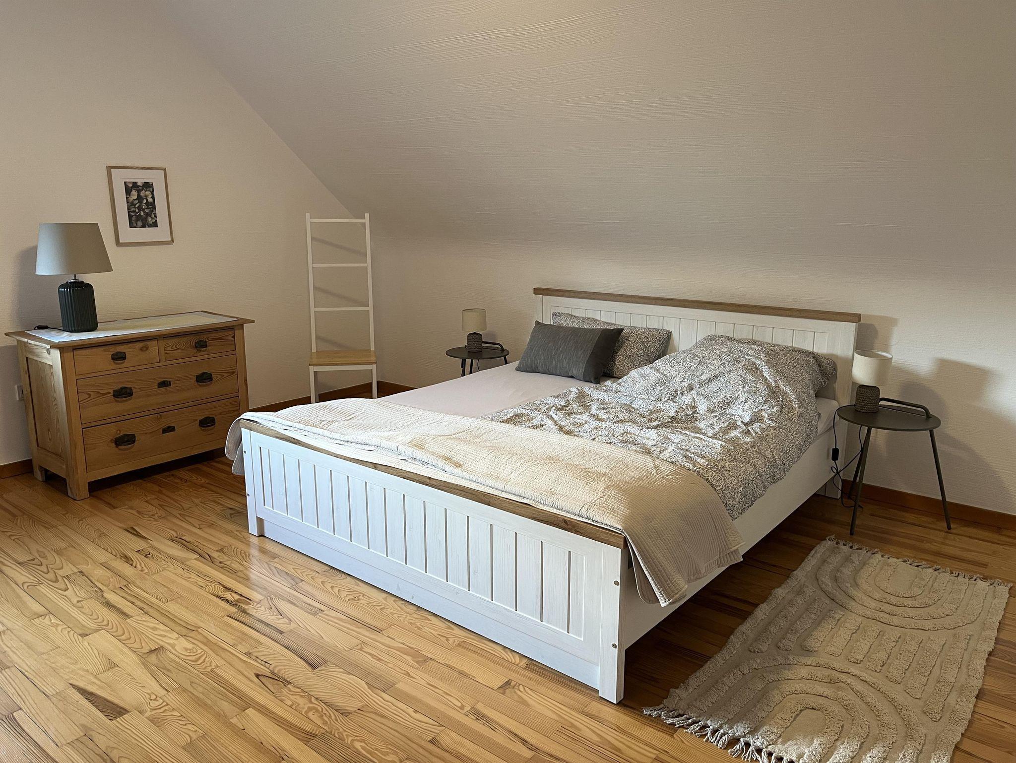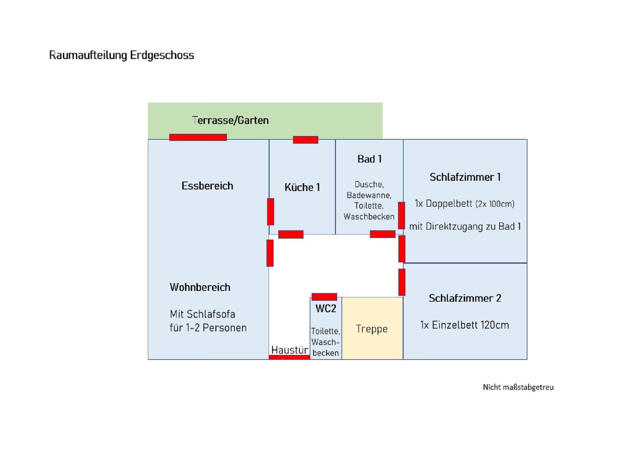 Im Erdgeschoss erwarten Sie zwei gemütliche Schlafzimmer – eines mit einem Doppelbett und ein weiteres mit einem breiten Einzelbett. Zusätzlich bietet das Wohnzimmer eine Schlafcouch für 2 Gäste. Eine voll ausgestattete Küche mit Herd, Backofen, Kühlschrank, Kaffeemaschine und mehr, sowie ein Badezimmer mit Wanne und Dusche. Zusätzlich sorgt ein zweites, separates WC für einen angenehmen Aufenthalt. Das Badezimmer im Erdgeschoss ist mit dem Doppelzimmer im Erdgeschoss verbunden.