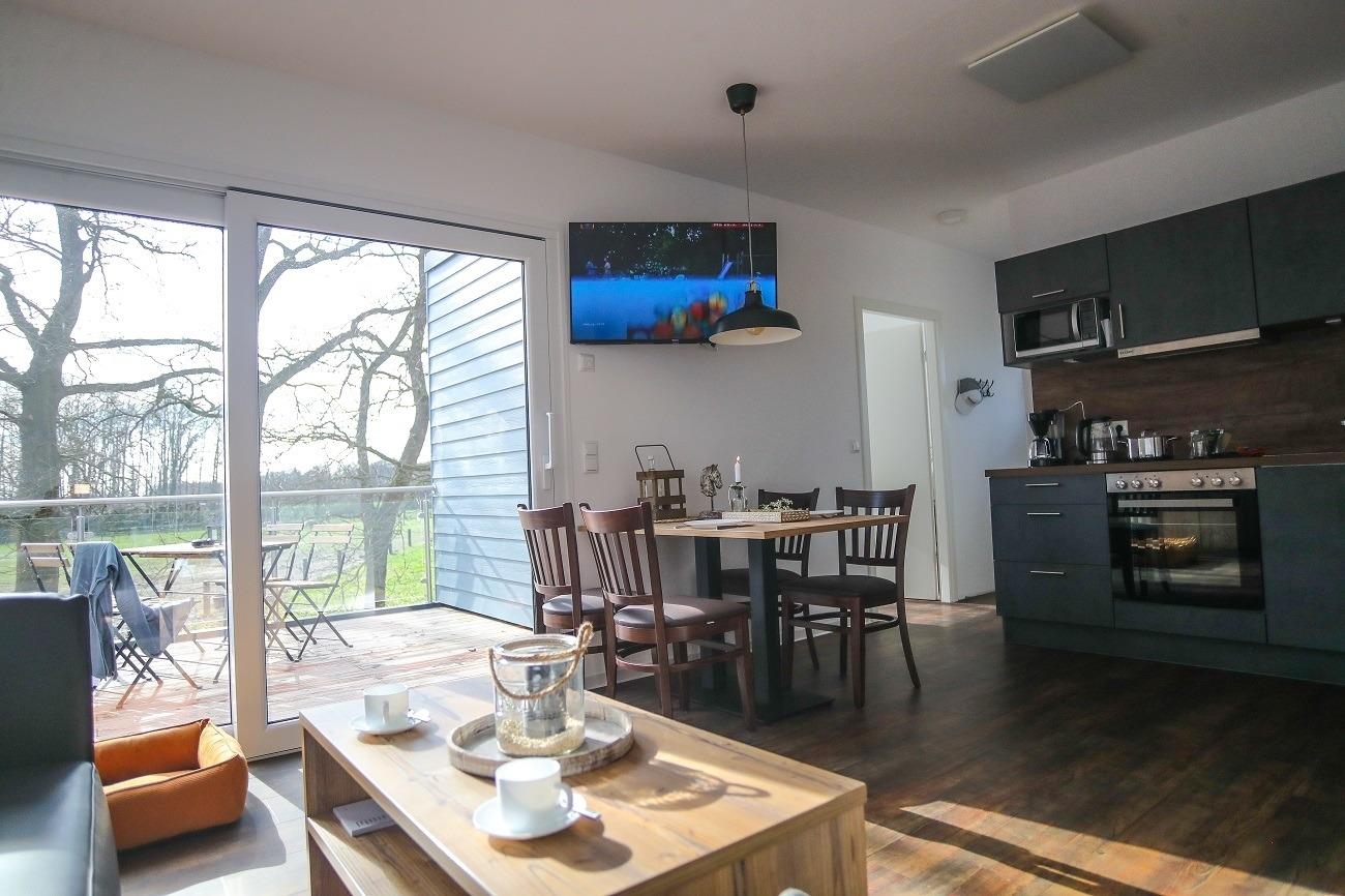 Die Wohnküche ist ausgestattet mit einer modernen Einbauküche, einem Esstisch und einer gemütlichen Sitzecke mit TV.