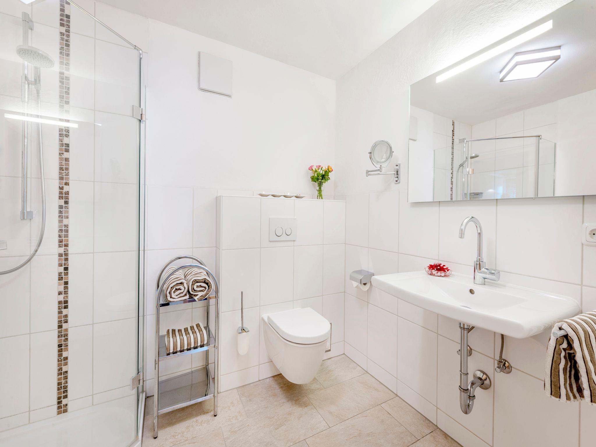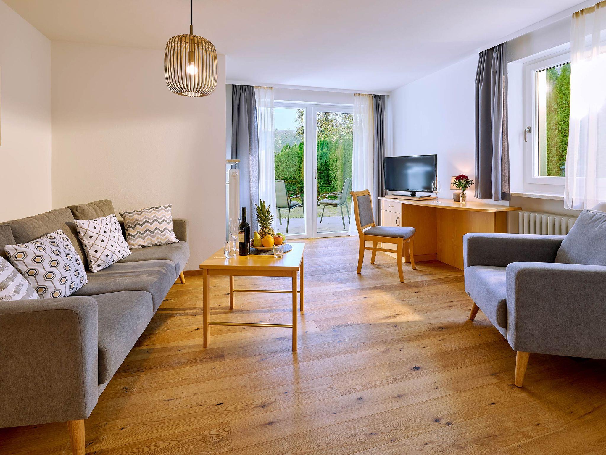 Die 5-Sterne-Ferienwohnung Gänseblümchen für 2 Personen befindet sich im Erdgeschoss und ist 55 m² groß. Die Wohnung verfügt über ein Schlafzimmer mit Doppelbett, Schrank und Tresor, ein großes Wohnzimmer mit gemütlicher Sitzgruppe, eine komplett ausgestattete Küche mit Geschirrspüler und Essgruppe, ein Badezimmer mit Dusche, WC, Handtuchtrockner und Fön und eine Terrasse mit kleinem privatem Garten.