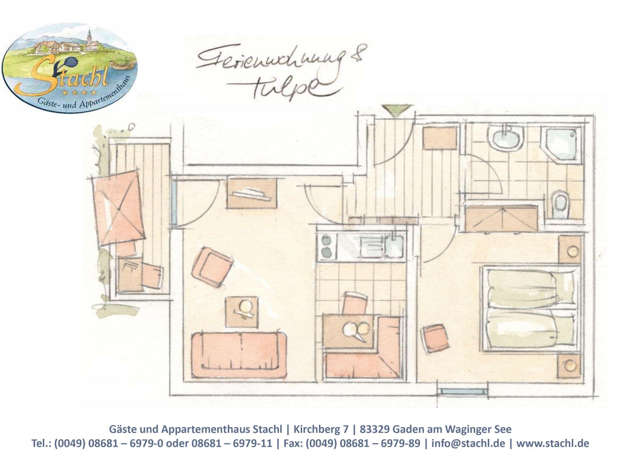 Die 4-Sterne-Ferienwohnung Tulpe für 2 Personen befindet sich im 2. Stock und ist 45 m² groß. Die Wohnung verfügt über ein Schlafzimmer mit Doppelbett, Schrank und Tresor, ein Wohnzimmer mit gemütlicher Sitzecke, LCD-TV und eine komplett ausgestattete Küchenzeile mit Geschirrspüler und Essecke, ein Badezimmer mit Dusche, WC, Handtuchtrockner und Fön und einen sonnigen Südbalkon.
