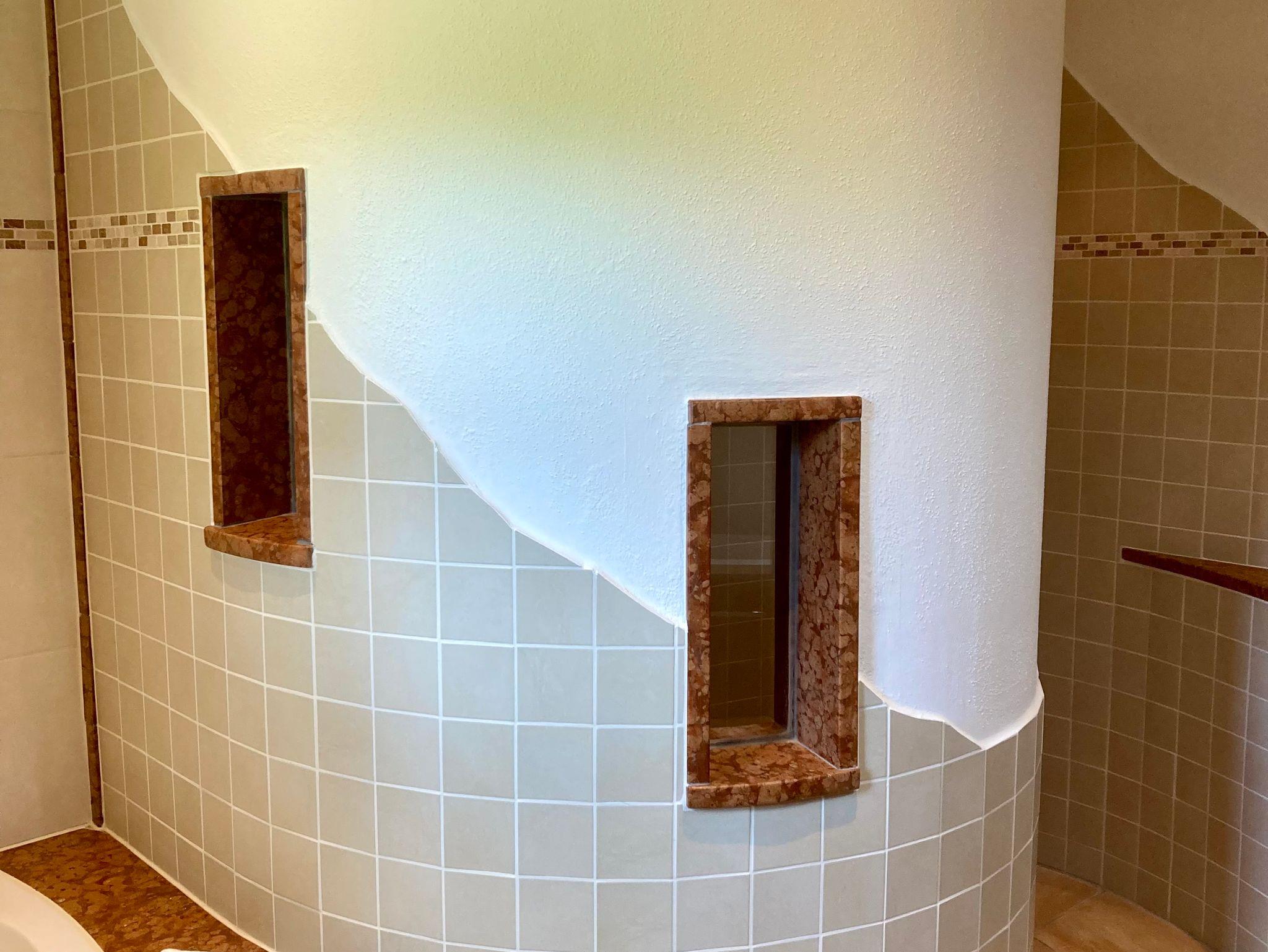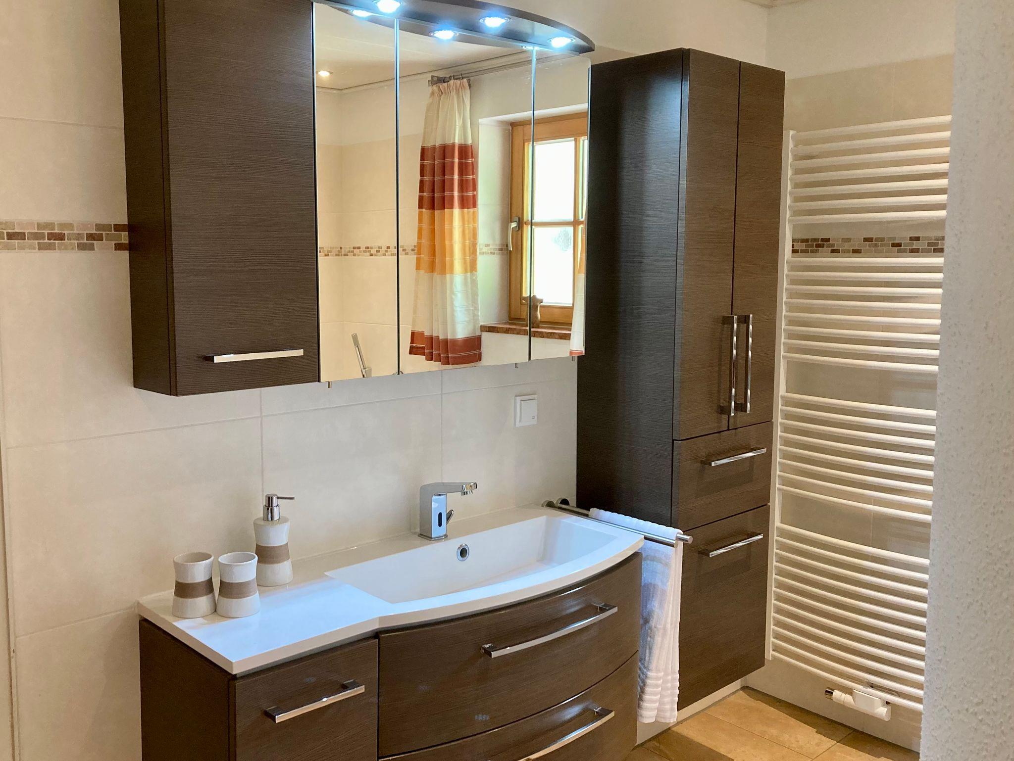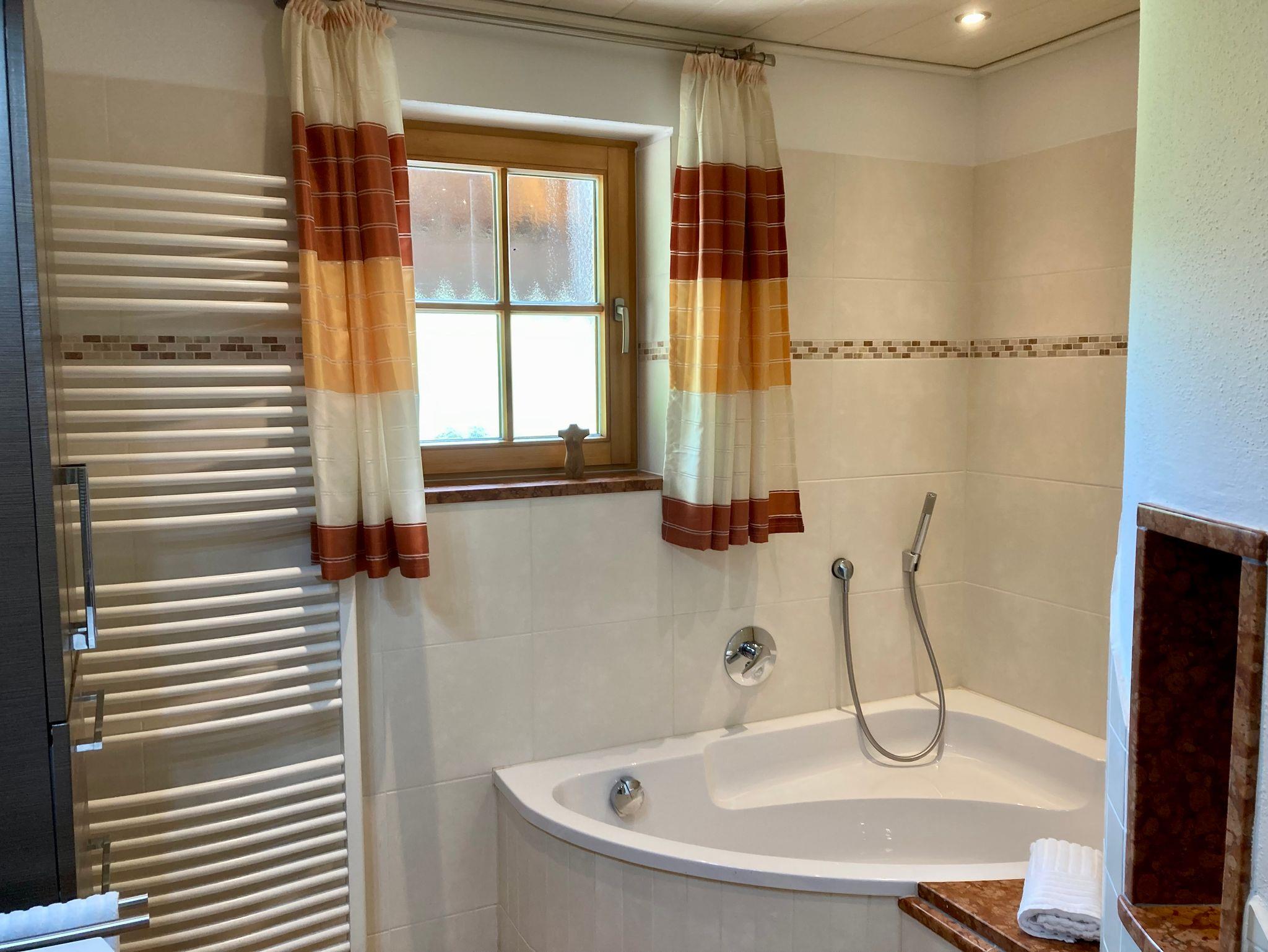 Das Bad verfügt über eine Badewanne sowie eine begehbare Dusche, die zur Entspannung einladen.
