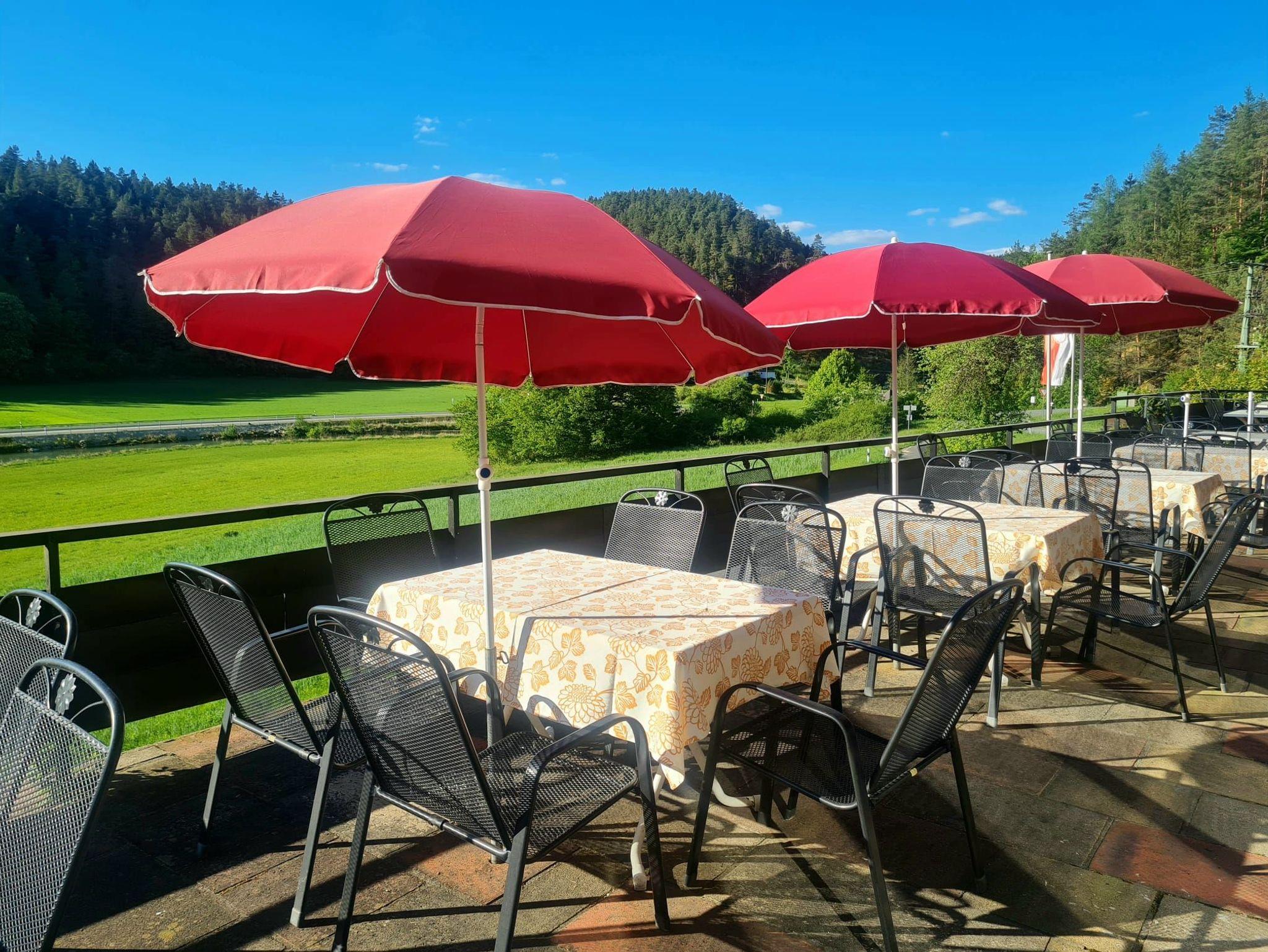 Im Parterre befindet sich das Restaurant. Hier können Sie zu jeder Tageszeit eine entsprechende Mahlzeit einnehmen. Morgens bedienen Sie sich selbst am reichhaltigen Frühstücksbuffet, nachmittags können Sie auf unserer Sonnenterrasse frische Torten und Kuchen aus eigener Herstellung genießen und abends wählen Sie aus der Karte, die Speisen aus der guten fränkischen Küche, sowie fangfrische Forellen und Wildgerichte umfasst. In unserem Kaminzimmer finden Sie immer ein beschauliches Plätzchen in wohliger Atmosphäre.