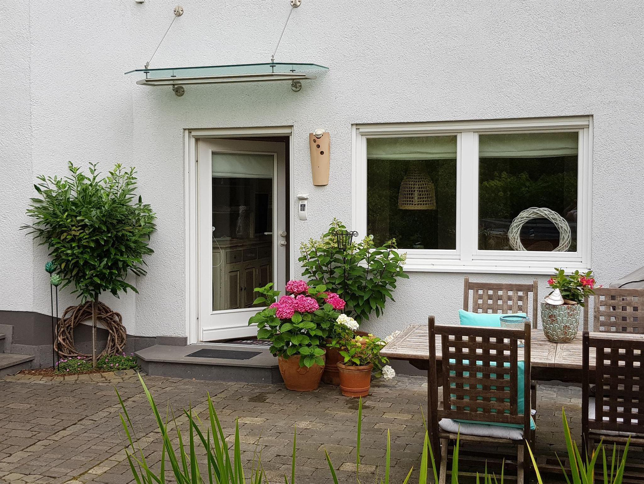 * die komplette Ferienwohnung ist mit einer Fußbodenheizung ausgestattet *Terrasse mit einem Tisch und vier Stühlen