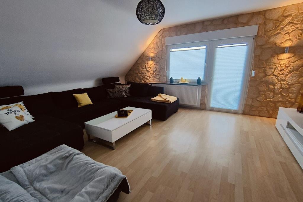 Vår nyrenoverte, komfortabelt møblerte og hundevennlige ferieleilighet med omtrent 50 m² boareal, peis og en romslig balkong inviterer deg til å slappe av og koble av. Hunder er velkomne. Kjøkkenet og spisestuen har et velholdt utstyrt kjøkken med oppvaskmaskin, komfyr, mikrobølgeovn, stekeovn, kaffetrakter, brødrister og vannkoker. Mat- og vannskåler er tilgjengelige for kjæledyrene dine. Fra kjøkkenet kommer du inn i den lyse stuen med en uttrekkbar sovesofa. En ekstra hundeseng er standard. Soverommet har en komfortabel 1,60 m bred boksmadrass. Det lyse badet med dusj har moderne møbler.