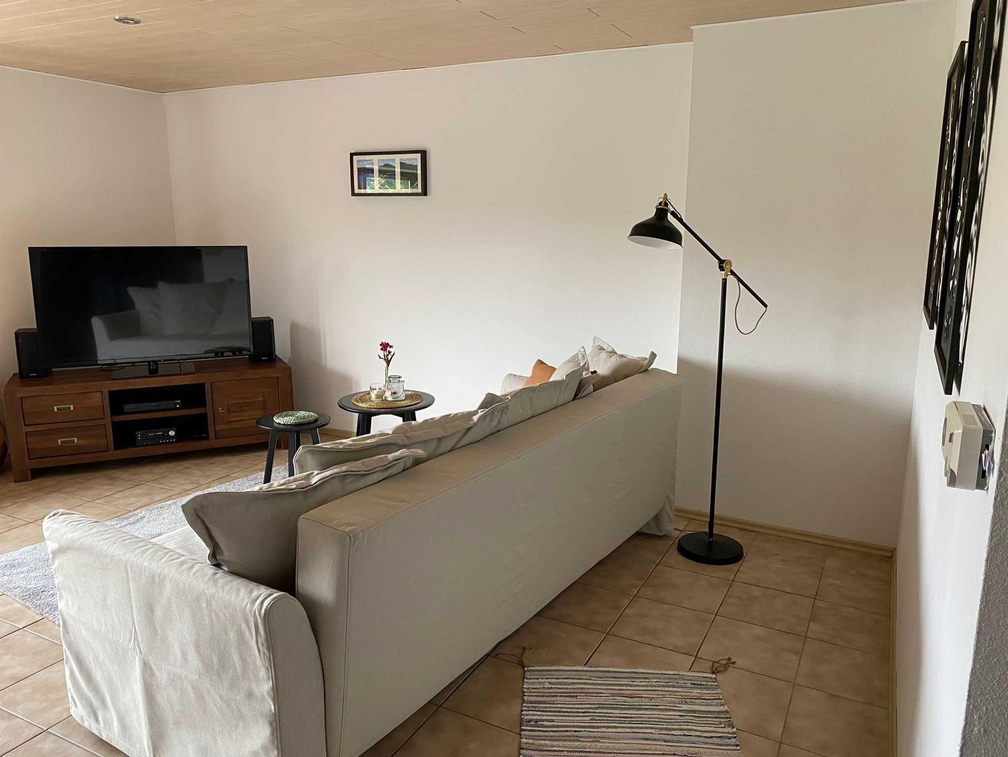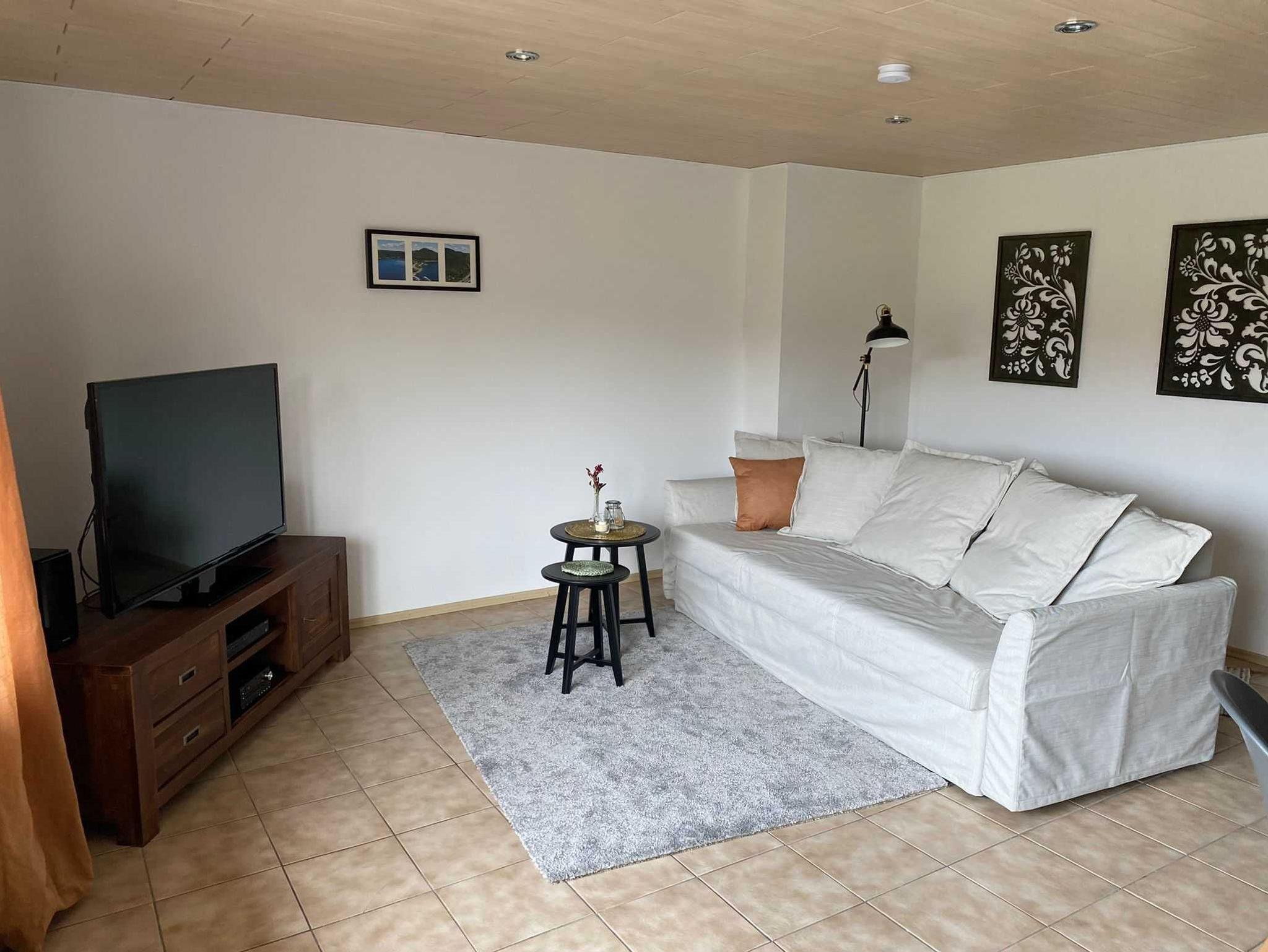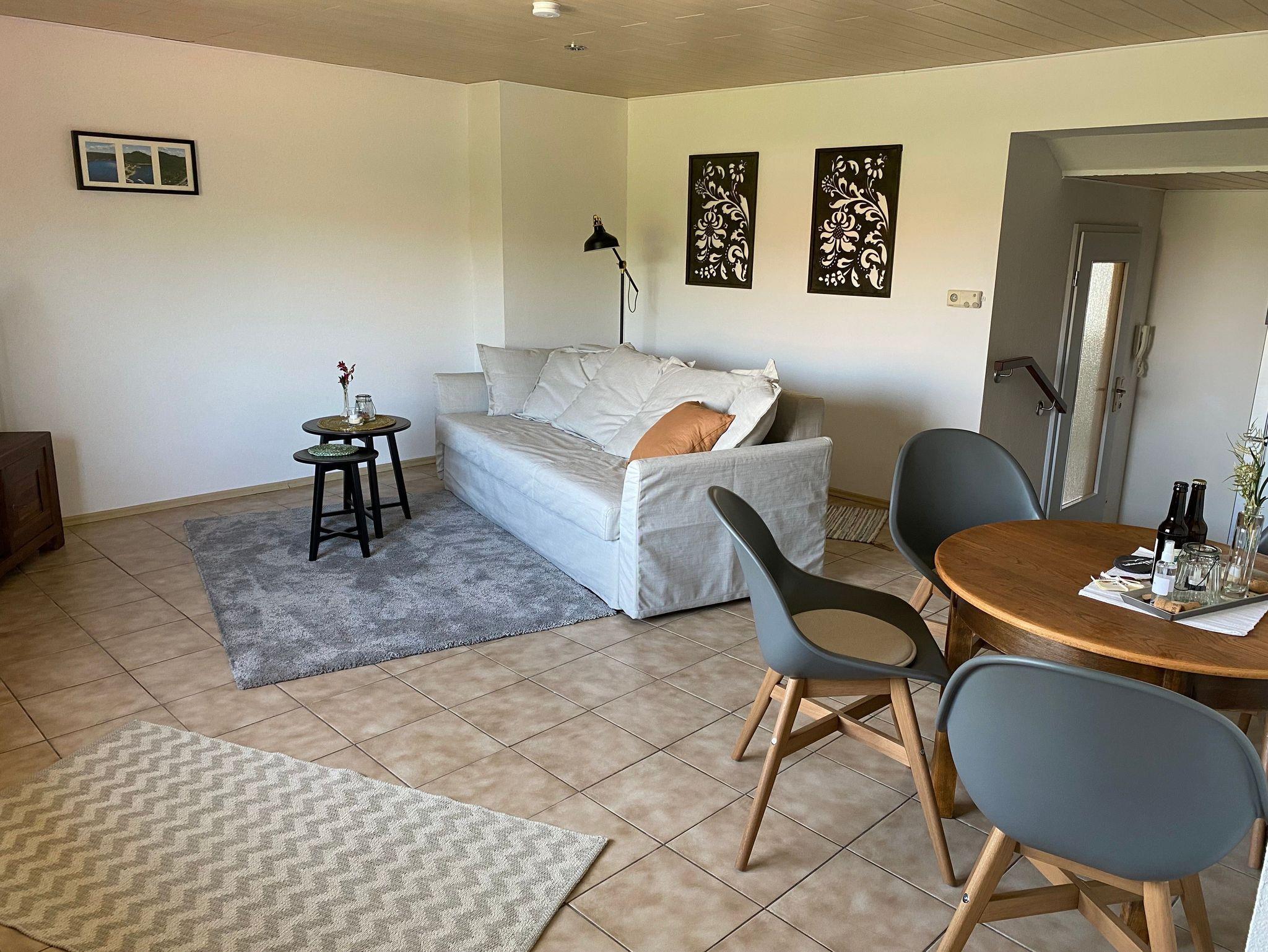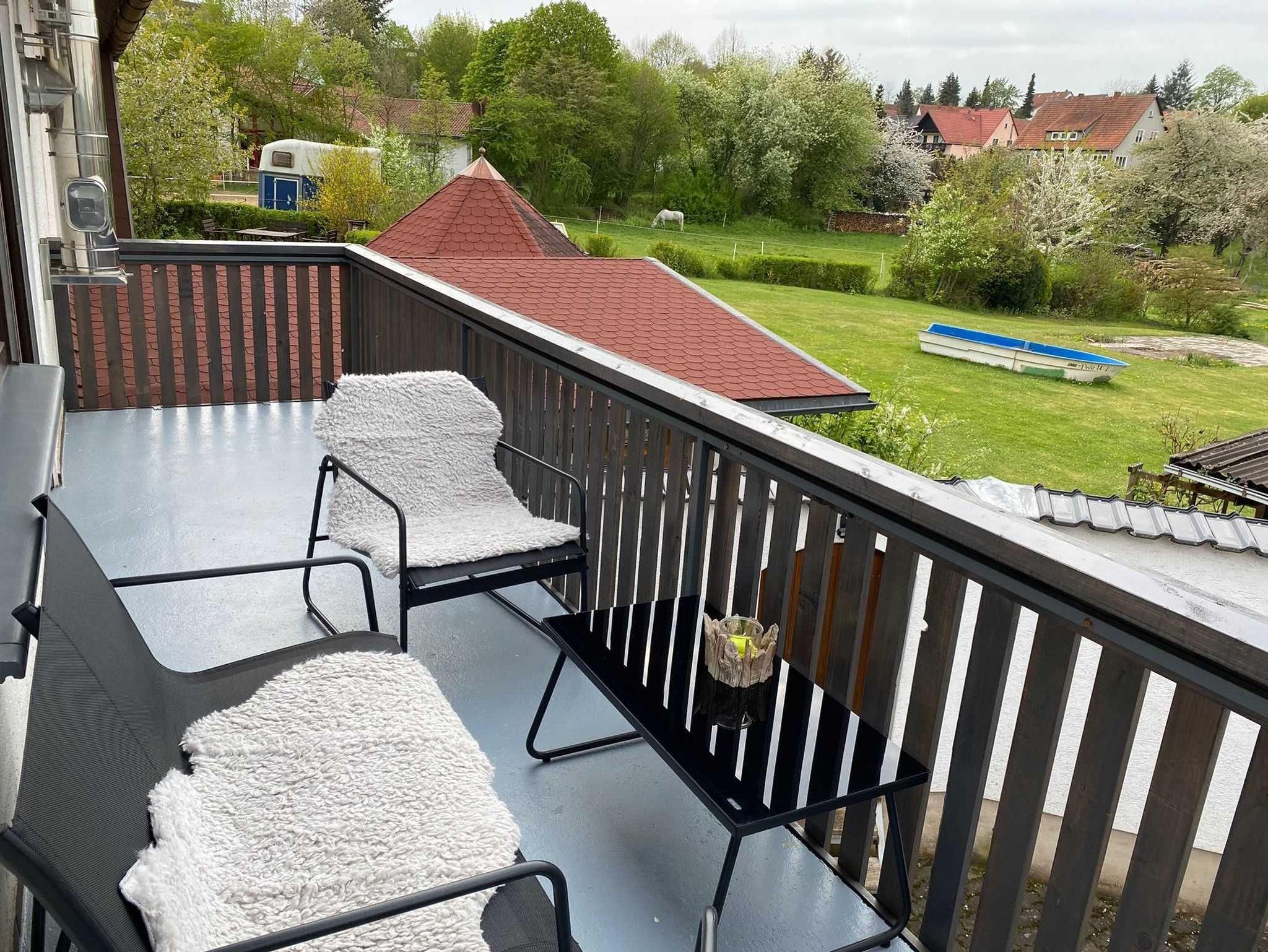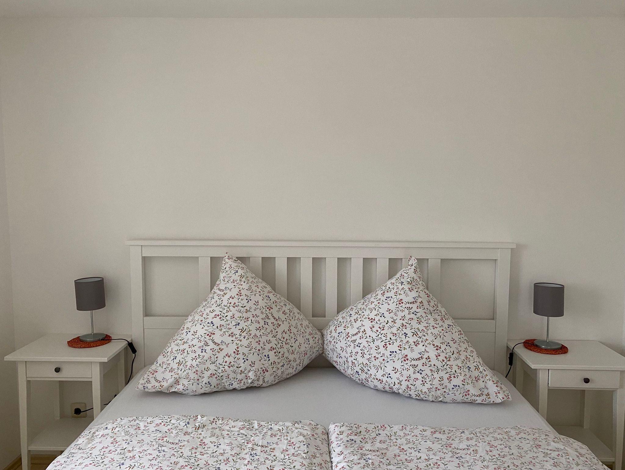 Unsere Ferienwohnung verfügt über ein Schlafzimmer mit Doppelbett, im Wohnzimmer ist ein umfunktionierbares Schlafsofa für zwei Personen vorhanden. Auf Wunsch kann auch ein Kinderbett (1,50 m x 1,00 m) zur Verfügung gestellt werden. An das Wohnzimmer grenzt ein großer Balkon mit Sitzgarnitur und schönem Gartenblick.