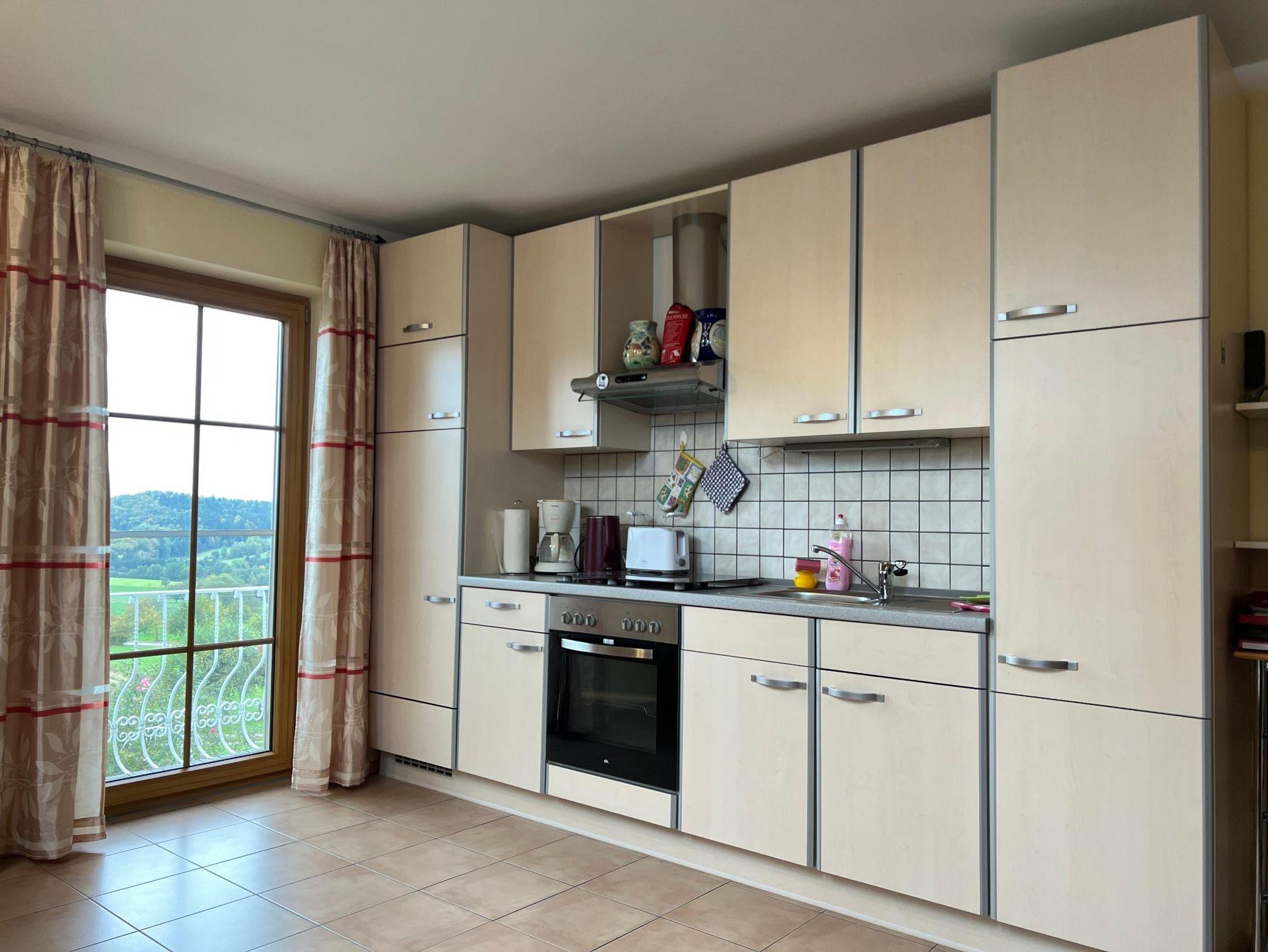 Die moderne Küche... mit großen Kühlschrank und geräumigen Gefrierfach, Backofen m. Ceranfeld, sowie allen Geräten, die zur Zubereitung auch ganzer Menüs benötigt werden, sind da. (Mikrowelle,Toaster,Wasser- Eierkocher, Brotschneidemaschine, Kontaktgrill) und...natürlich alles Porzellan,Glas, auch Tees, Kaffeepulver, Gewürze, u.v.m.