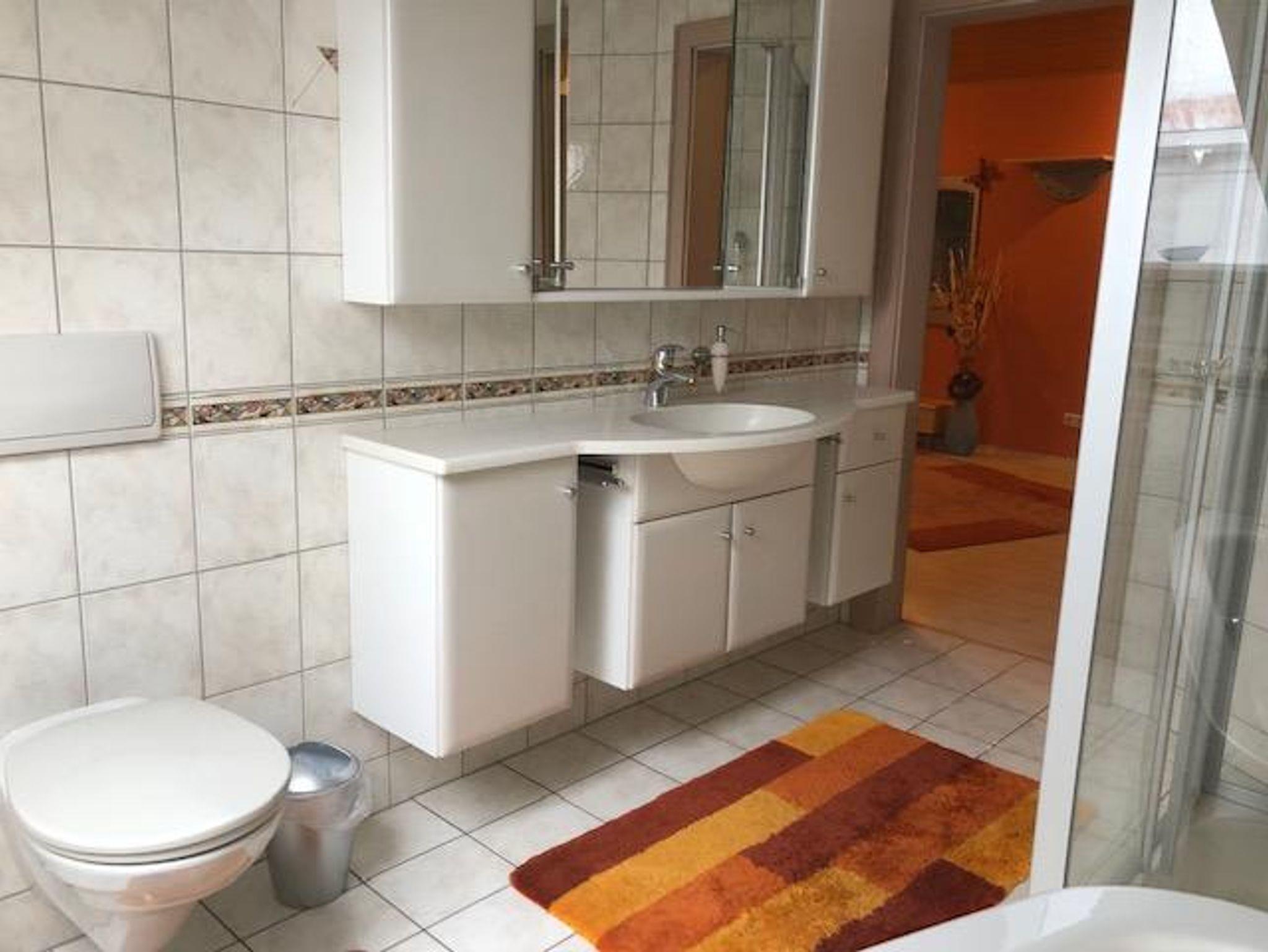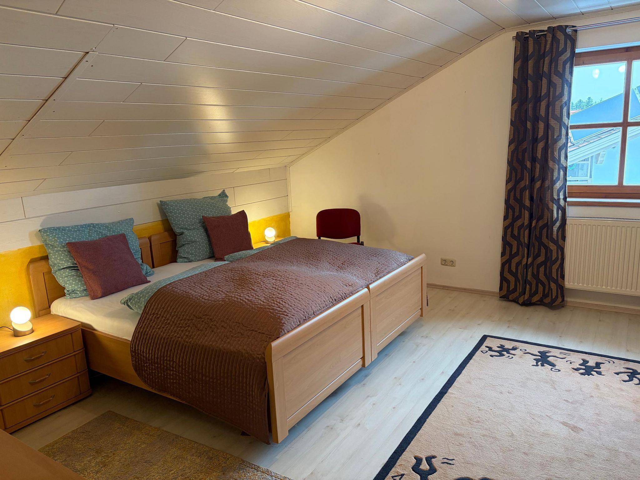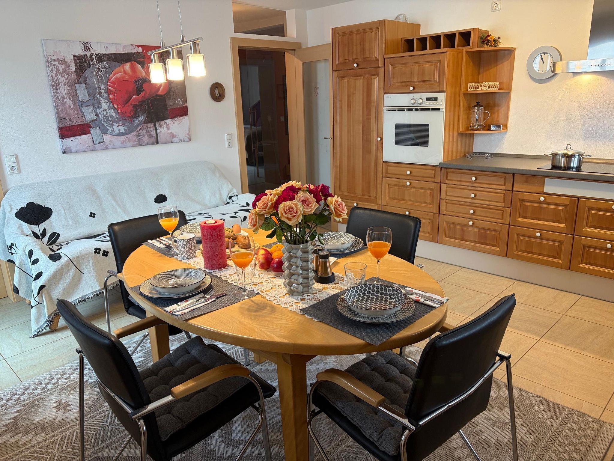 Sehr schöne lichtdurchflutete Ferienwohnung am Waldrand. Große Wohnküche mit kompletter Ausstattung inklusive einer Speisekammer. Sowohl Küche als auch Wohnzimmer ermöglichen Zugang zum weit überdachten großen Balkon an der Südseite. Im Wohnzimmer ist eine Eckcouch mit Tisch, Wohnwand mit TV, Schreibtisch mit Laptop am Internet. Die Wohnung verfügt über zwei Schlafräume mit je einem Doppelbett, Schrank und Sideboard. Alle Fenster in der Wohnung haben Rollos, teilweise mit Insektenschutzgitter. Des weiteren hat die Wohnung eine große Diele mit Garderobenmöbeln, ein voll ausgestattetes Badezimmer sowie ein extra WC.
