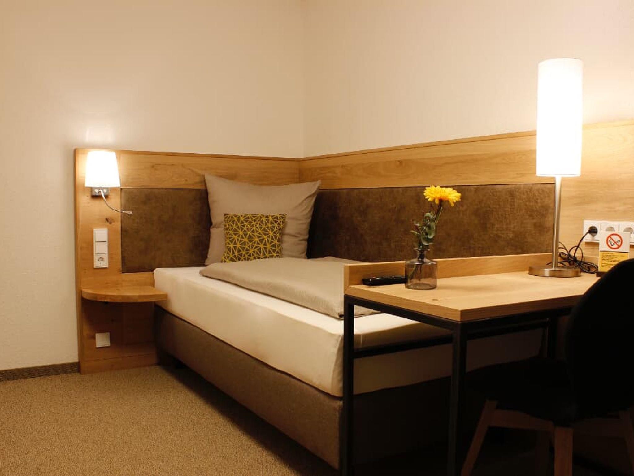 Unser stilvoll eingerichtetes Doppelzimmer mit Teppichboden ist 20 Quadratmeter groß. Im bequemen Doppelbett mit orthopädischer Matratze haben Sie einen erholsamen Schlaf. Des Weiteren verfügt das Zimmer über einen Schreibtisch und einen Flachbild-TV mit Kabelprogramm. Das moderne Badezimmer ist einer Regendusche, einem WC und einem Waschbecken ausgestattet. Kostenfreies WLAN empfangen Sie im gesamten Zimmer