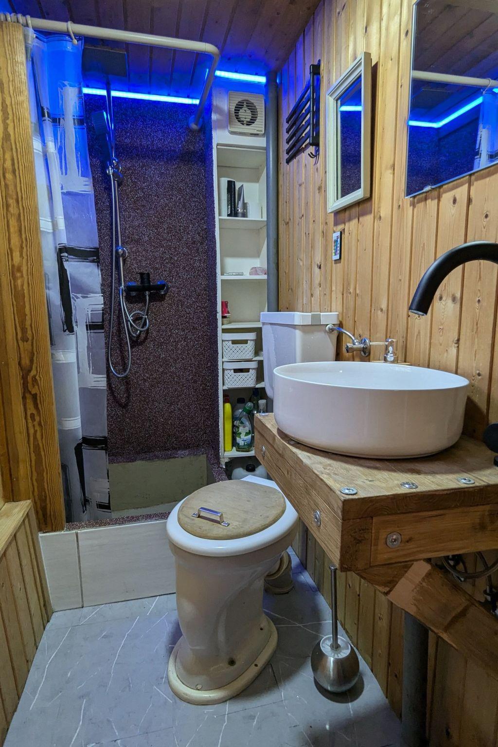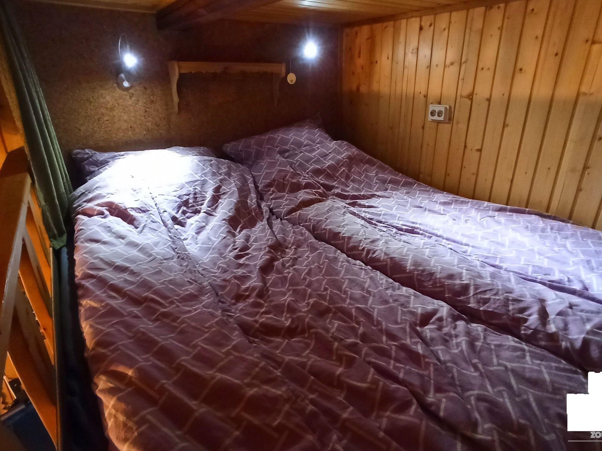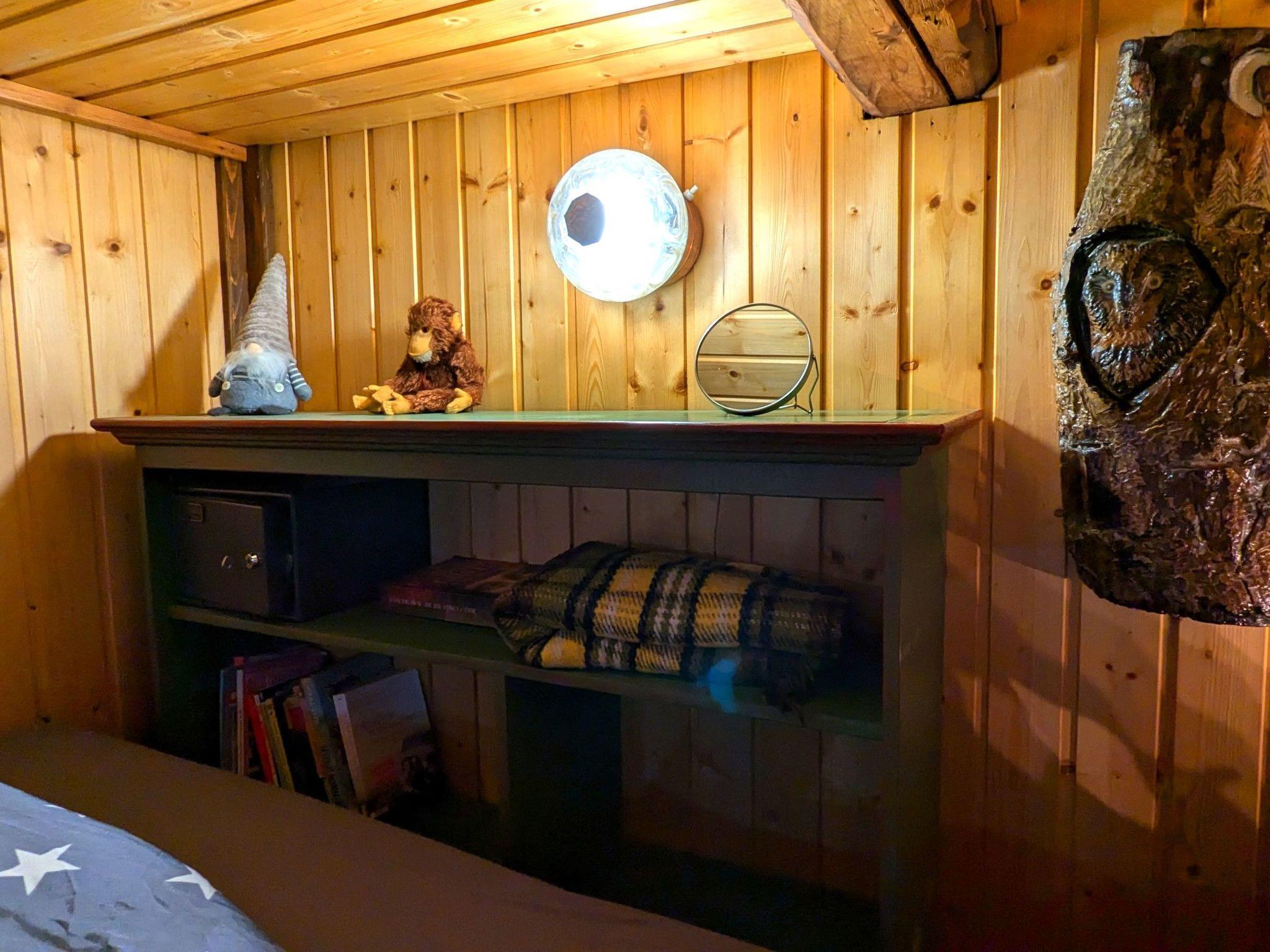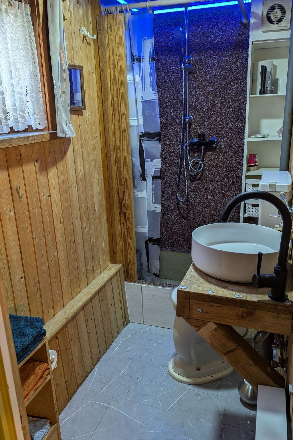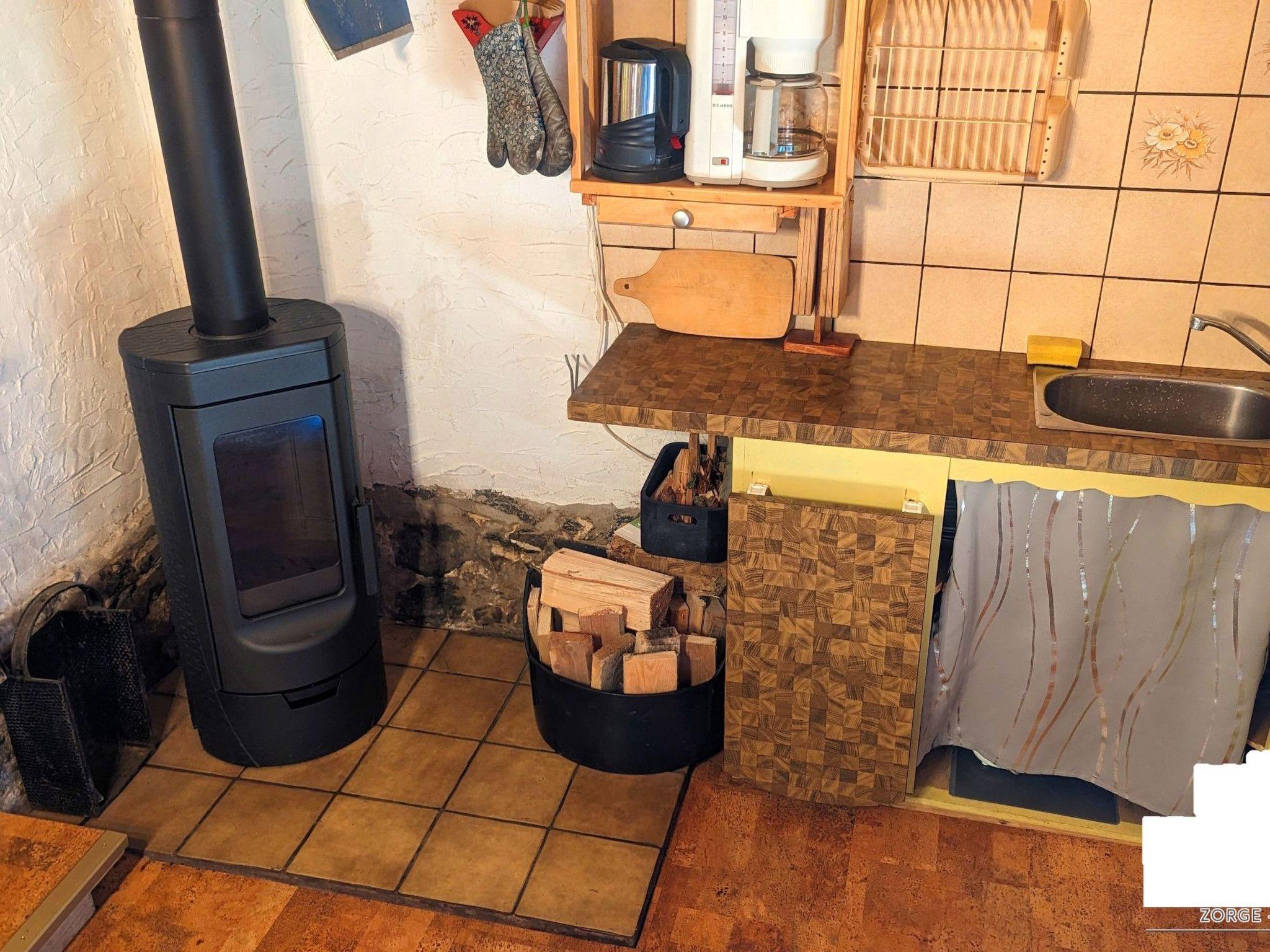 Inside Hütte Harzilein, a cosy living room with wood-burning stove welcomes you after a day exploring the area. A kitchenette equipped with a small fridge, combination microwave/oven and a 2-burner induction hob makes preparing meals easy. For lovers of conviviality, a gourmet and fondue set are available. The living room also has an HD TV with more than 300 satellite channels and a dining table for 4. Above the sitting area, accessible via a wooden ladder, you will find a cosy king-size double bunk bed. A separate compact bathroom with rain shower provides the necessary comfort.