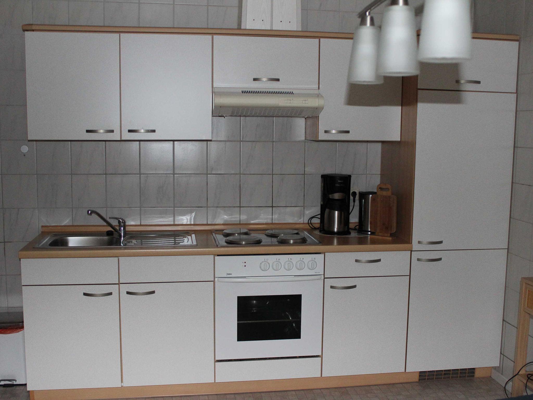 - einem Wohnzimmer mit Polstergarnitur, Essecke, Radio und TV sowie komplett eingerichteter Küchenzeile