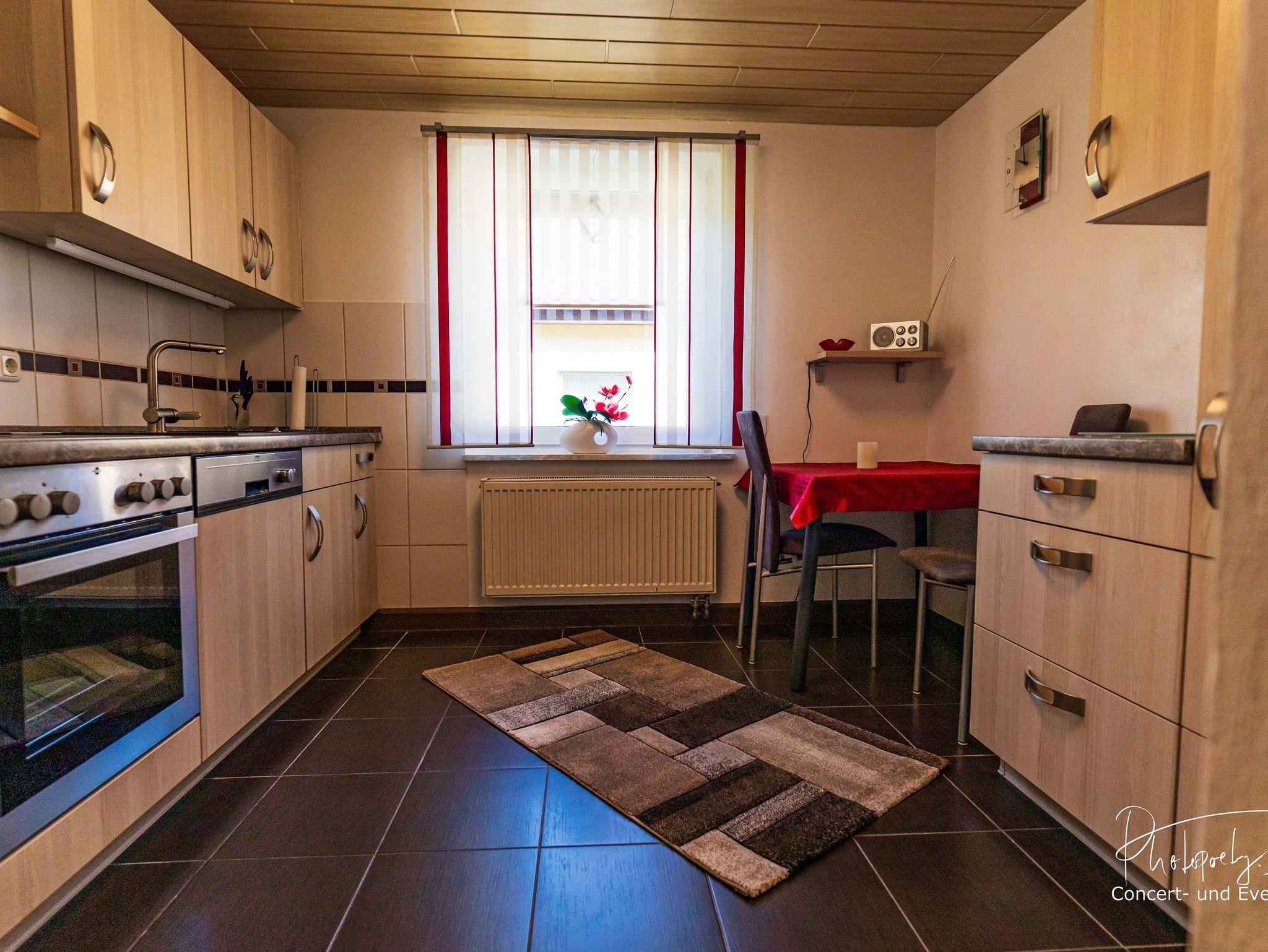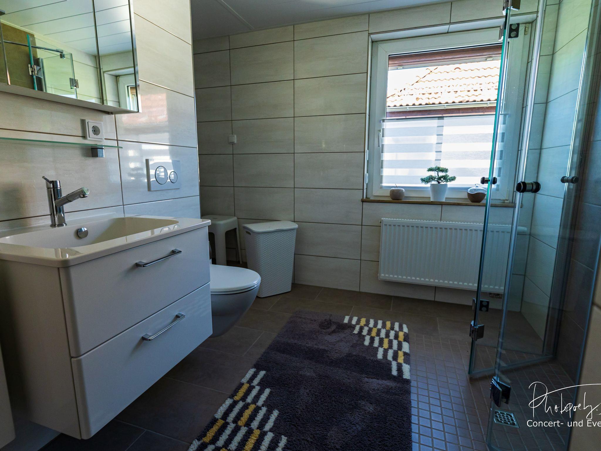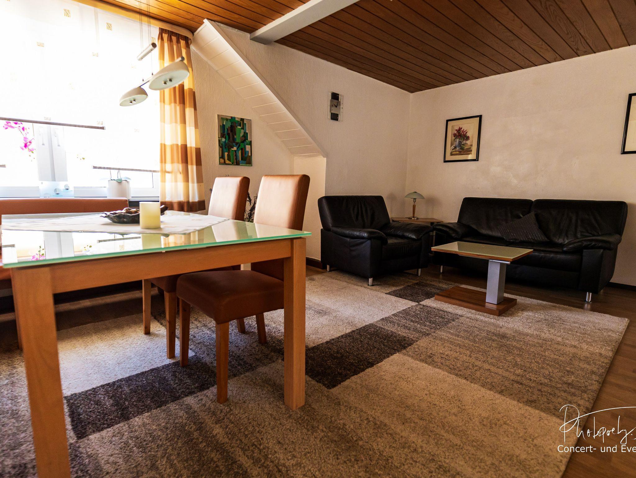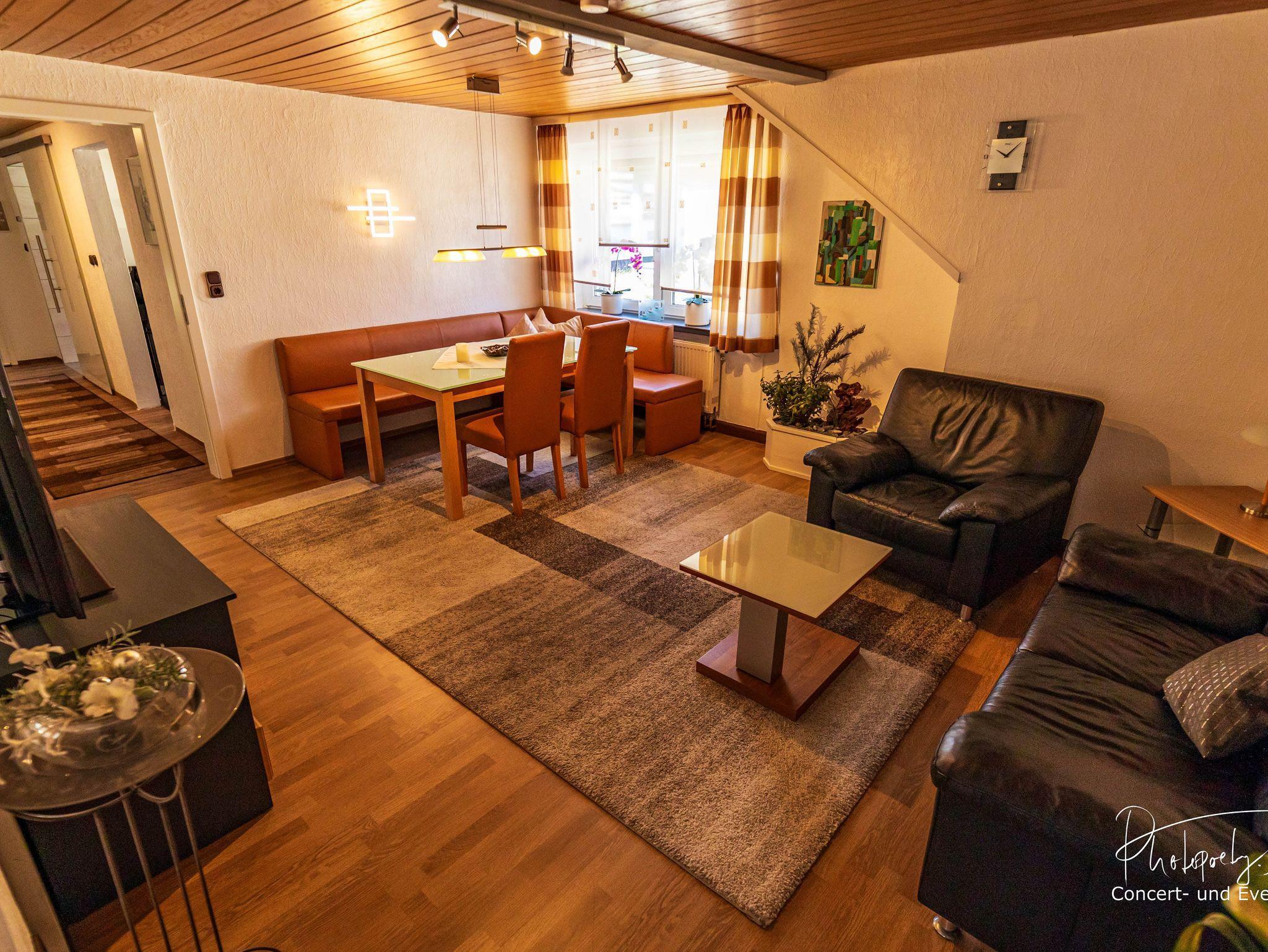 Unsere Ferienwohnung mit ca. 75qm Wohnfläche im Obergeschoss bietet Platz für 4 Personen. Das moderne und gemütliche Wohnzimmer mit Ledersofa, Flachbild-TV und Esstisch mit Sitzecke lädt zum Entspannen ein. Die komplett ausgestattete Küche mit Geschirrspüler, Kühlschrank inkl. Gefrierfach, Herd, Backofen, Wasserkocher, Eierkocher, Toaster und Filter-Kaffeemaschine lässt keine Wünsche offen. Die Ferienwohnung verfügt über zwei Schlafzimmer mit Doppelbett sowie zwei Einzelbetten. Das geräumige Badezimmer mit ebenerdiger Walk-in-Dusche aus Glas, Spiegelschrank, Föhn, Handtuchtrocker sowie Waschmaschine rundet das Gesamtbild ab. WLAN in der gesamten Wohnung sowie ein eigener Parkplatz vor dem Eingang und ein zusätzlicher Stellplatz vor dem Haus stehen kostenfrei zur Verfügung. Weiterhin verfügt das Haus über eine eigene Fahrradgarage mit Lademöglichkeit für E-Bikes. Im Garten können frische Kräuter zur Verfeinerung von Speisen verwendet werden. Zusätzlich gibt es auf Wunsch einen Lieferservice der örtlichen Bäckerei.