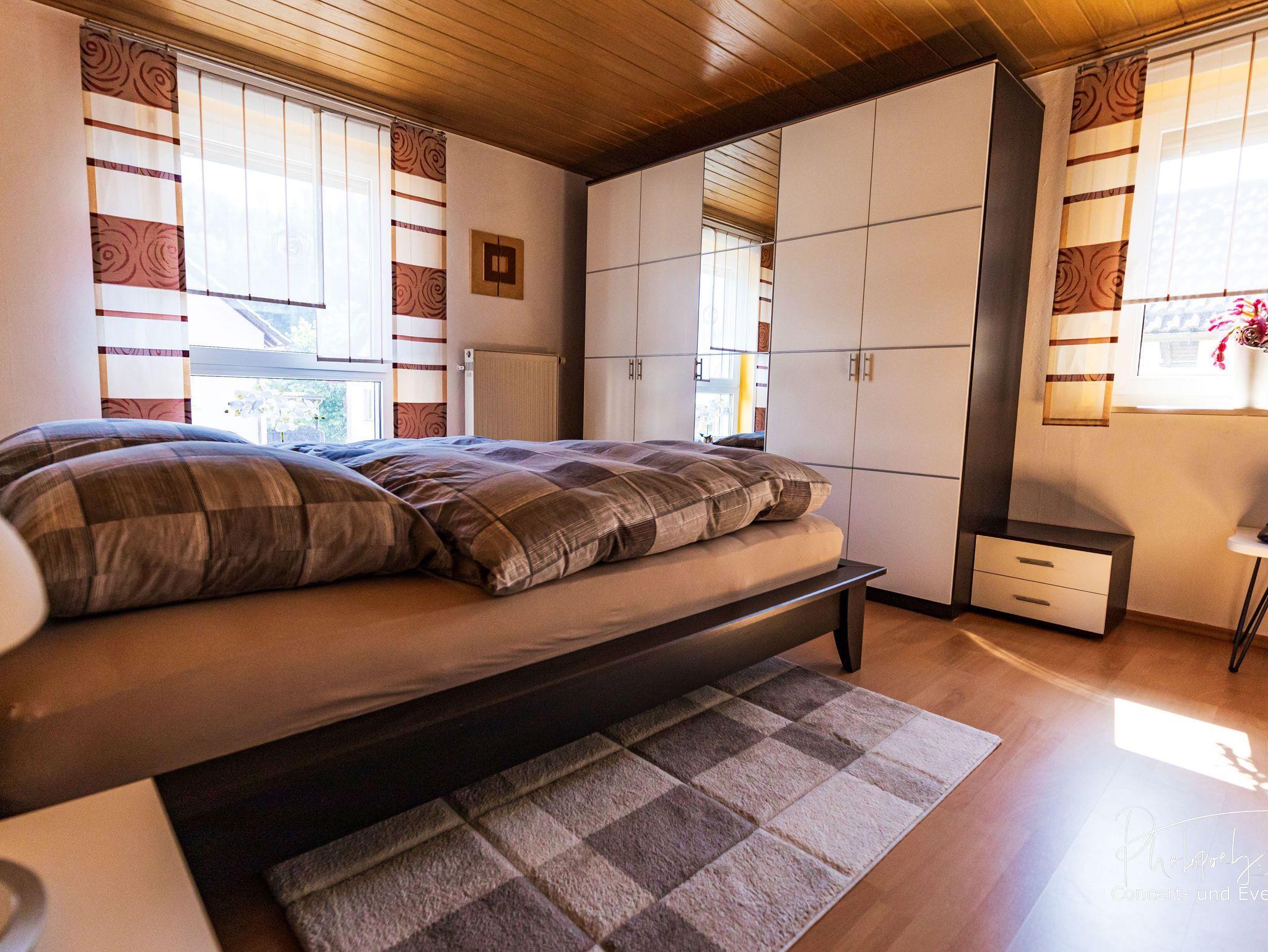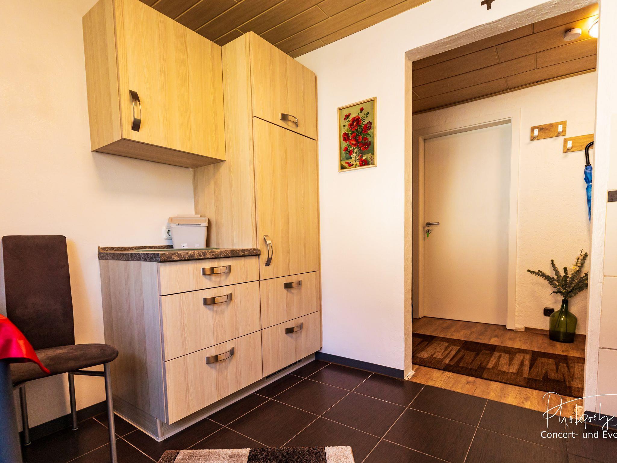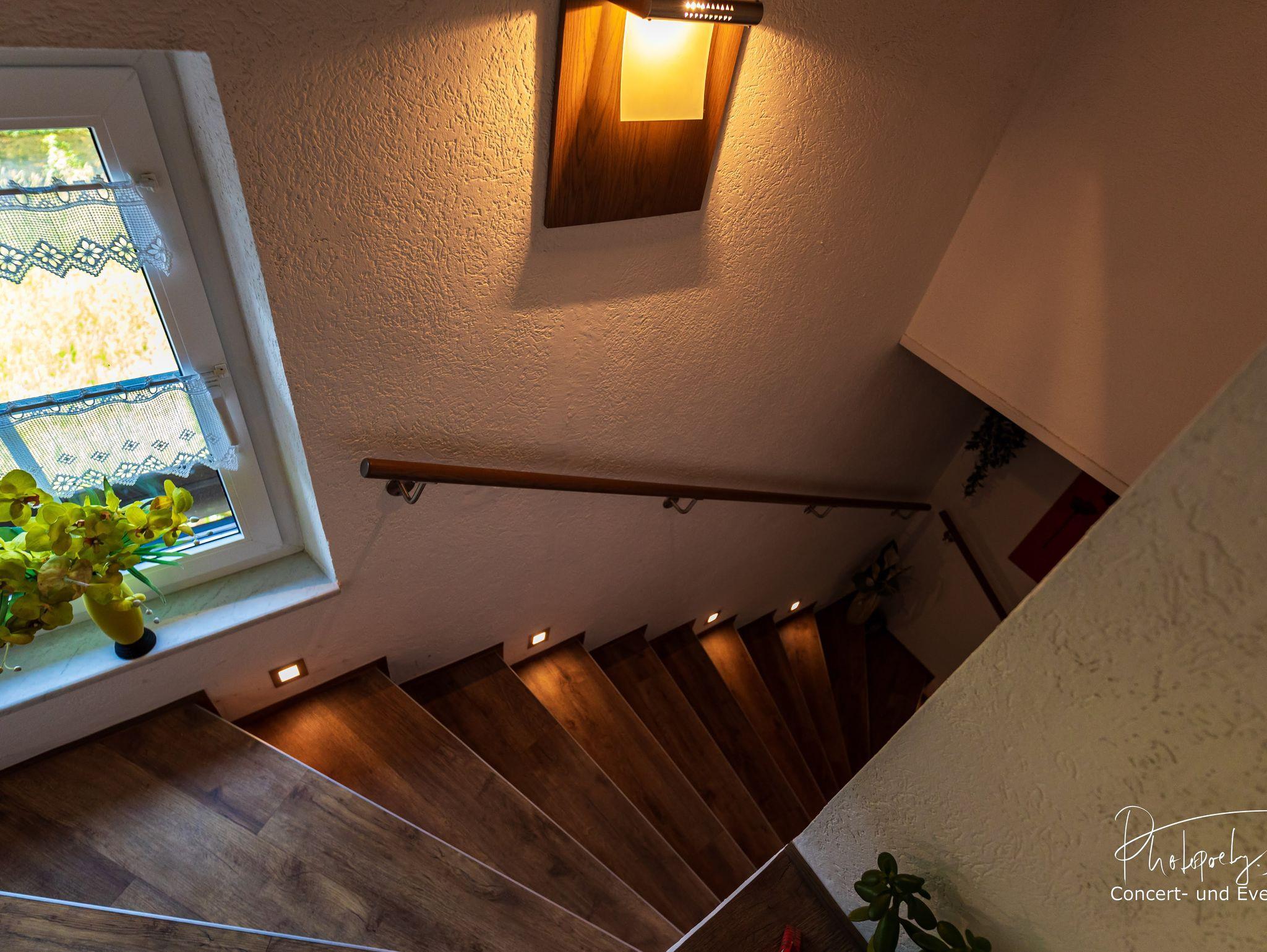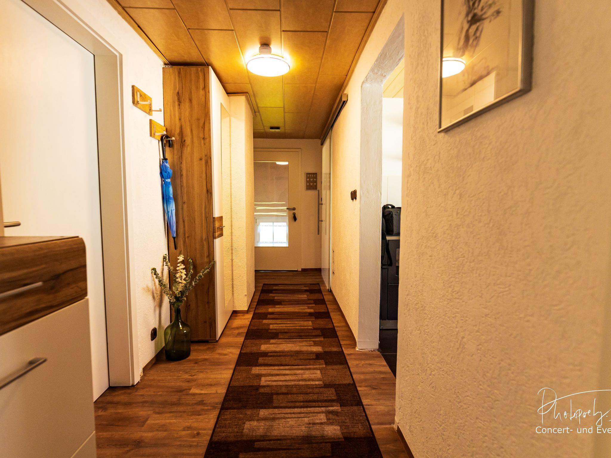 Unsere Ferienwohnung mit ca. 75qm Wohnfläche im Obergeschoss bietet Platz für 4 Personen. Das moderne und gemütliche Wohnzimmer mit Ledersofa, Flachbild-TV und Esstisch mit Sitzecke lädt zum Entspannen ein. Die komplett ausgestattete Küche mit Geschirrspüler, Kühlschrank inkl. Gefrierfach, Herd, Backofen, Wasserkocher, Eierkocher, Toaster und Filter-Kaffeemaschine lässt keine Wünsche offen. Die Ferienwohnung verfügt über zwei Schlafzimmer mit Doppelbett sowie zwei Einzelbetten. Das geräumige Badezimmer mit ebenerdiger Walk-in-Dusche aus Glas, Spiegelschrank, Föhn, Handtuchtrocker sowie Waschmaschine rundet das Gesamtbild ab. WLAN in der gesamten Wohnung sowie ein eigener Parkplatz vor dem Eingang und ein zusätzlicher Stellplatz vor dem Haus stehen kostenfrei zur Verfügung. Weiterhin verfügt das Haus über eine eigene Fahrradgarage mit Lademöglichkeit für E-Bikes. Im Garten können frische Kräuter zur Verfeinerung von Speisen verwendet werden. Zusätzlich gibt es auf Wunsch einen Lieferservice der örtlichen Bäckerei.