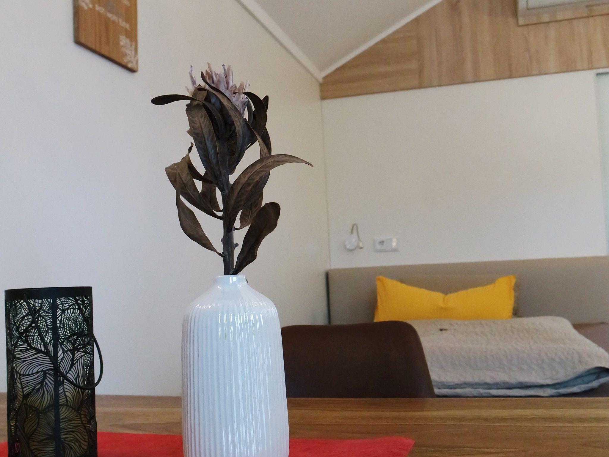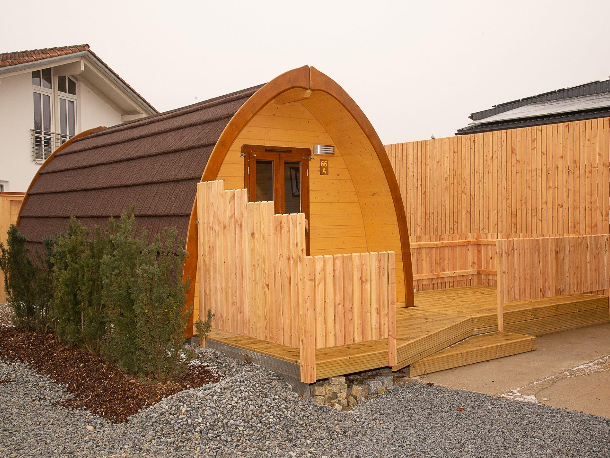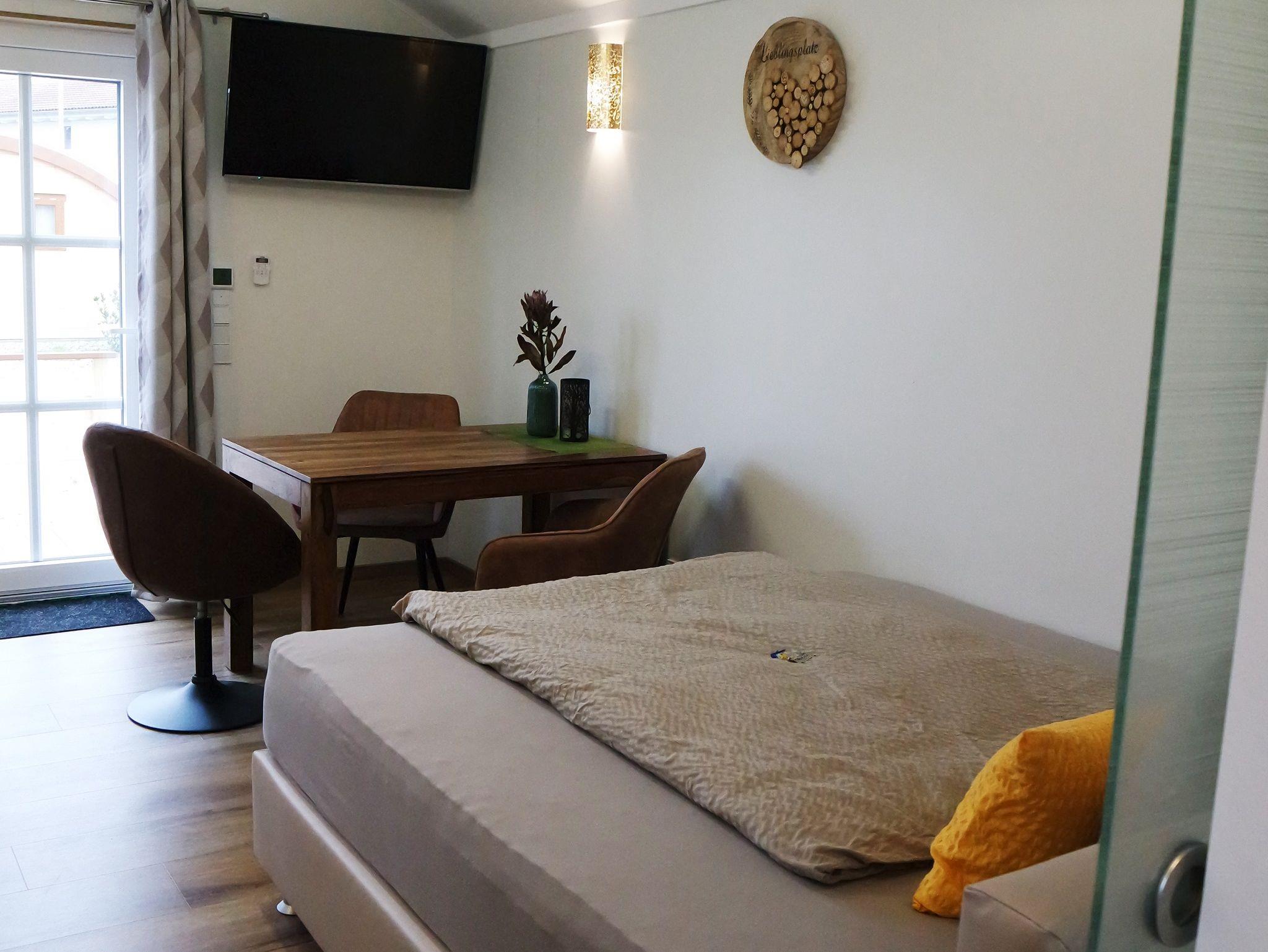 Der kombinierte Wohn- und Schlafraum des Neubaus ist mit einem komfortablen Boxspringbett, Tisch und Stühle, einem TV und vielem mehr ausgestattet. Auch eine komplett ausgestattete Küchenzeile ist vorhanden. Für Kinder kann ein Zustellbett eingestellt werden. Das Highlight im Bad ist die großräumige Regendusche.