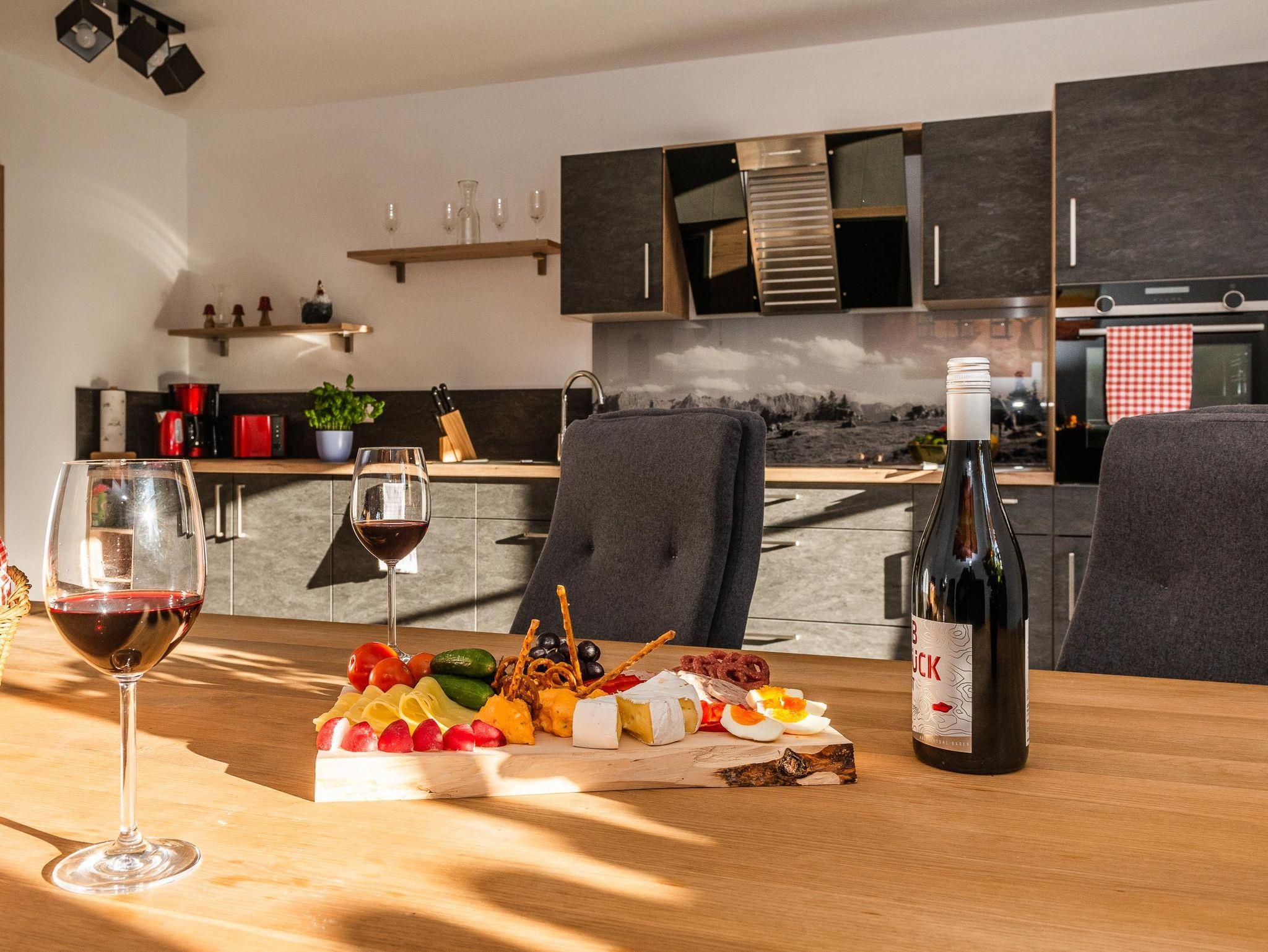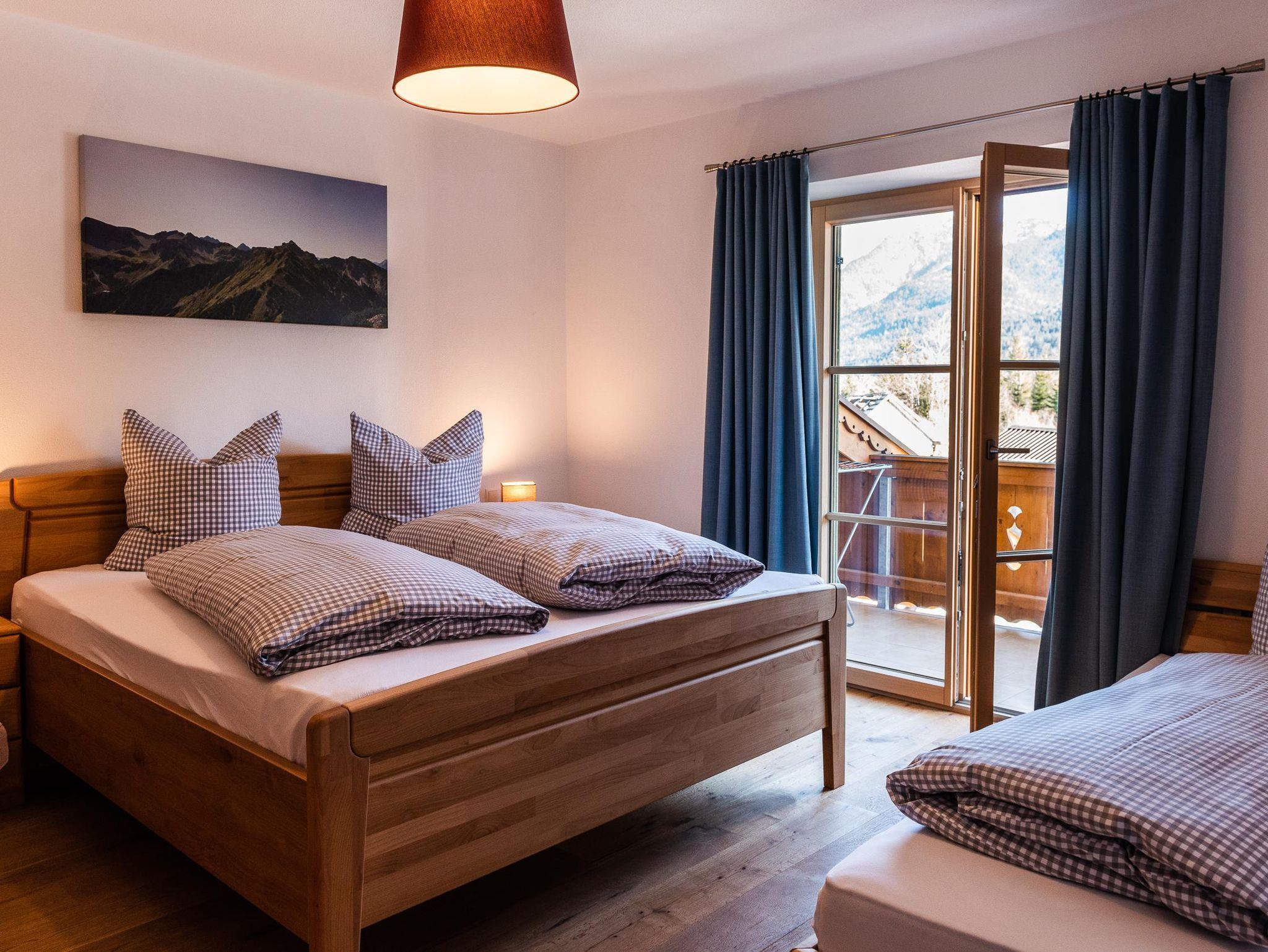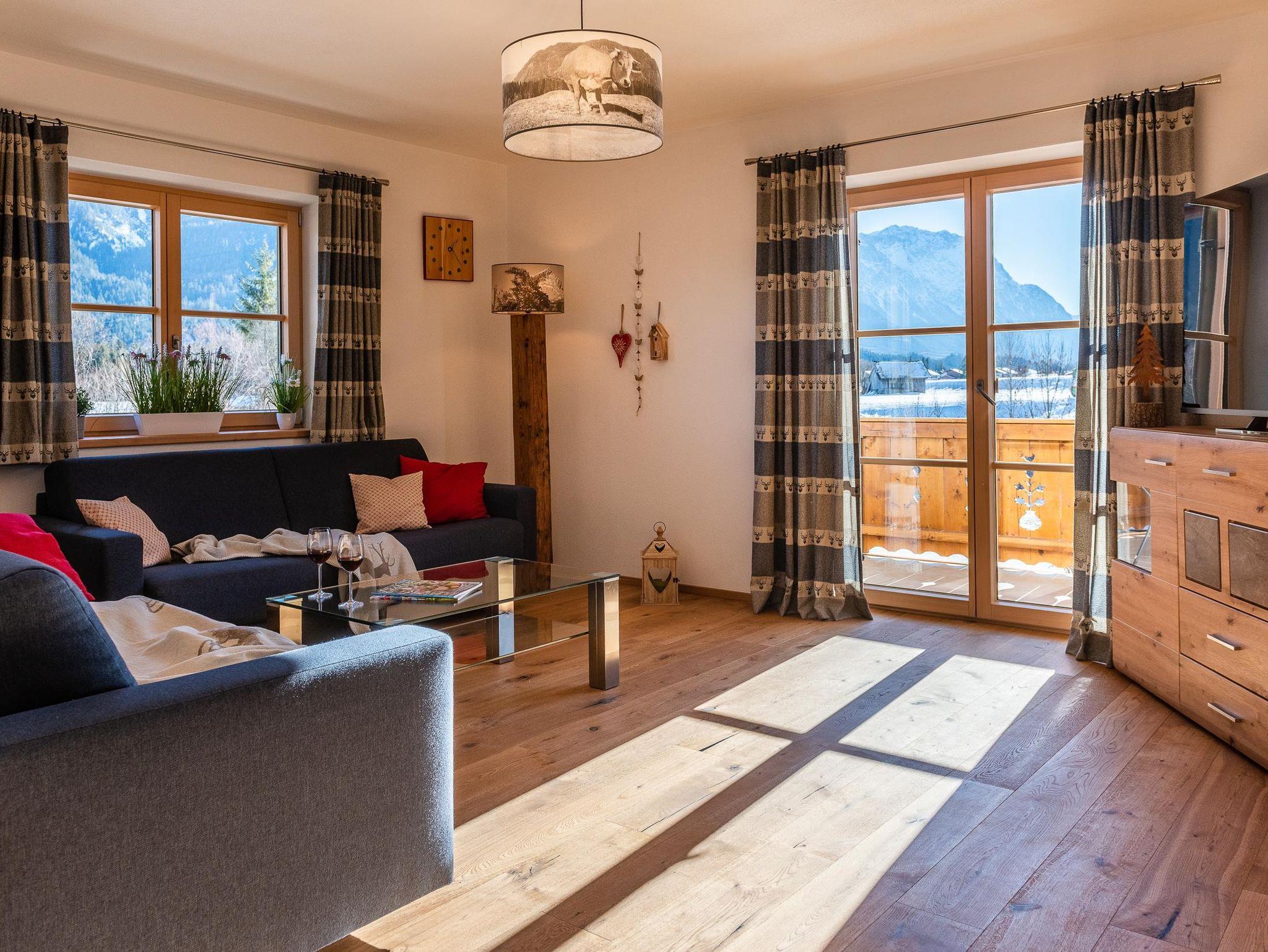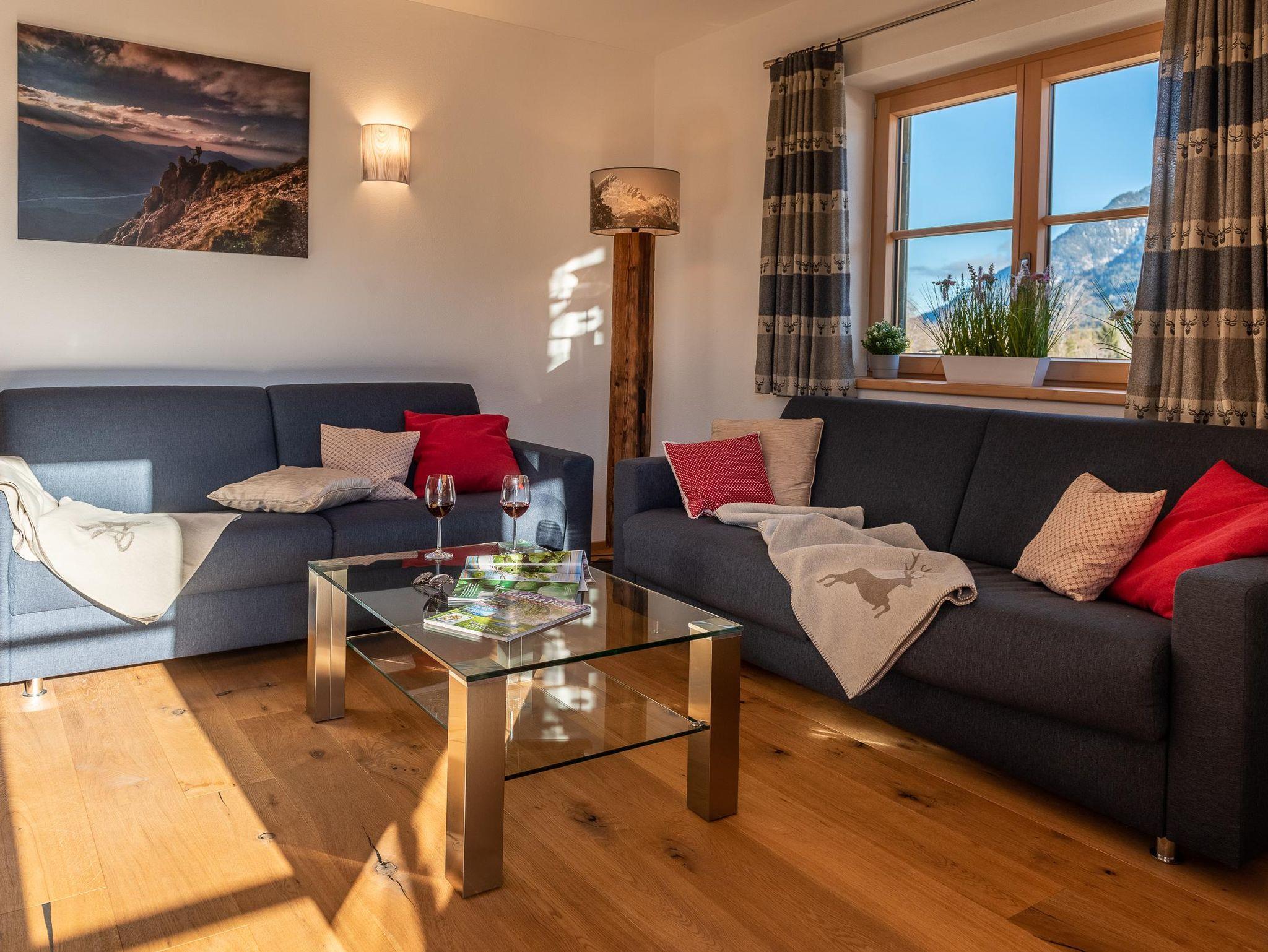 Unsere gemütliche und sehr hochwertig eingerichtet Ferienwohnung im Ländlichen Stil mit 90 m² Wohnfläche befindet sich im 1.Stock und bietet Platz für 1-5 Personen. Die komplett ausgestattete Wohnküche mit Geschirrspüler, Kühlschrank, Herd, Backofen, Wasserkocher und Kaffeemaschine lässt keine Wünsche offen, eine gemütliche Essgruppe rundet das Gesamtbild ab. Im Wohnzimmer befindet sich ein Flachbildfernseher, eine urige Bar und hat einen direkten Zugang zum großen Südost Balkon mit einzigartigem Blick auf das Karwendelgebirge. Die Ferienwohnung verfügt insgesamt über 2 Schlafzimmer, davon ein Schlafzimmer mit einem Doppelbett und ein Schlafzimmer mit einem Doppelbett und einem Einzelbett. Das barrierefreie Badezimmer verfügt über eine Dusche, Badewanne und ein WC. Bettwäsche, Handtücher, kostenfreie WLAN-Nutzung, Parkplatz und Endreinigung sind im Preis enthalten.