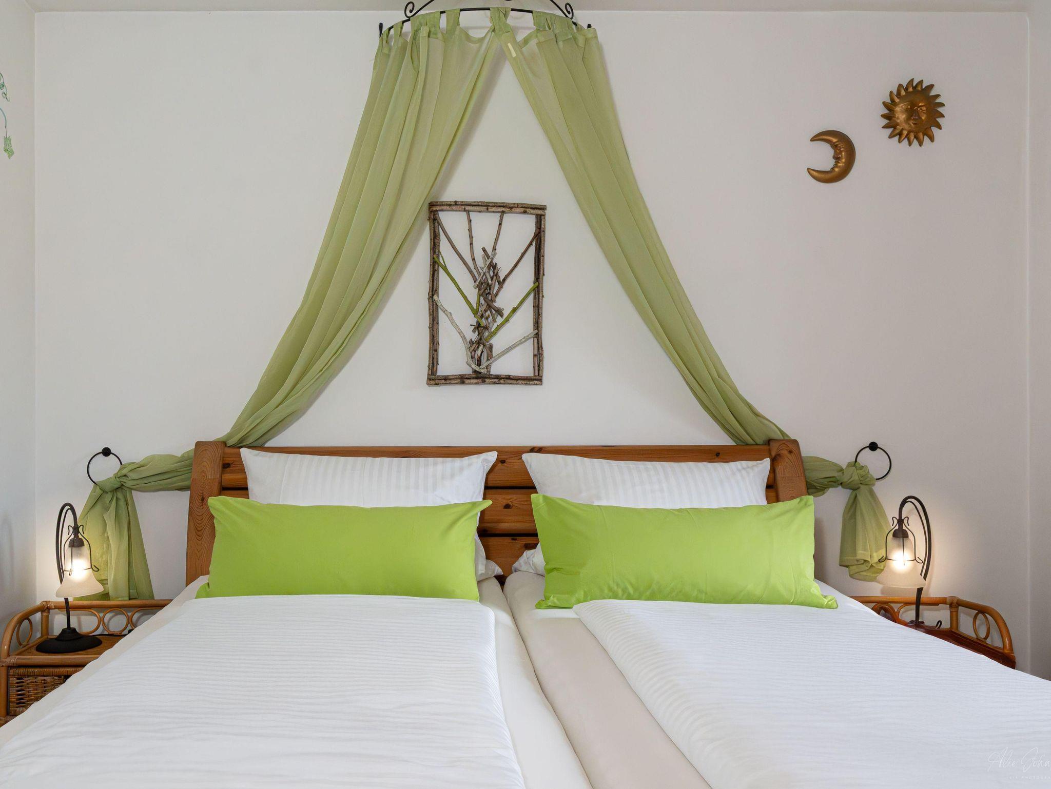 Gemütliche Wohnung im zweiten Stock mit separater, voll ausgestatteter Küche, ruhigem Schlafzimmer mit Doppelbett und Balkonzugang. Freundlicher Wohnraum mit Couch/Schlafcouch, Sessel, Smart-TV, Esstisch, Eckbank und Stühlen. Badezimmer mit WC, Waschbecken, Dusche und Fenster.