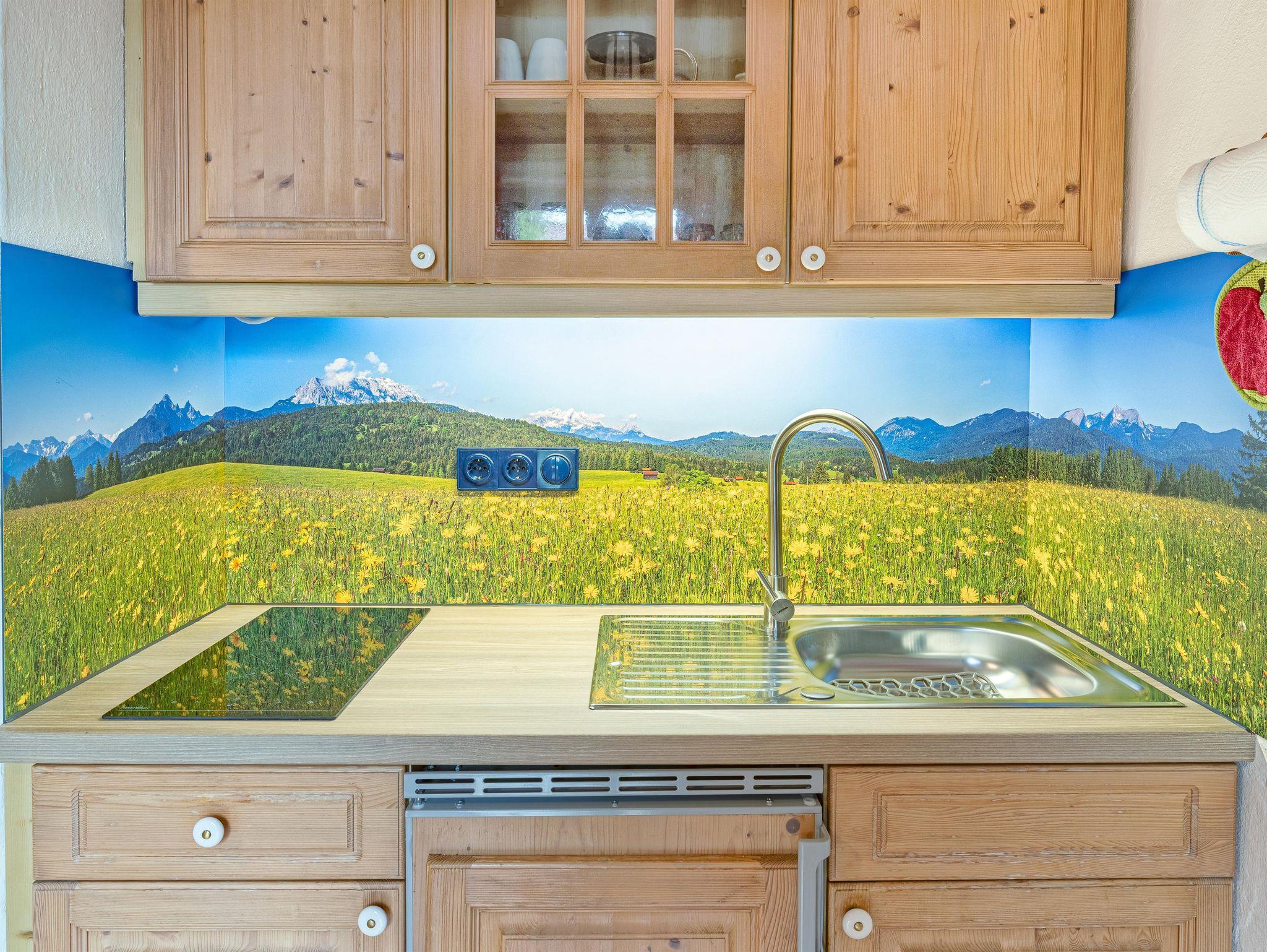 Gemütliche Wohnküche mit Essplatz, Flachbild-SAT-TV, Küchenzeile mit 2-Plattenceranfeld, Minibackofen, Mikrowelle, Kühlschrank, Filterkaffeemaschine, Toaster, Küchenrolle und Wasserkocher. Zugang zur grossen Südwest-Terrasse mit Gartenmöbel und herrlichem Bergblick. Schlafbereich mit Doppelbett und Kleiderschrank. Bad mit Dusche, Waschbecken, WC, Toilettenpapier und Fön.