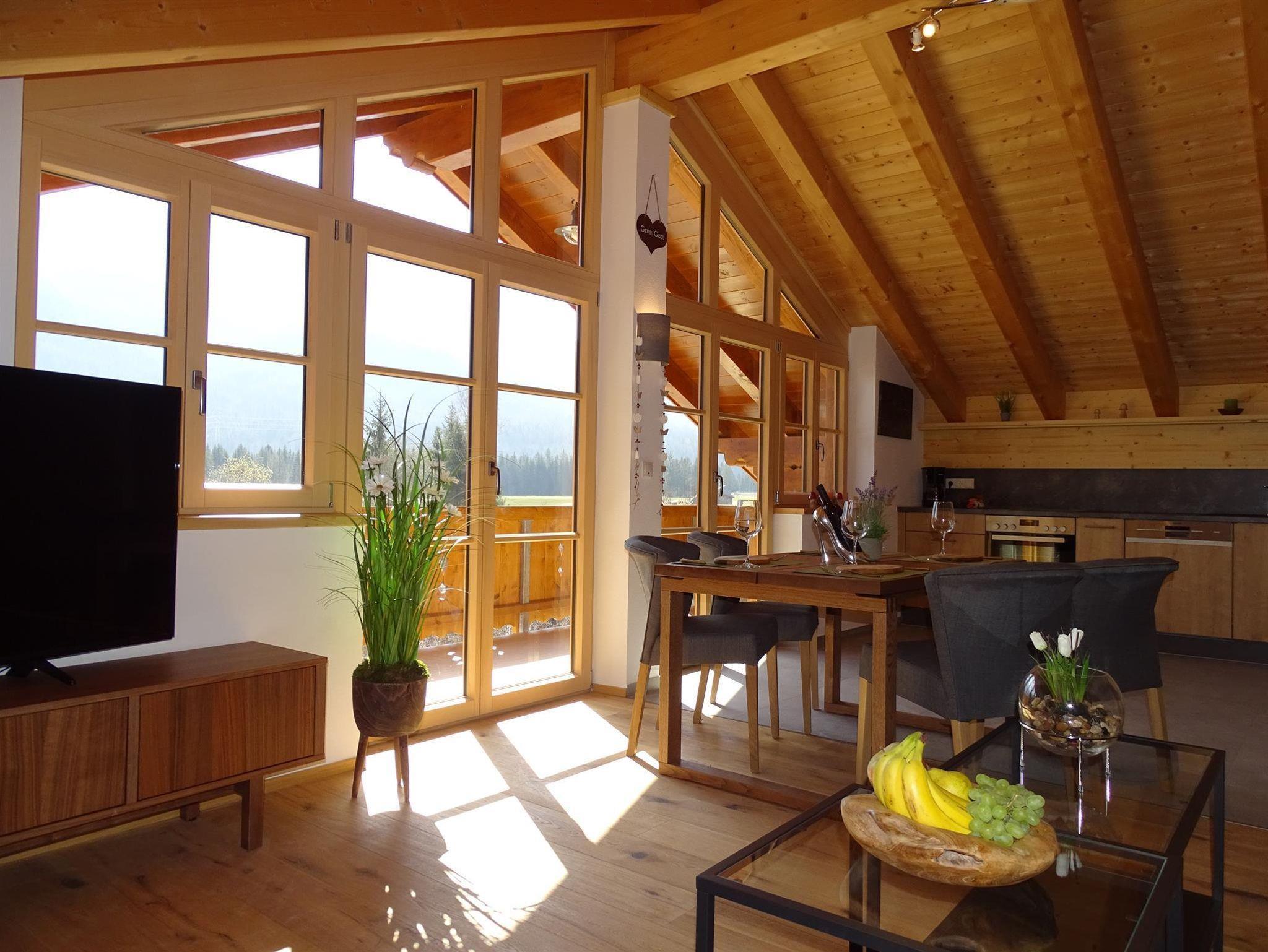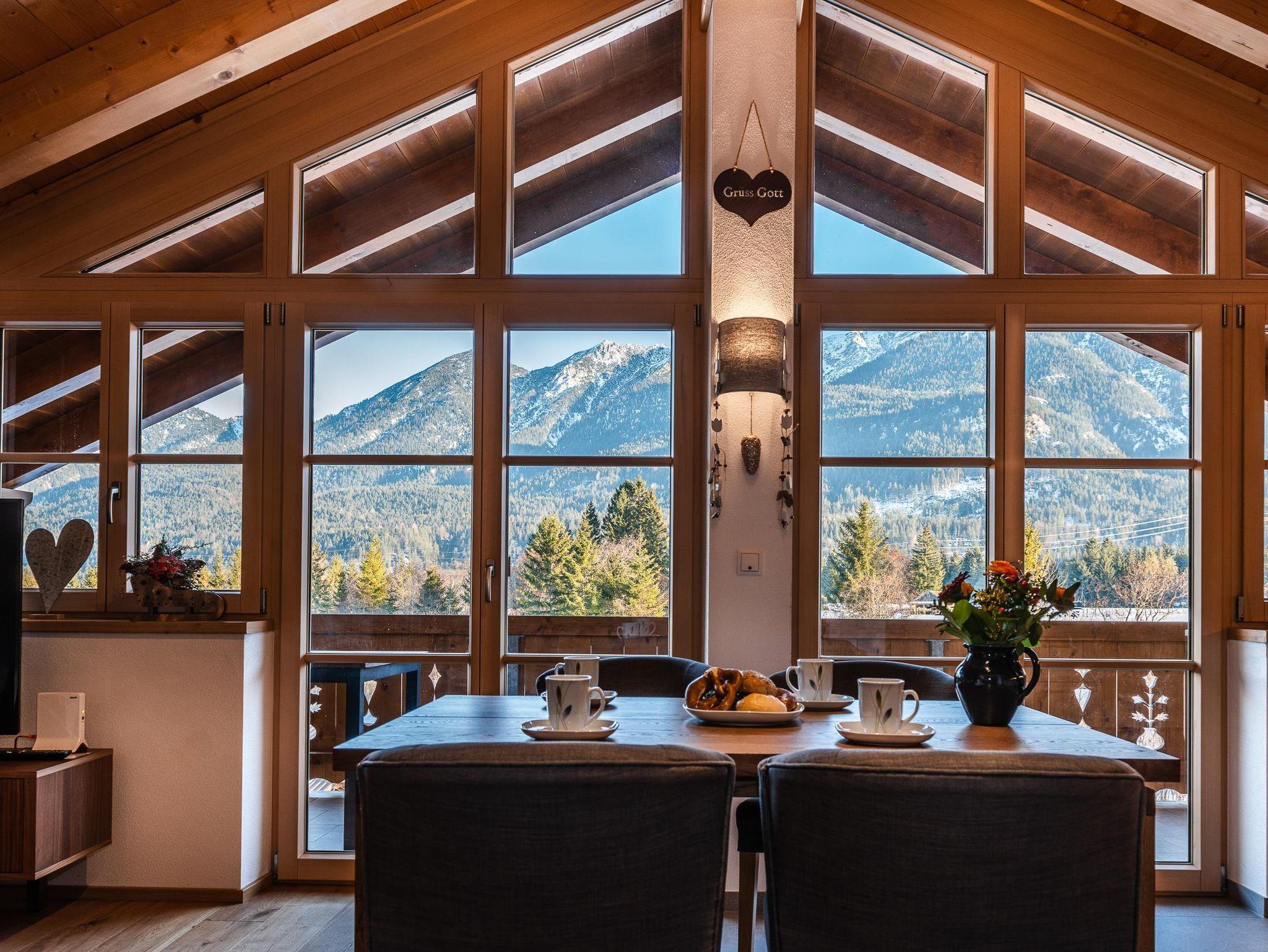 Unsere gemütliche Ferienwohnung im ländlichen Stil mit 70 m² Wohnfläche befindet sich im 2.Stock und bietet Platz für 1-5 Personen. Die komplett ausgestattete Wohnküche mit Geschirrspüler, Kühlschrank, Herd, Backofen, Mikrowelle, Wasserkocher und Kaffeemaschine lässt keine Wünsche offen. In der Wohnküche befindet sich eine gemütliche Essgruppe mit einzigartigem Panoramablick auf das Karwendelgebirge. Die Ferienwohnung verfügt insgesamt über 2 Schlafzimmer, davon ein Schlafzimmer mit einem Doppelbett und ein Schlafzimmer mit einem Doppelbett und einem Einzelbett. Der Wohnraum verfügt über einen TV 55 Zoll und einer gemütlichen Couchgarnitur, die das Gesamtbild abrunden. Vor allem im Sommer können Sie entspannte Abende auf dem großen Südost Balkon ausklingen lassen. Das barrierefreie Badezimmer verfügt über eine Dusche und ein WC. Bettwäsche, Handtücher, kostenfreie WLAN-Nutzung, Parkplatz und Endreinigung sind im Preis enthalten.