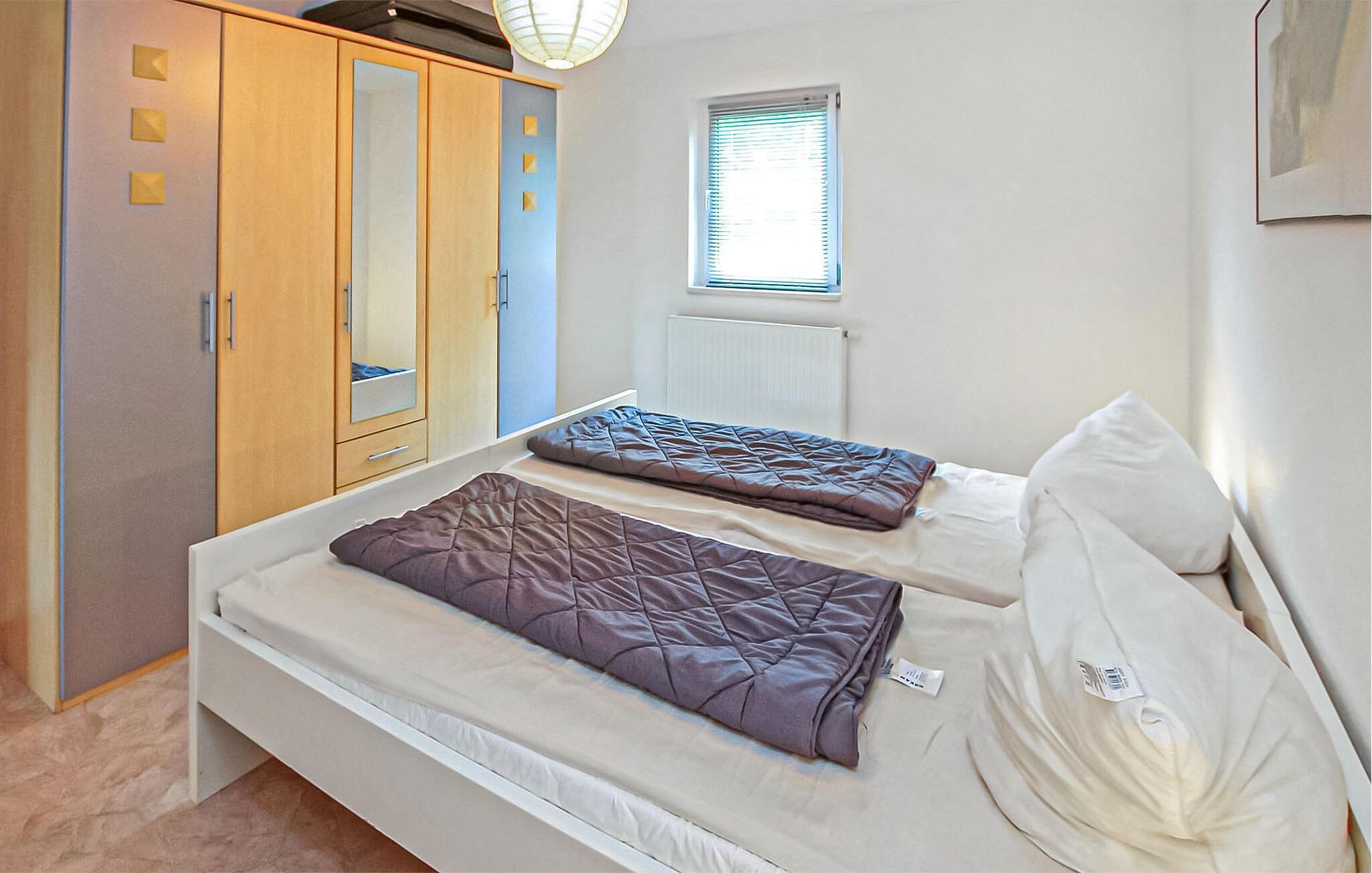 Bare noen få skritt unna og med utsikt til Großer Kressiensee med sin vakre badeplass, ligger det to ferieleiligheter på en egen tomt på ca. 700 m² i den fremre delen av et rekkehus. I den bakre delen av huset er det ytterligere ferieboliger. Dette er en av to røykfrie leiligheter med egen inngang (en av dem via utvendig trapp), sentralvarme, insektsnett på vinduene, stue med spiseplass, fullt utstyrt kjøkken, to soverom, bad med dusj/WC og terrasse eller balkong. Det er også en parkeringsplass, grill, barneseng og barnestol på forespørsel og robåt på forespørsel. Totalprisen inkluderer sluttrengjøring, sengetøy og håndklær samt vann- og energiforbruk.