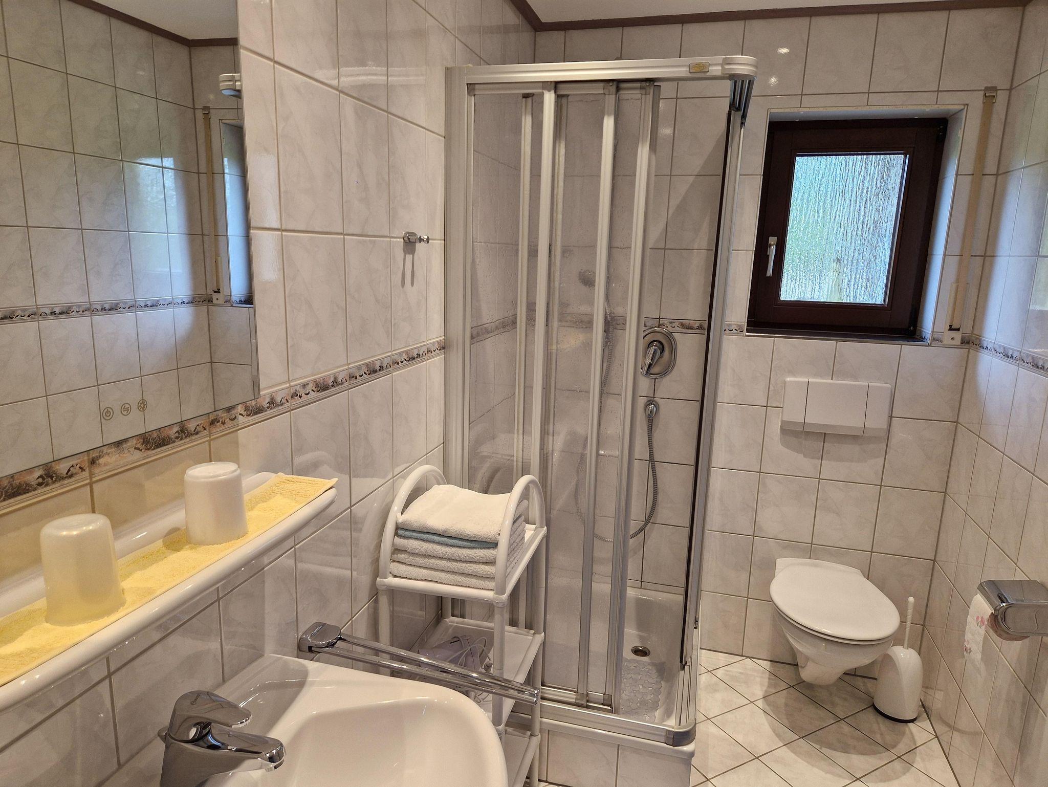 Die Dusche verfügt über einen Behindertensitz. Handtücher sind vorhanden und gehören zu unserem Service.
