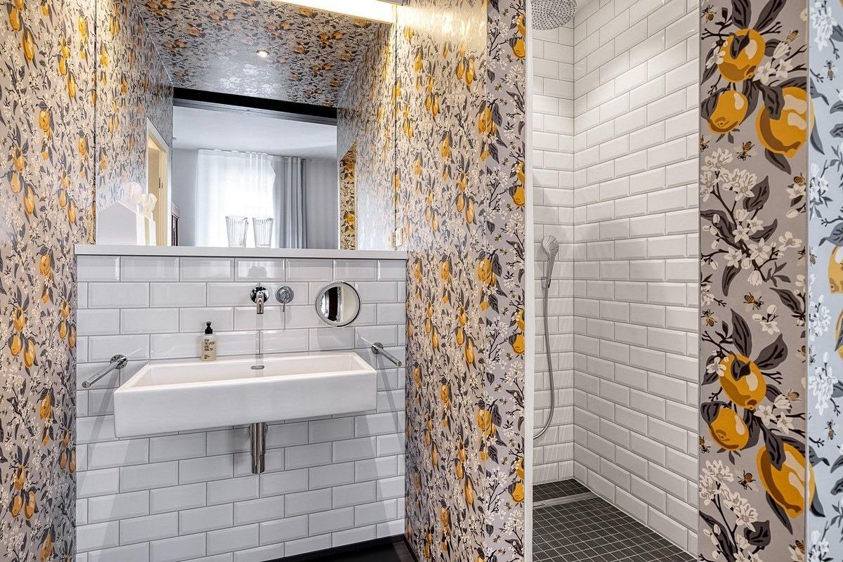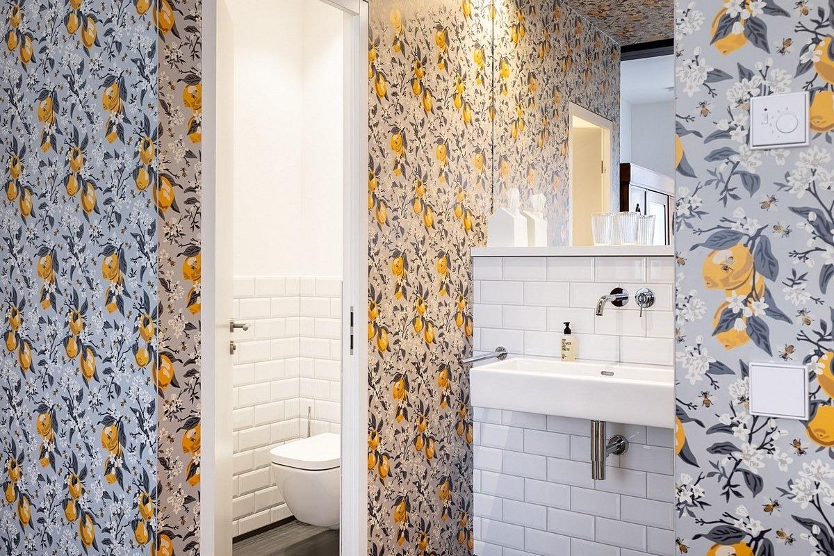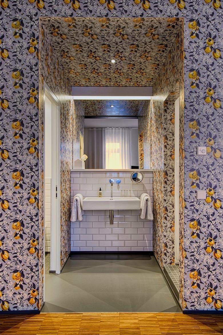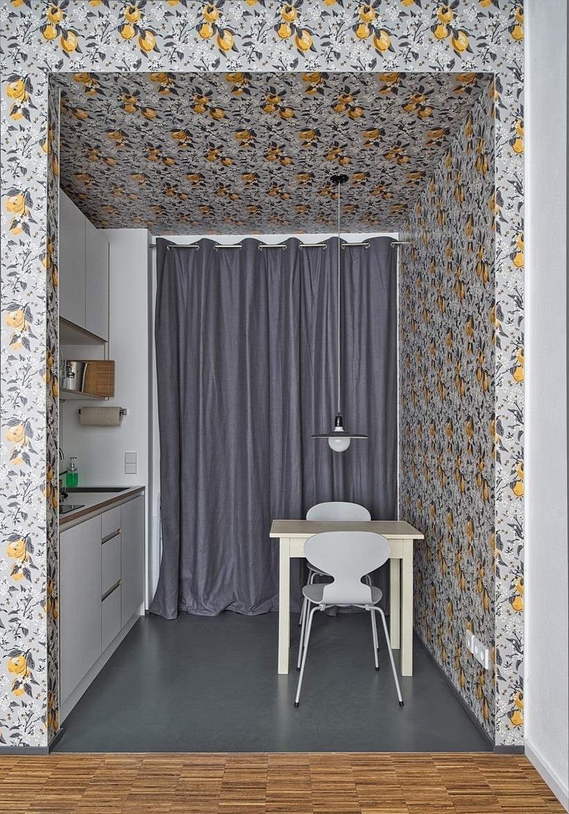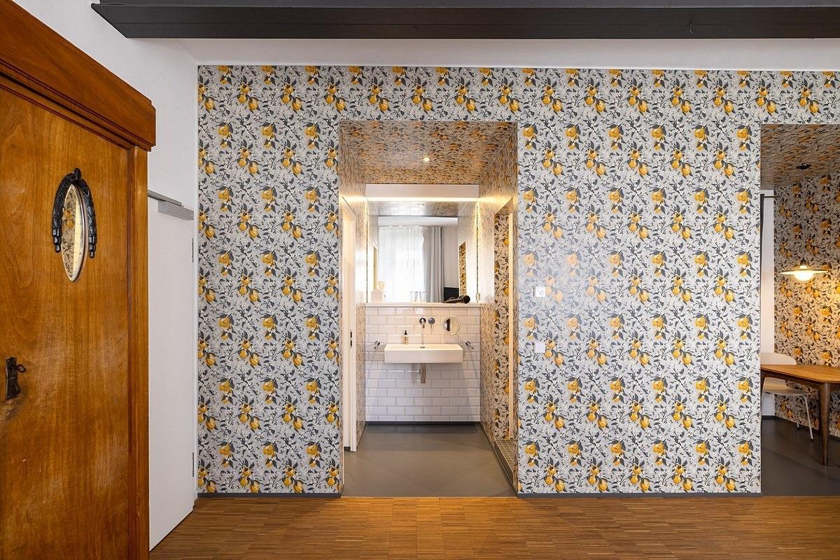 b) sachlich weiße Wand mit lässiger Bienentapete in und um Bad und Küche (1972).