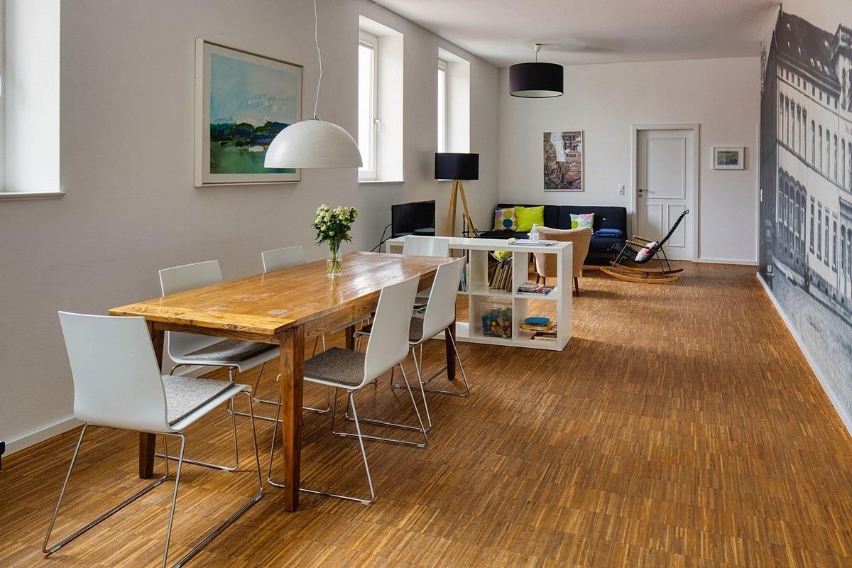 Zum Wohnen treffen sich alle vier bis sechs im geräumigen Koch-, Ess- und Wohnbereich (zum kochen, essen und wohnen) - wie, wo und für was auch immer: Es gibt reichlich Platz für alle. Parkettboden und weiße Wände, schlicht-modern-geschmackvolle Einrichtung und hohe Decken, toller Raum.