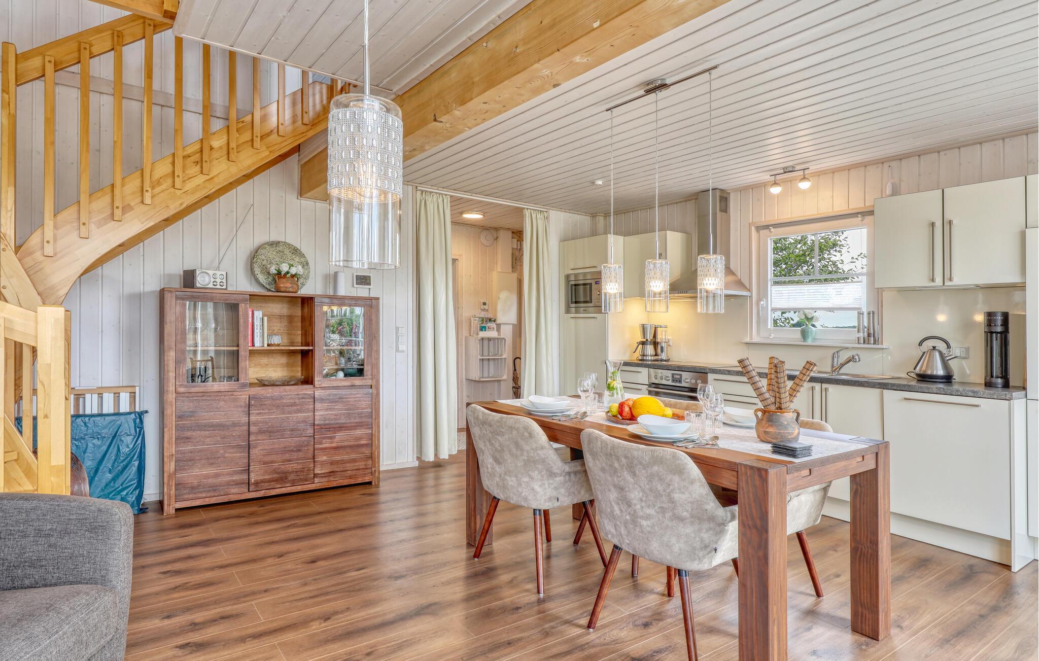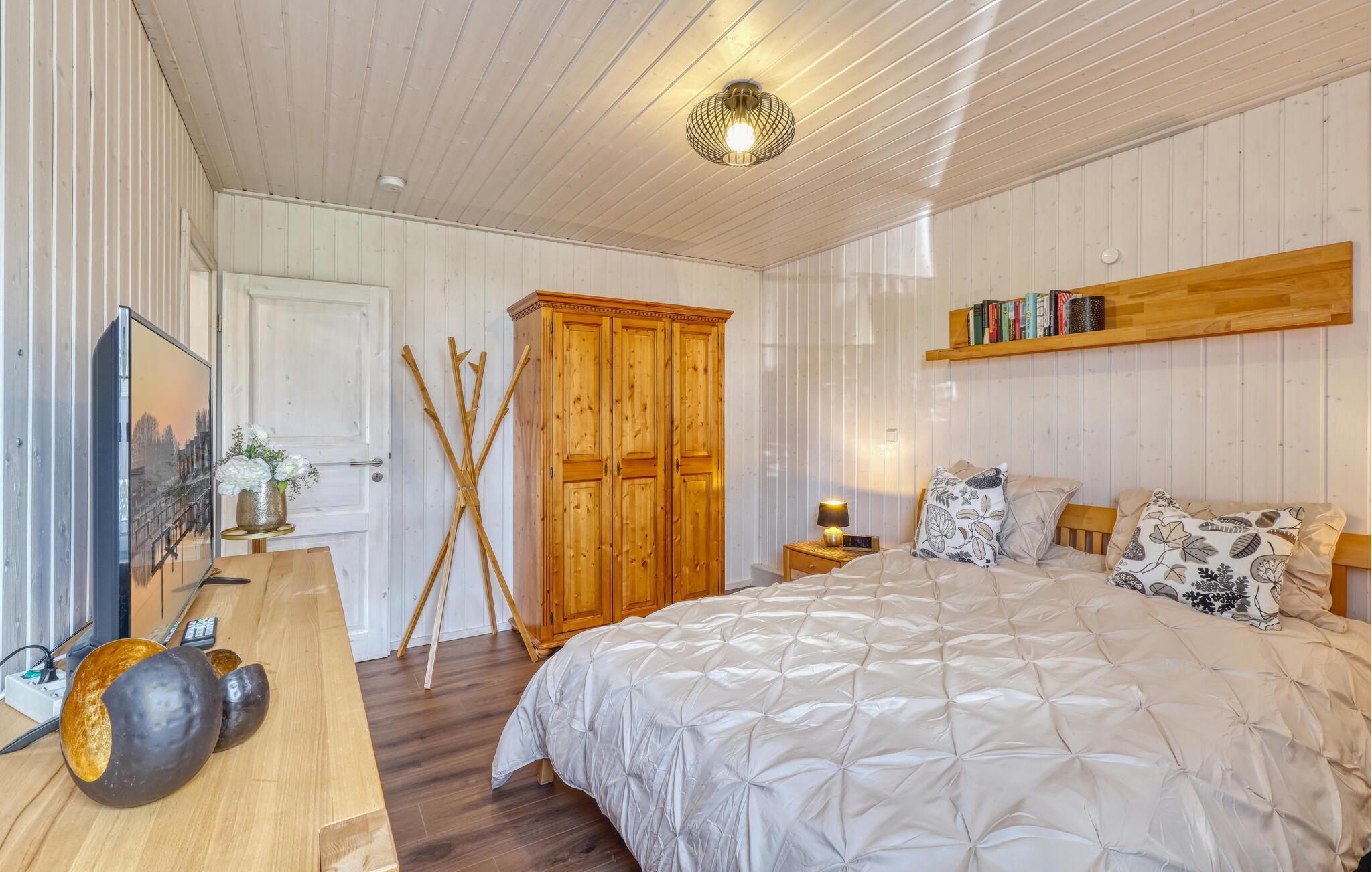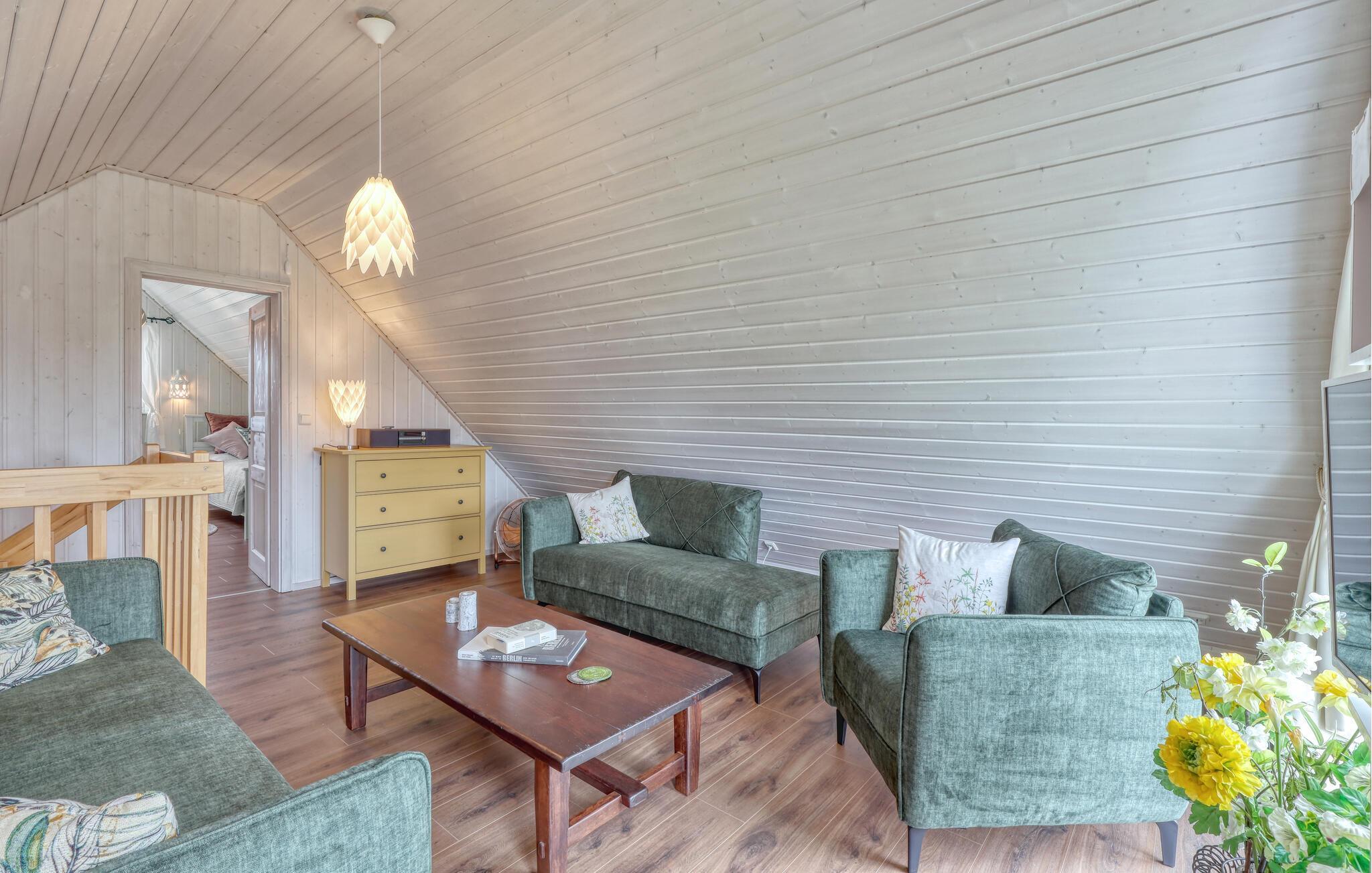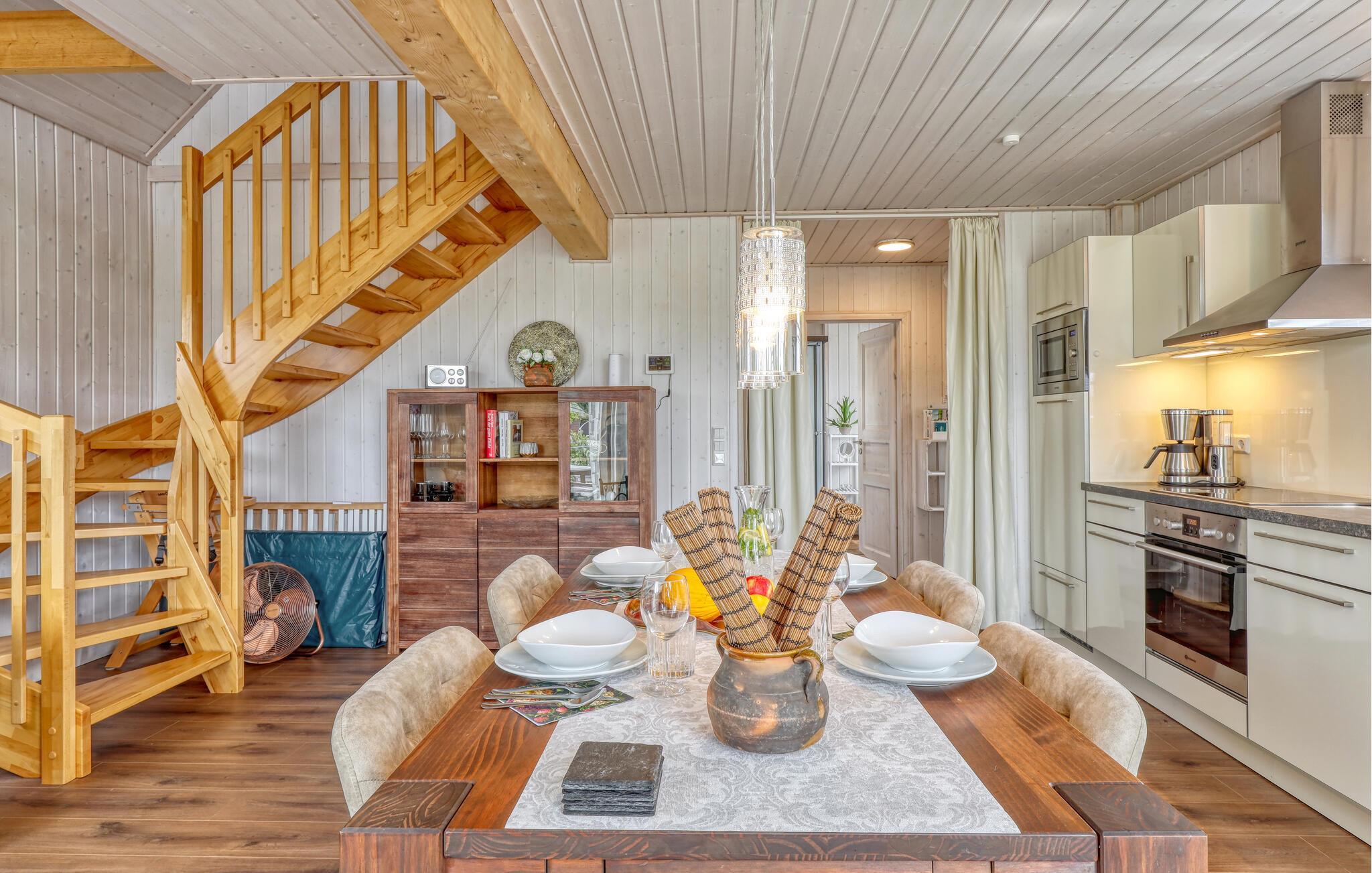 Bare noen få skritt fra naturen, tilbyr dette huset alt du trenger for en vellykket ferie med familien. Finn deg til rette i den koselige stuen. Den åpne planløsningen med lyst tretak, store vinduer og en vedovn skaper en koselig atmosfære når som helst på året. Bruk det store spisebordet til felles måltider, og lag dine favorittretter på det moderne kjøkkenet. Oppdag det sjarmerende lesehjørnet i øverste etasje, ideelt for rolige timer med utsikt over omgivelsene.