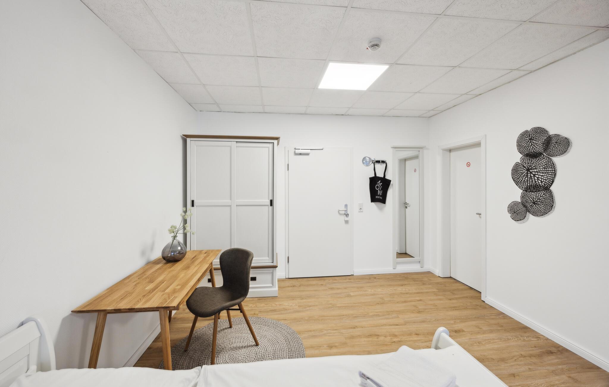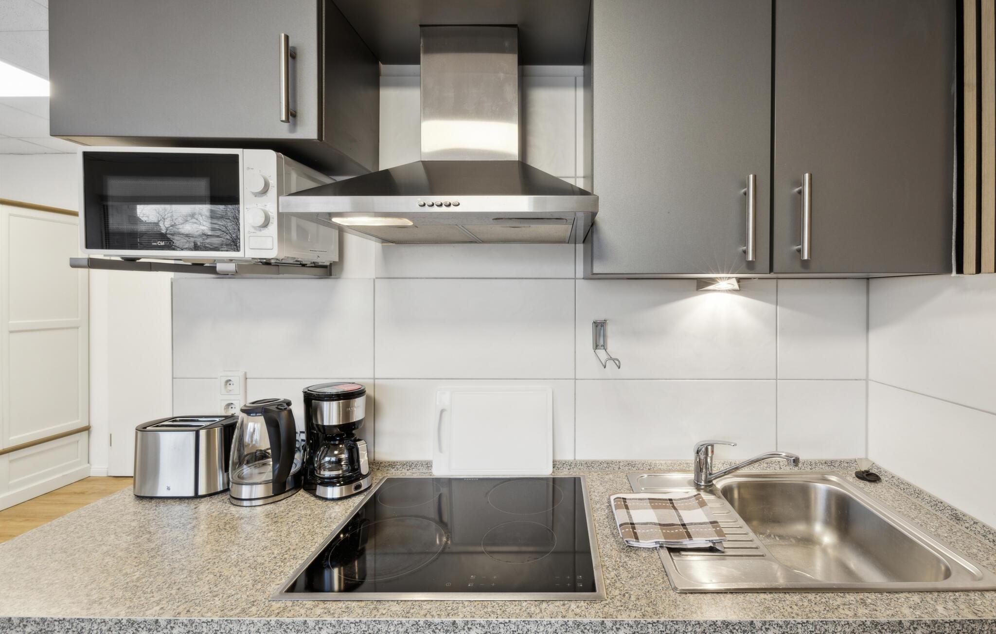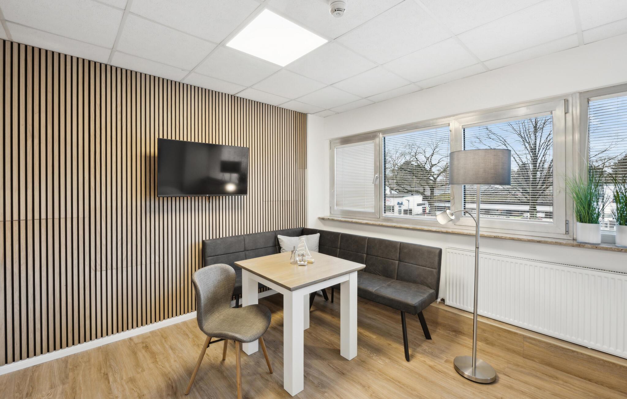 Den koselige sittegruppen innbyr til en kort pause innimellom. Kjøkkenkroken har rikelig med oppbevaringsplass og alt du trenger for å styrke deg med frokost og fersk kaffe før en begivenhetsrik dag i byen. De integrerte akustikkpanelene gir rommet en innbydende atmosfære.
