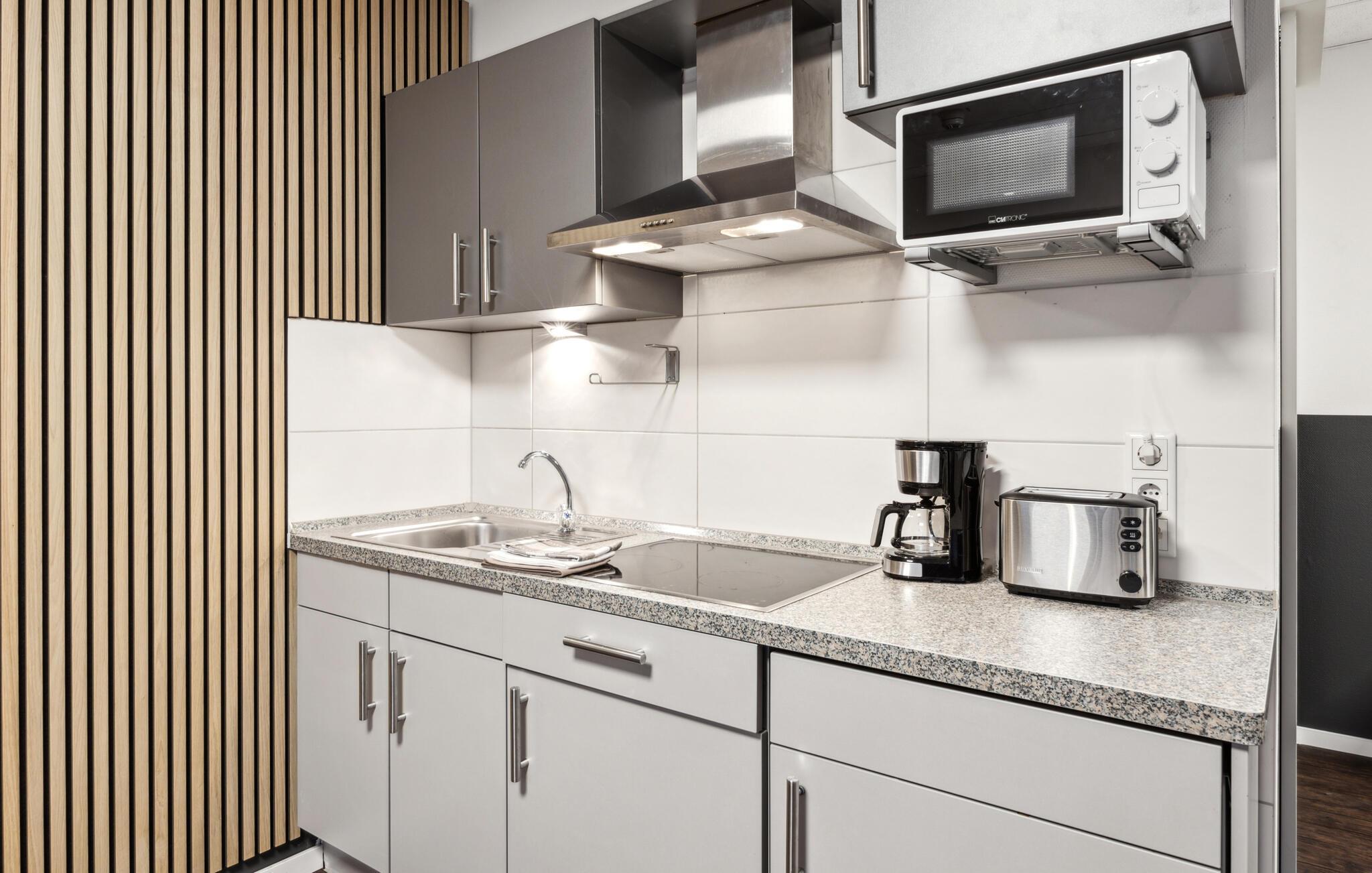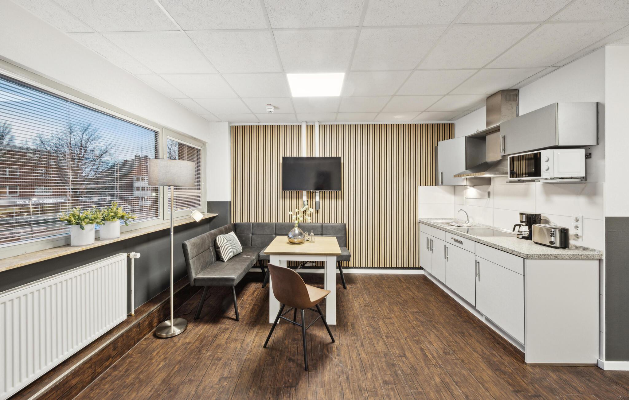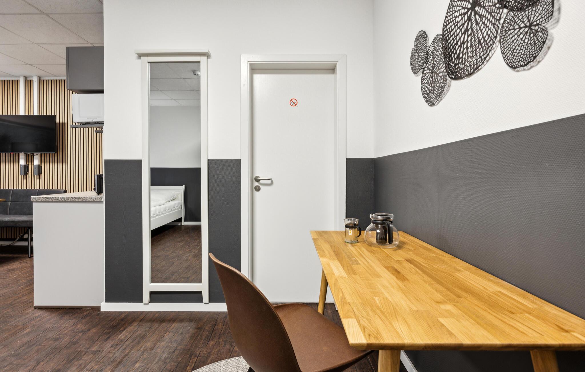 Den koselige sittegruppen innbyr til en kort pause innimellom. Kjøkkenkroken har rikelig med oppbevaringsplass og alt du trenger for å styrke deg med frokost og fersk kaffe før en begivenhetsrik dag i byen. De integrerte akustikkpanelene gir rommet en innbydende atmosfære.