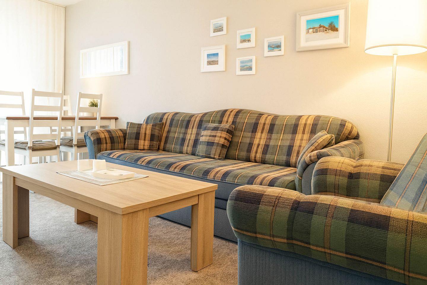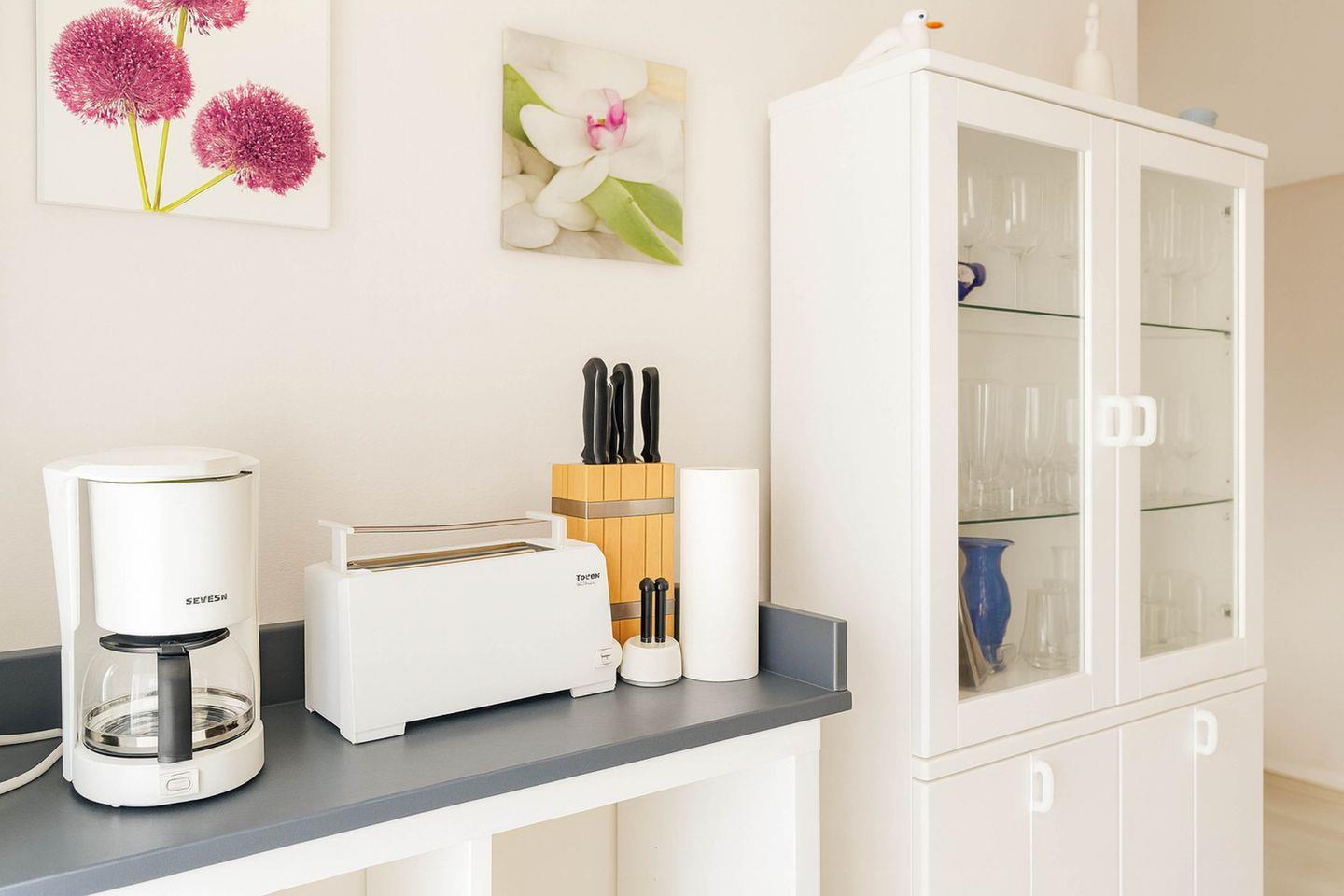 Durch einen separaten Eingang betreten Sie Ihr persönliches Urlaubsrefugium. Die offen gestaltete Küche mit Geschirrspülmaschine, Cerankochfeld, Mikrowelle, Toaster, Kaffeemaschine, Wasserkocher und Kühl-Gefrier-Kombination fügt sich harmonisch in den hellen Wohn- und Essbereich ein. Von hier aus gelangen Sie direkt auf den sonnigen Balkon, auf dem Sie schon beim ersten Schritt die frische Nordseebrise spüren und entspannt den Tag genießen können.