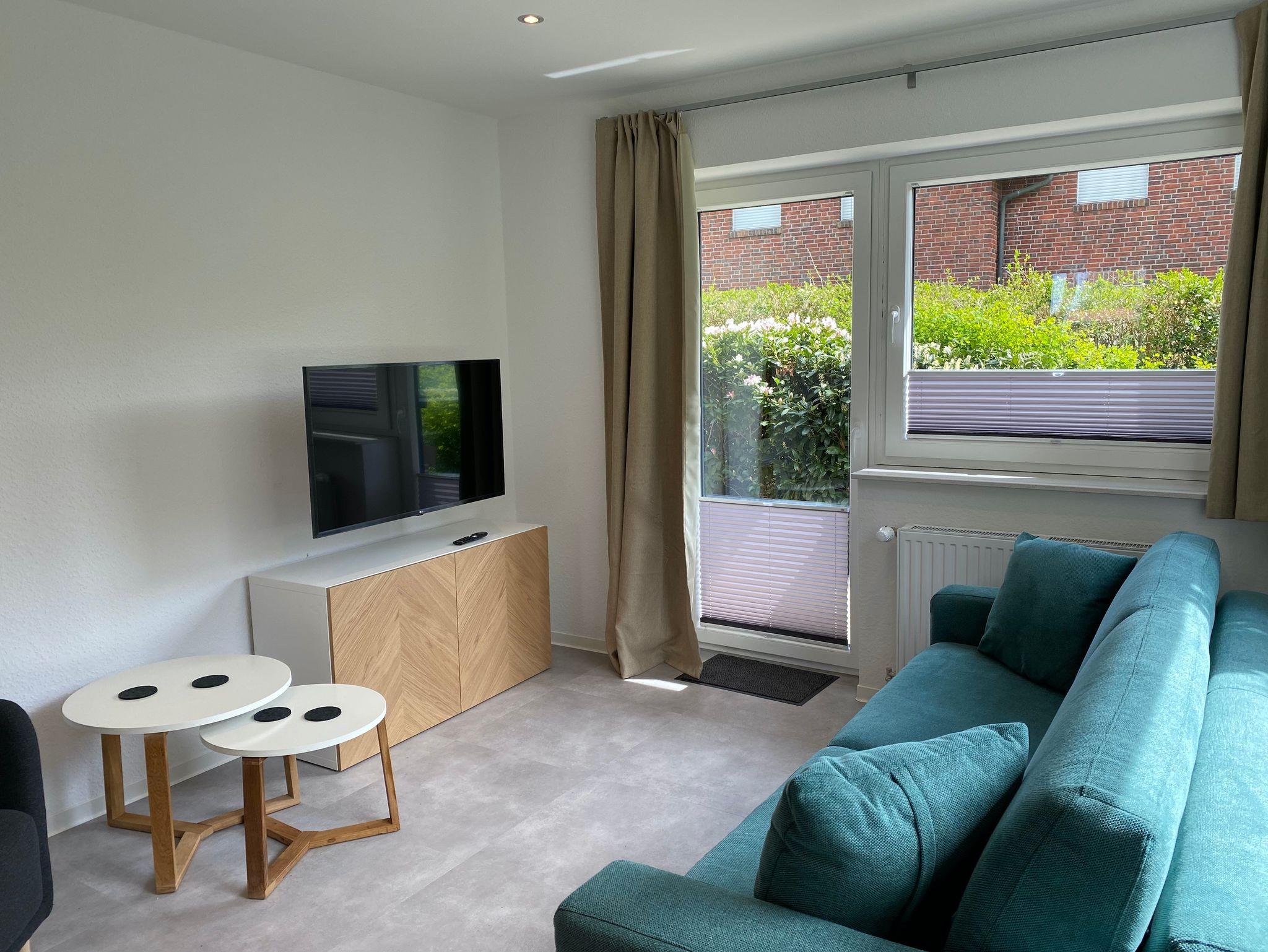 In unserer Ferienanlage Seeschwalbe in Schillig befindet sich die etwa 45 qm große Ferienwohnung im Erdgeschoss. Es gibt ein Wohnzimmer mit einem hochwertigen Schlafsofa (Liegefläche 1,60 x 2,0m), Esstisch, einem gemütlichen Sessel, Küchenzeile (mit Backofen, Spülmaschine, Toaster, Senseo Kaffeepadmaschine + Filterkaffeemaschine, Wasserkocher), ein Schlafzimmer mit Doppelbett (1,80x2m) und ein Duschbad mit WC. Die Wohnung hat eine eigene Terrasse mit Tisch und Stühlen.