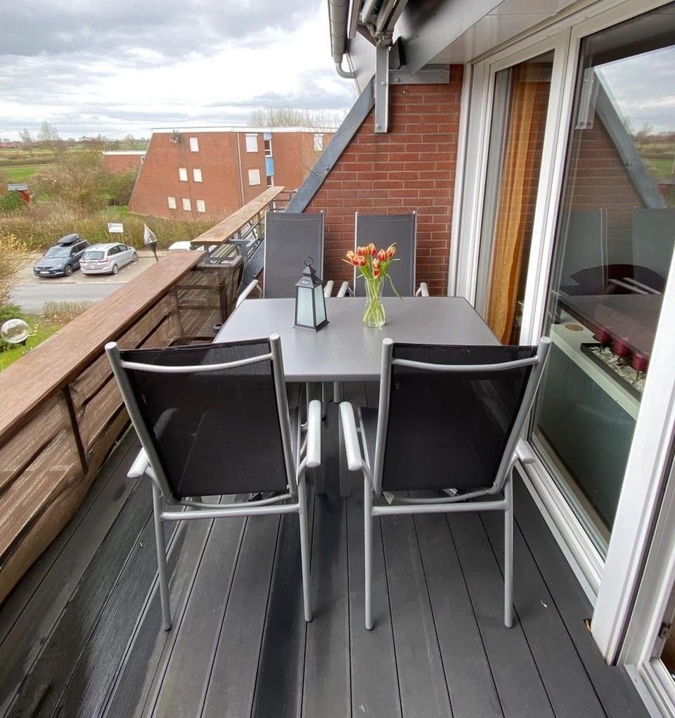 Diese helle und freundliche Ferienwohnung lädt zum Verweilen ein. Mit Sitzmöglichkeiten auf dem Südbalkon, bietet sich dieser, perfekt für das Frühstück am Morgen oder dem Glas Wein am Abend an. Die neue Küche ist komplett eingerichtet und ist mit Spülmaschine, Backofen, Mikrowelle, Kühlschrank mit Gefrierfach, Kaffeemaschine, Küchenmaschine, Wasserkochen und Eierkocher etc. ausgestattet. Das Wohnzimmer ist mit einer Eckcouch, Tisch und einer hellen, modernen Wohnwand ausgestattet. Sateliten-TV, DVD-Player und HiFi-Anlage sind vorhanden. Es sind 2 Schlafzimmer vorhanden. Elternschlafzimmer mit Doppelbett, Nachtschränke, Kleiderschrank, Fernseher, Spiegel, Kleiderständer und Sessel. Das zweite Schlafzimmer hat ein Einzelbett und eine separate Schlafcouch, Schreibtisch, Nachtschrank und Kleiderschrank. In der gesamten Wohnung ist pflegeleichtes Laminat verlegt. Vom Schlafzimmerfenster haben Sie einen herrlichen Fernblick bis zum Jade-Weser-Port Wilhelmshaven.