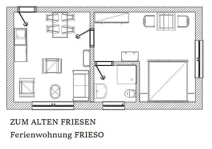 Herzlich willkommen in der gemütlichen Fewo FRIESO in Wangerland. Unser Ferienhaus "Zum alten Friesen" befindet sich naturnah vor den Toren Hooksiels. In dieser Fewo finden Sie einen Wohnraum mit Küche, 1 Dusch-Bad und ein Schlafzimmer mit Doppelbett.