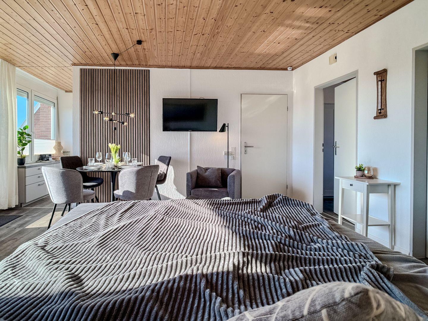 Das großzügige Wohnzimmer lädt zum Entspannen ein. Ein hochwertiges Boxspringbett bietet eine perfekte Rückzugsmöglichkeit zum Relaxen ( keine zusätzliche Schlafmöglichkeit), während ein gemütlicher Sessel zusätzlichen Komfort bietet.
