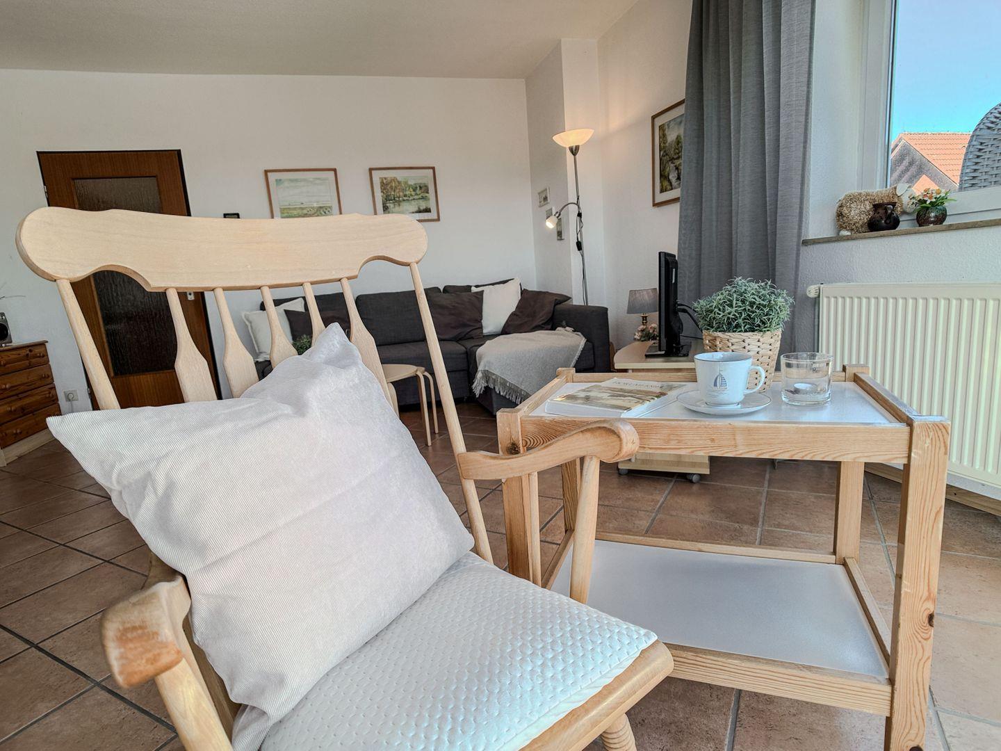 Das lichtdurchflutete Wohnzimmer ist das Herzstück der Wohnung. Durch die große Fensterfront fällt sanftes Tageslicht herein und taucht den Raum in eine warme, freundliche Atmosphäre. Machen Sie es sich auf dem Schaukelstuhl bequem, genießen Sie eine Tasse Tee oder lehnen Sie sich entspannt zurück und lassen Ihren Blick ins Grüne schweifen. Abends lädt das gemütliche Schlafsofa zum Fernsehen ein – und wird in der Nacht zu einer bequemen Schlafmöglichkeit für weitere Gäste.