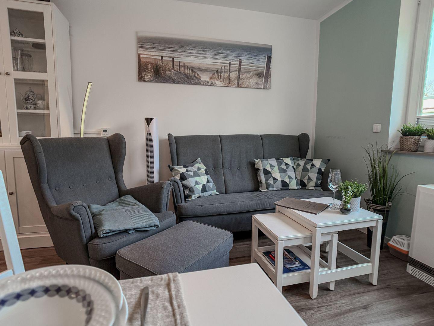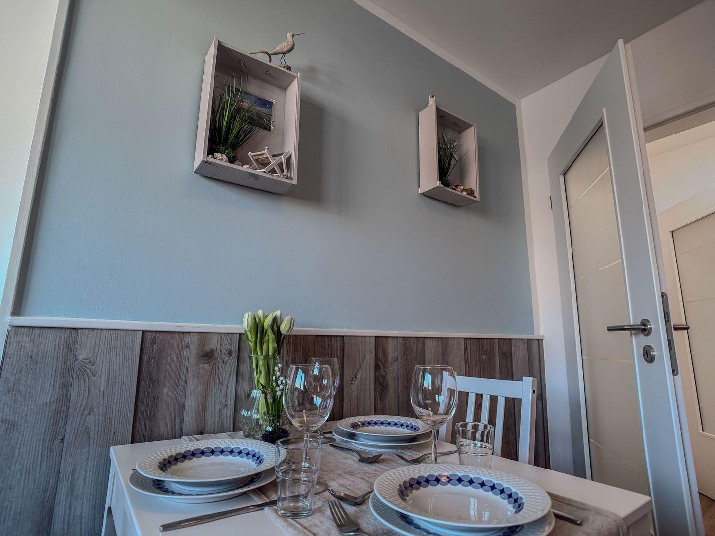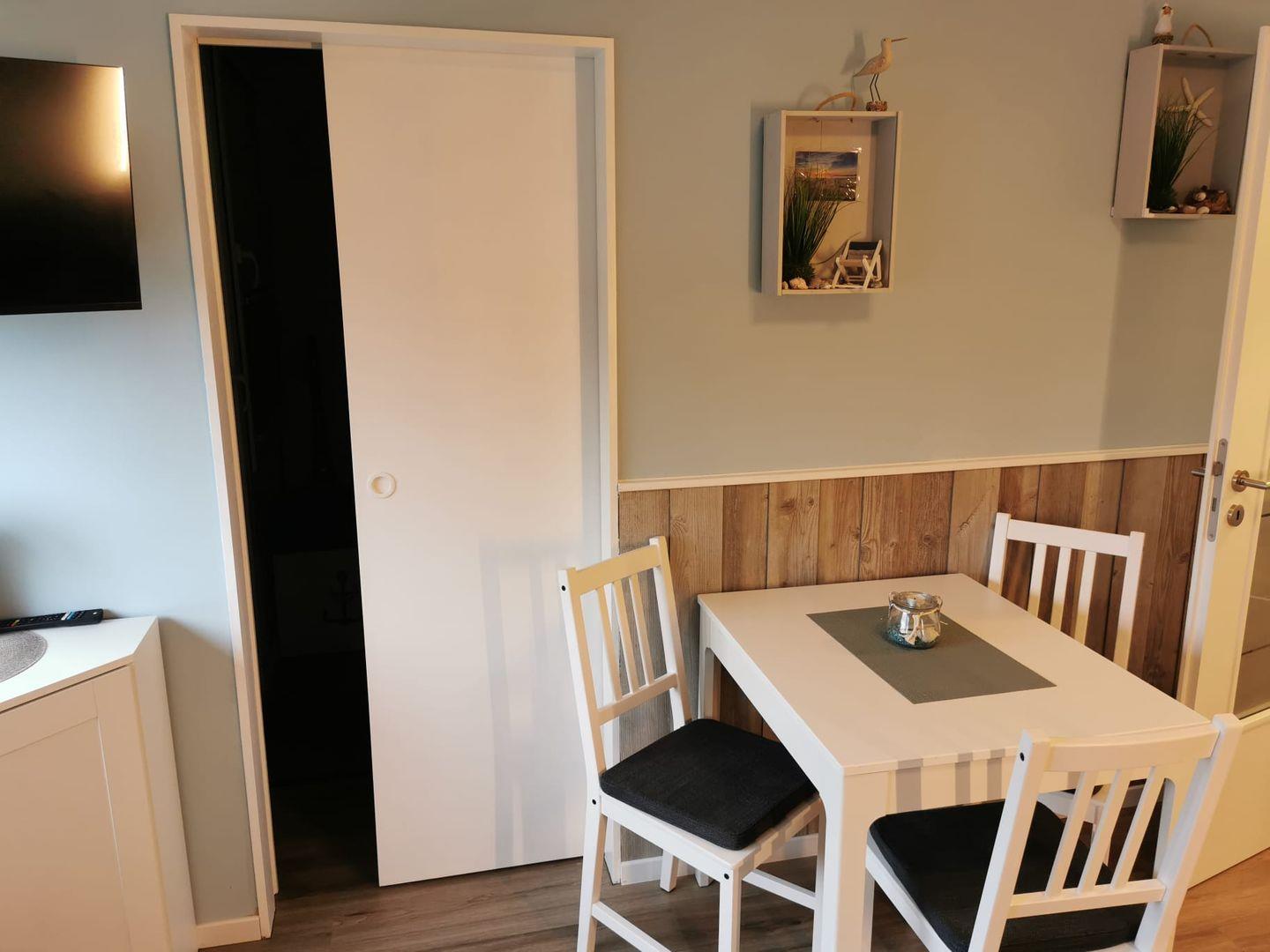 Die kleine, bestens ausgestattete Kochnische ermöglicht unkompliziertes Kochen, und die separate Essgruppe lädt zu gemeinsamen Mahlzeiten und fröhlichen Momenten ein.