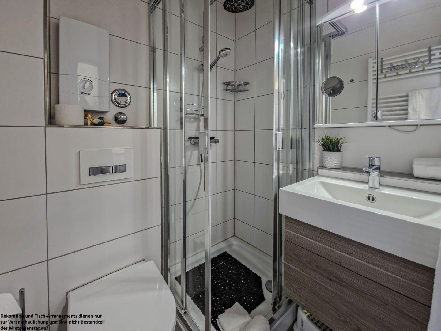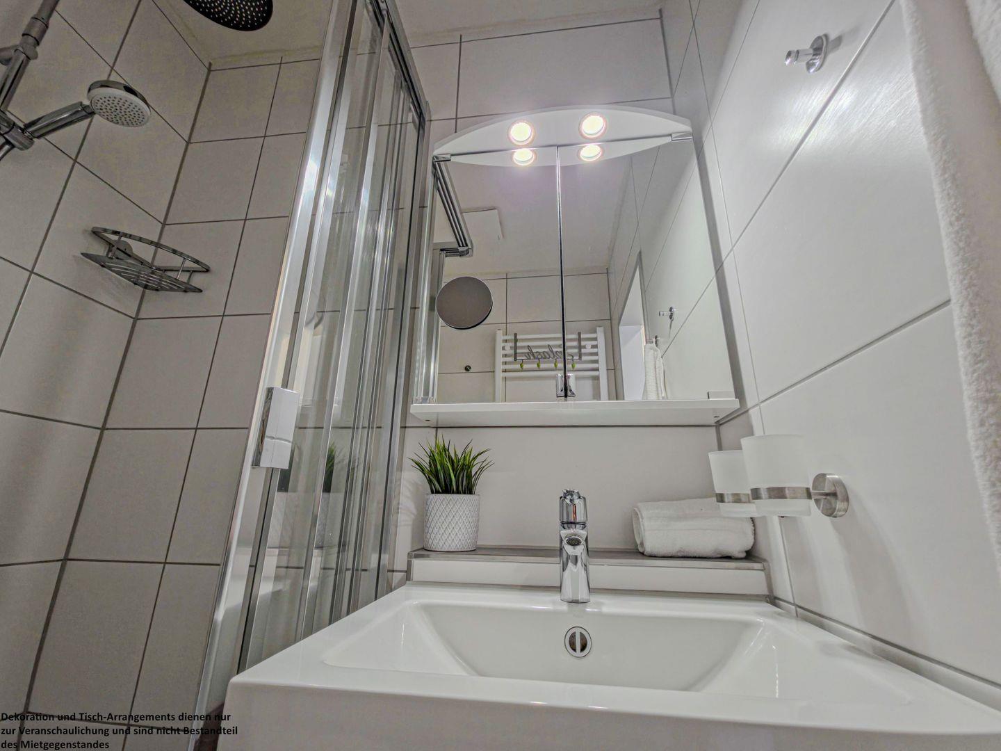 Das helle und moderne Badezimmer bietet alles für Ihre morgendliche Hygiene.