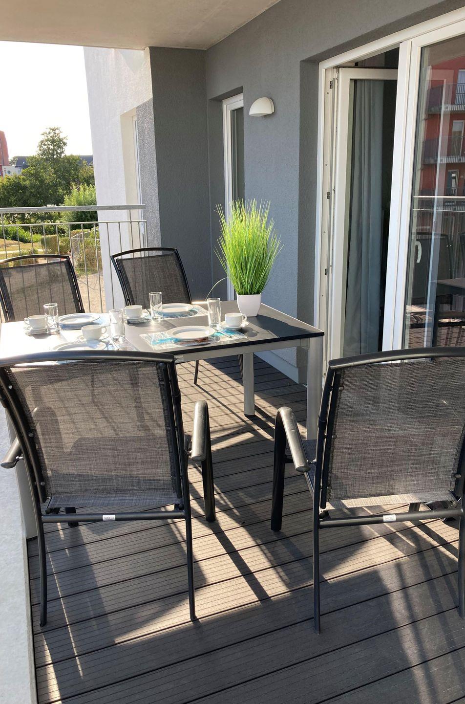Euer Balkon bietet nicht nur den Blick über die Anlage, sondern auch einen eigenen Strandkorb. Lasst die Seele baumeln und genießt die Nordseeluft. Ein Bollerwagen steht bereit für Eure Ausflüge mit den Kleinen. Erkundet die Umgebung spielend leicht und ohne lästiges Schleppen.