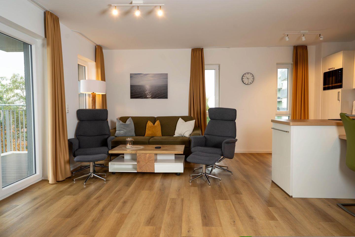 Im großzügigen Wohnbereich mit bequemer Sofaecke könnt Ihr die Seele baumeln lassen. Ob Filmabend, Lesestunde oder geselliges Beisammensein – hier ist der richtige Platz. Der direkte Zugang zum überdachten Balkon eröffnet Euch dabei den schönsten Blick ins Grüne und lässt viel Tageslicht herein.