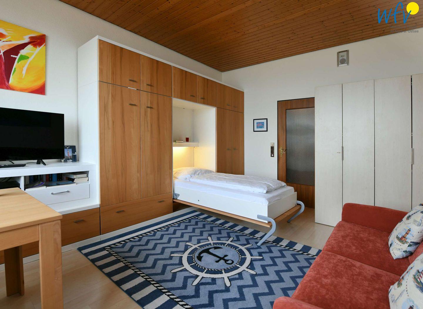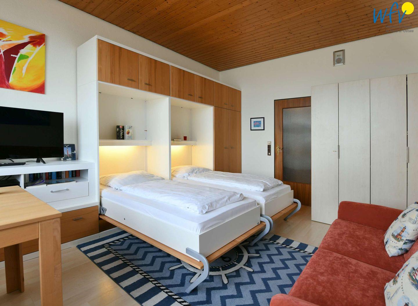 Schlafmöglichkeiten befinden sich im Wohnraum durch zwei einzelne Schrankbetten (jeweils 88 x 200 cm).
